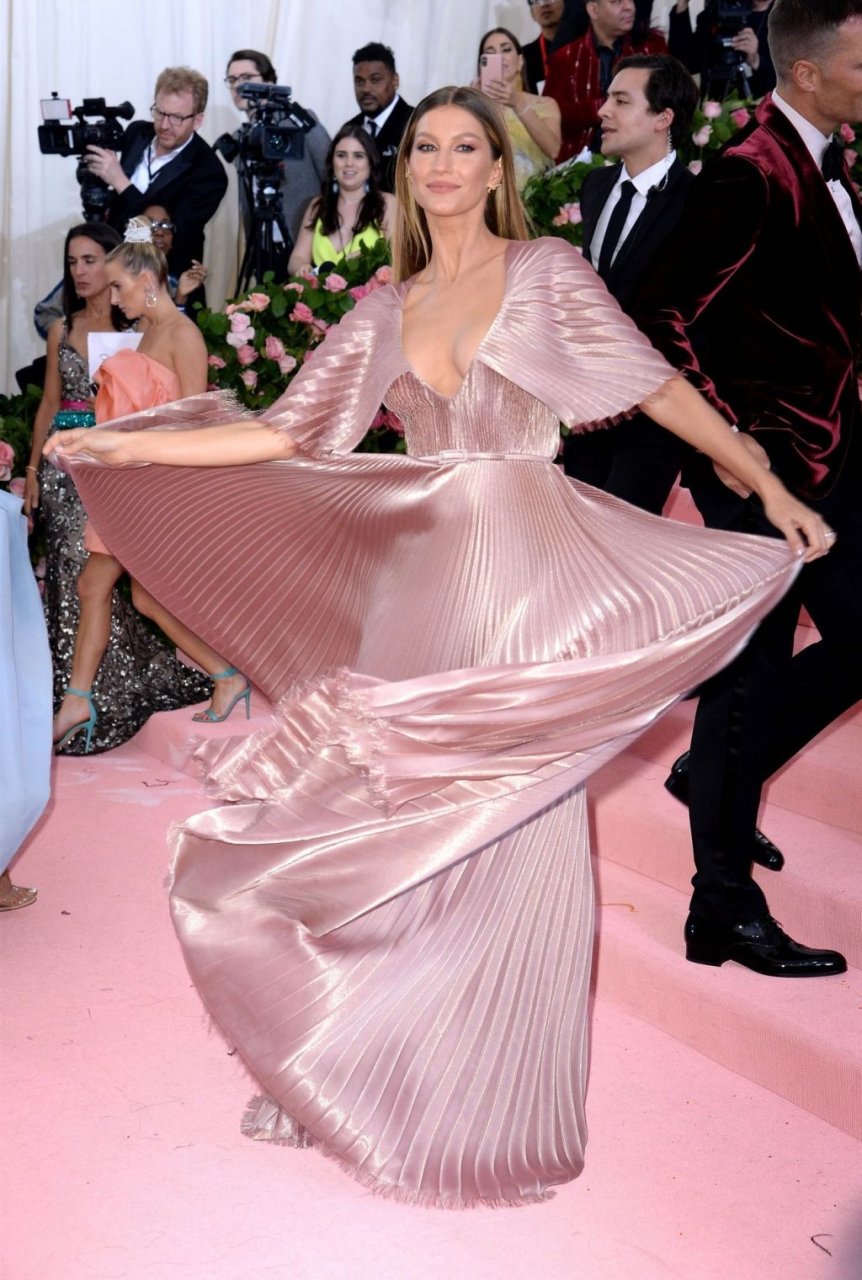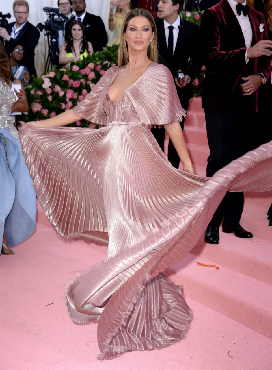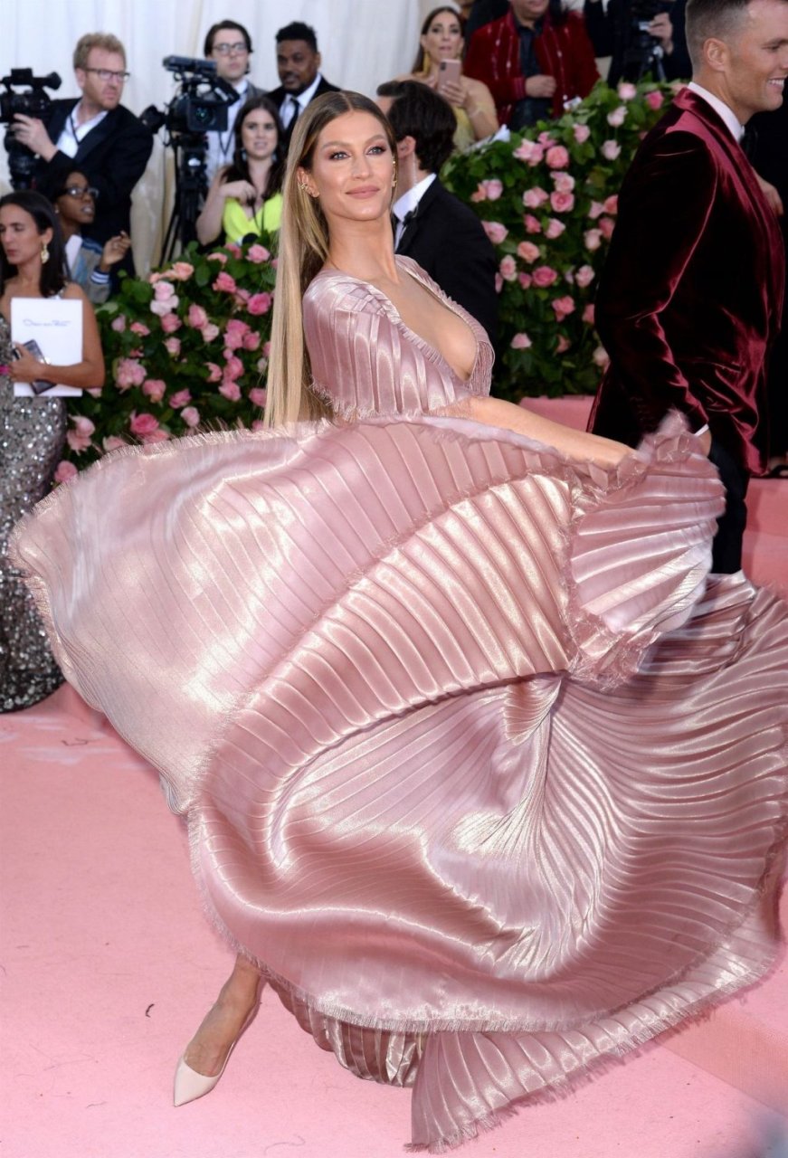 La supermodelo brasileña Gisele Bündchen mostró su escote con un hermoso vestido rosa en la Gala MET 2019 en Nueva York, 06/05/2019. Apareció en la alfombra rosa con su esposo, el futbolista Tom Brady.