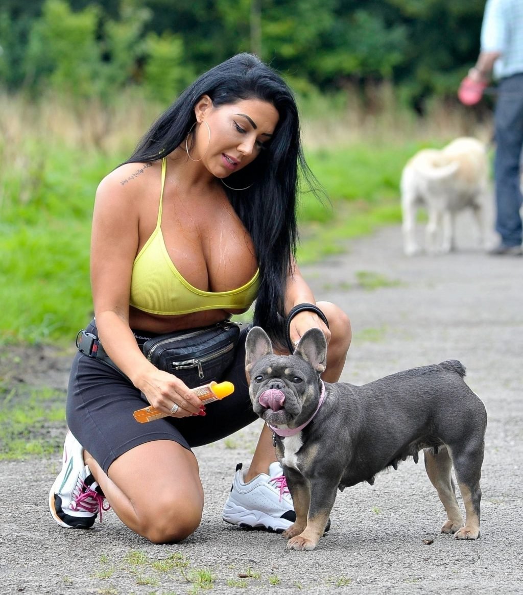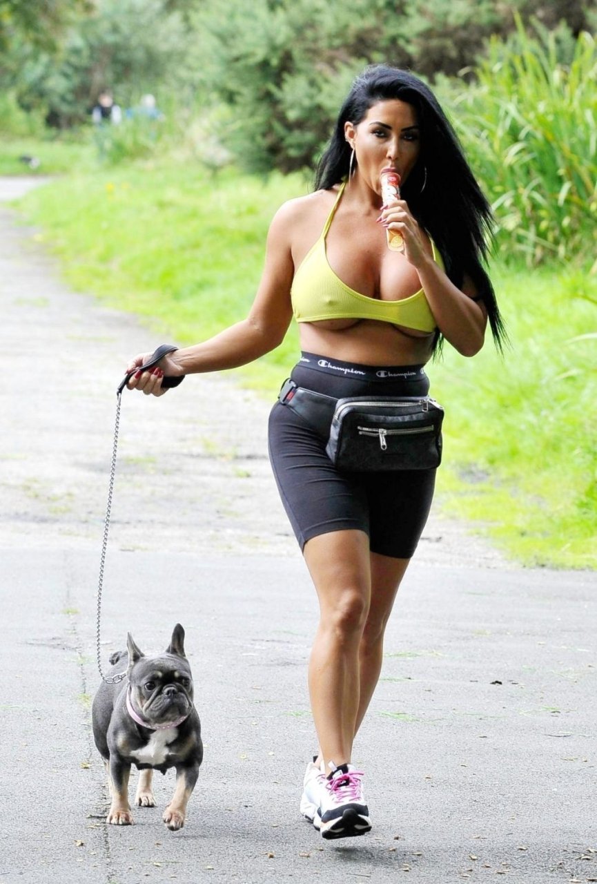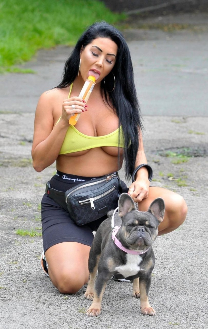 La modelo de glamour Grace J Teal fue vista en el parque paseando a su perro Blue, mientras muestra un escote muy pronunciado y tiene un accidente con un helado Calippo en Manchester, 24/08/2019.