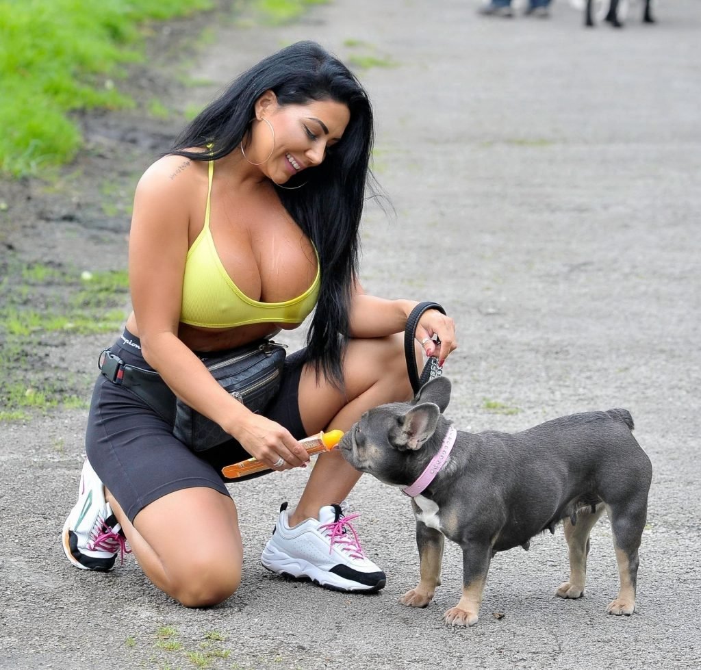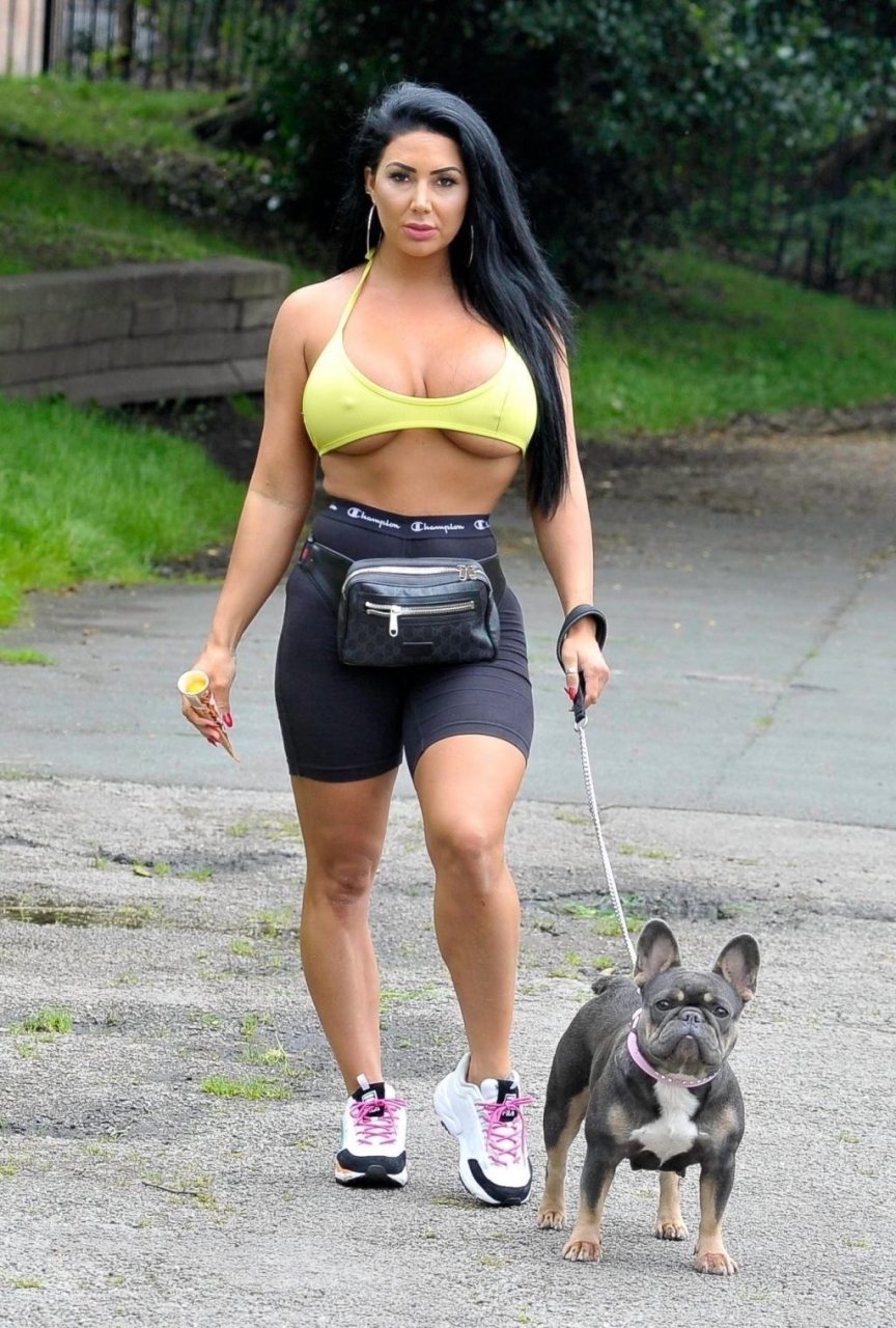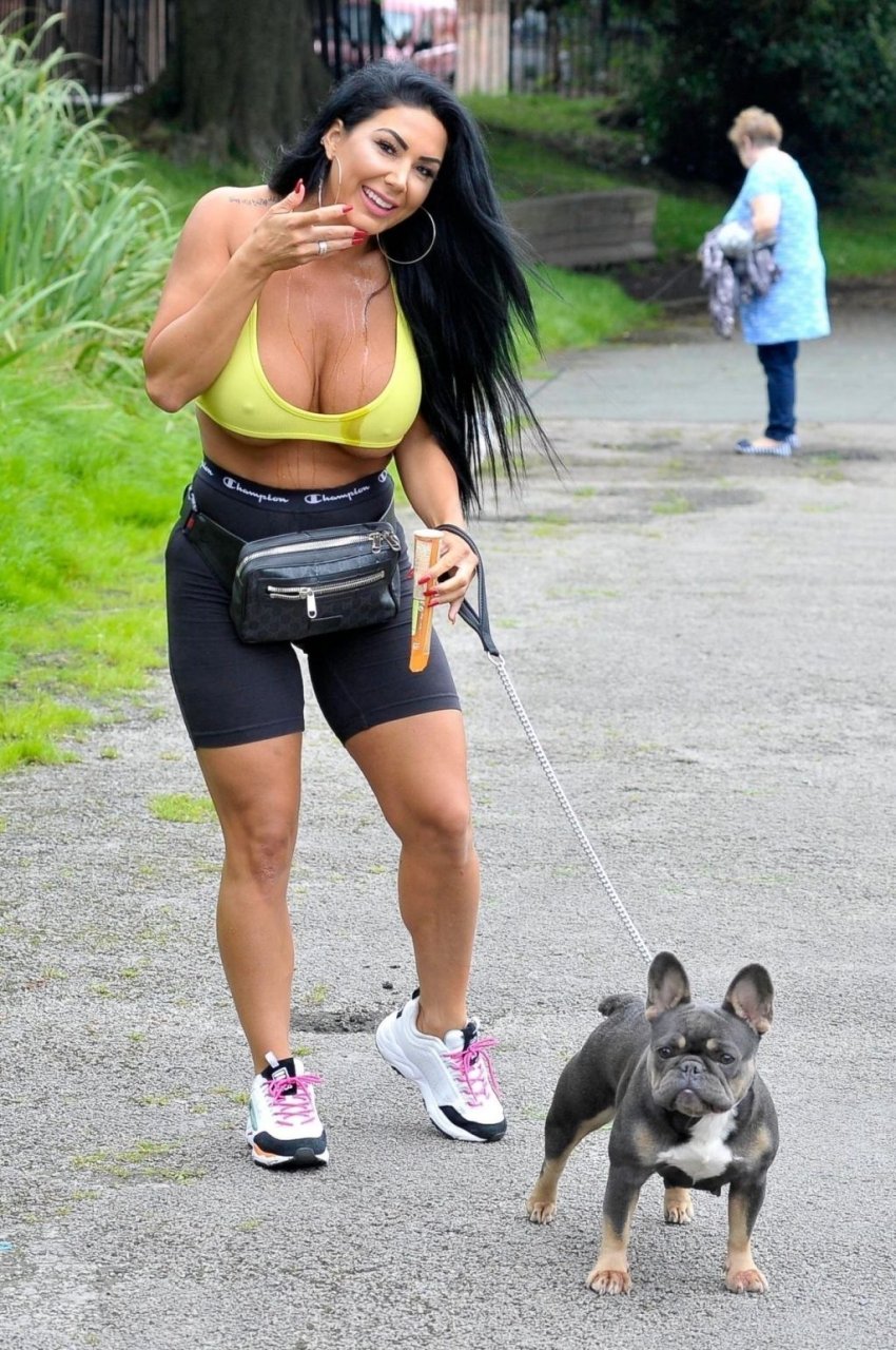 La modelo de glamour Grace J Teal fue vista en el parque paseando a su perro Blue, mientras muestra un escote muy pronunciado y tiene un accidente con un helado Calippo en Manchester, 24/08/2019.