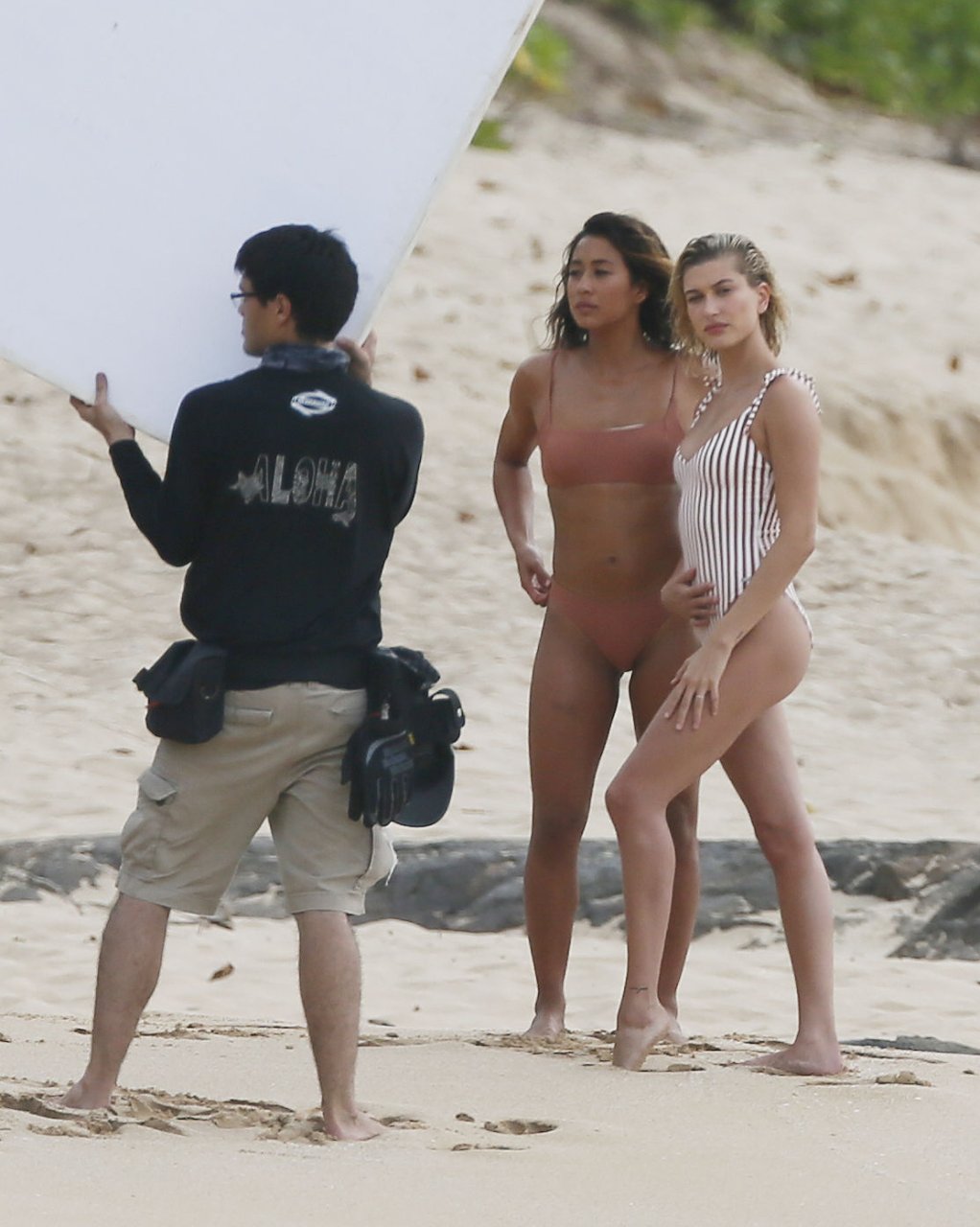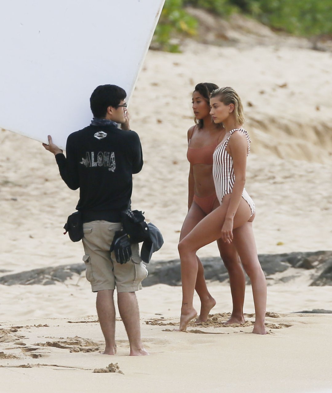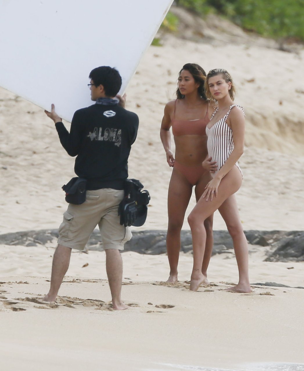 Hailey Baldwin deslumbra en la playa en Hawái, 31/05/2018. La modelo de moda de 21 años pasó de un bikini de una pieza a rayas a un traje de baño de dos piezas y estuvo acompañada por otra modelo en algunas partes de la sesión.