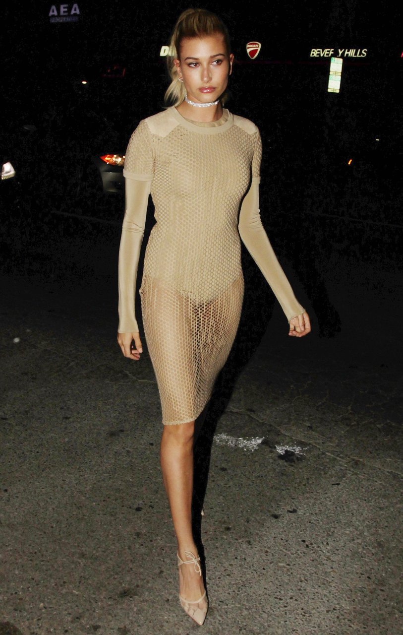 Hailey Baldwin lleva un vestido de malla transparente en el 21º cumpleaños de Gigi Hadid en el Nice Guy Club en West Hollywood, 28/04/2016. Hailey Baldwin es una modelo de moda de Tucson. Edad: 20 (nacida el 22 de noviembre de 1996).