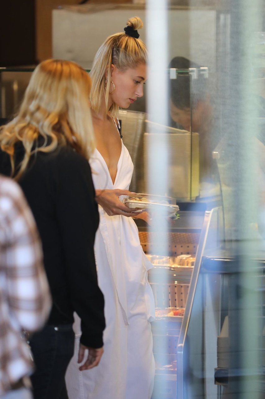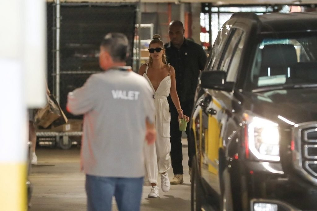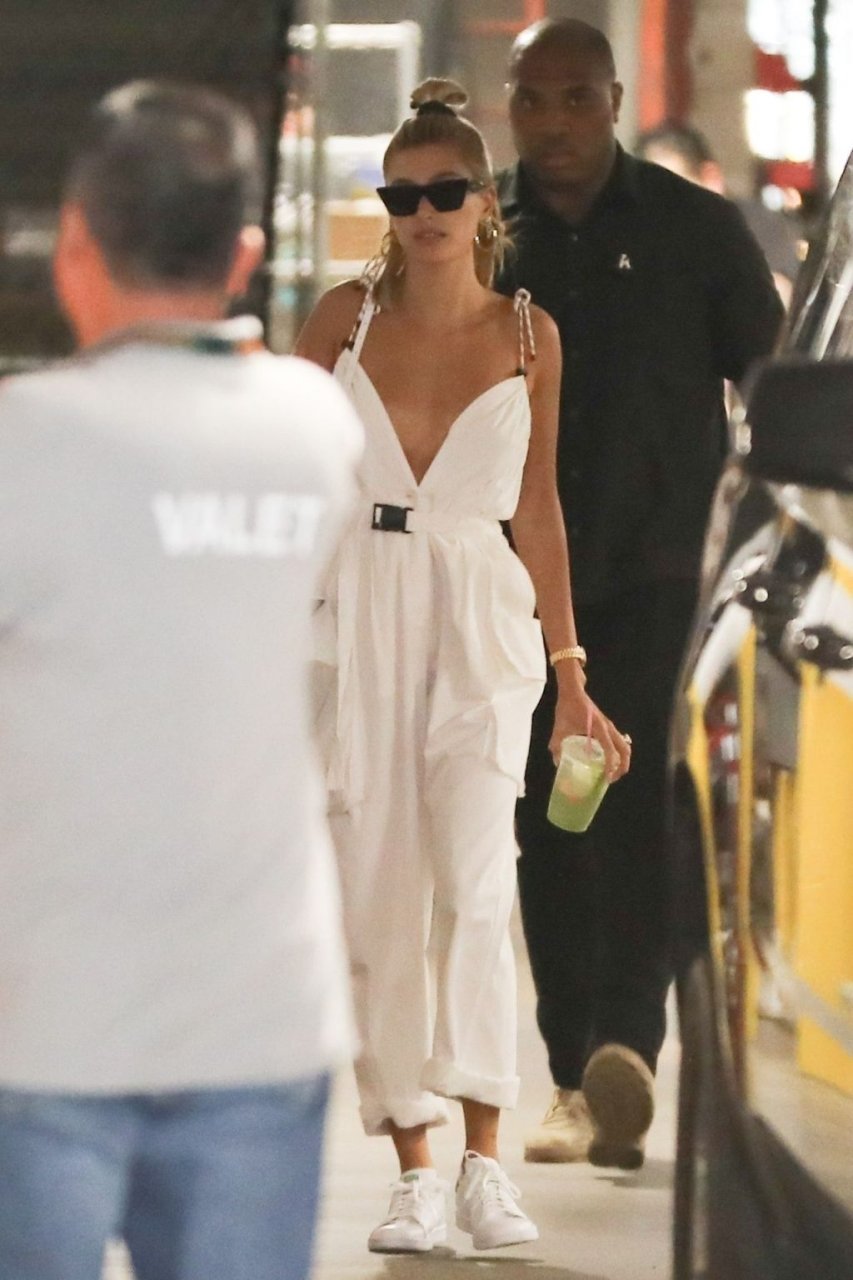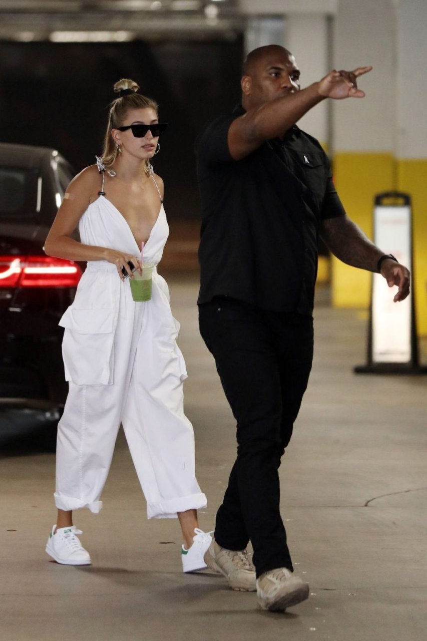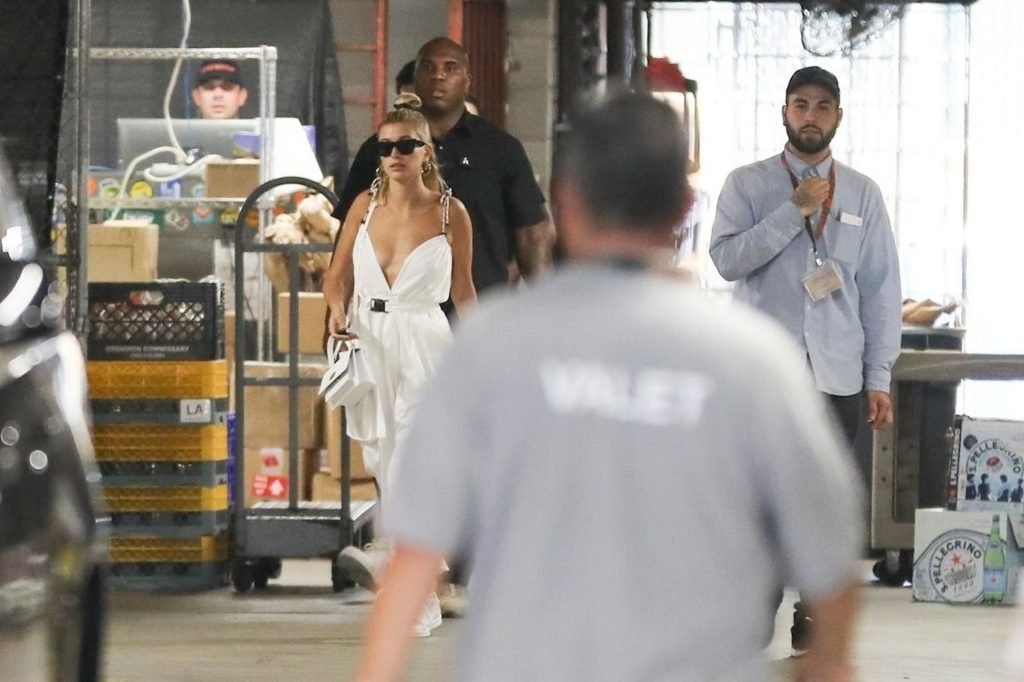 Hailey Bieber va de compras con su seguridad en el mercado Erewhon en Beverly Hills con un conjunto blanco que deja ver el escote, 12/06/2019.