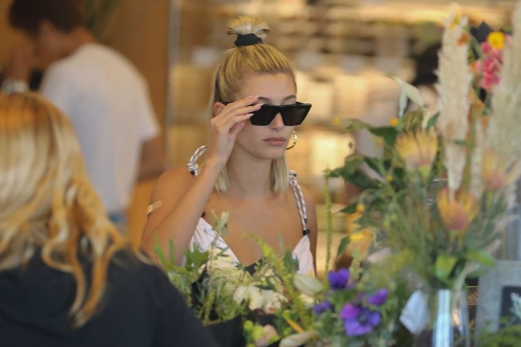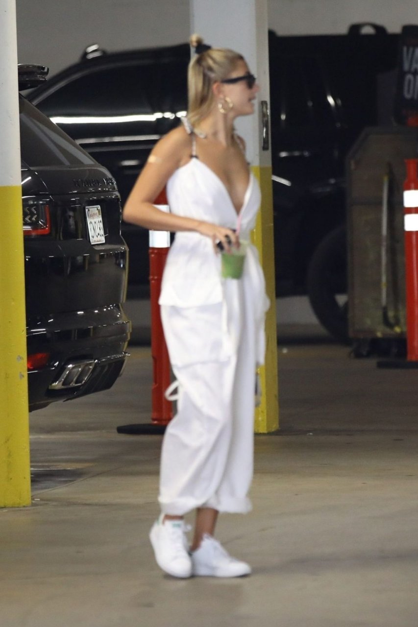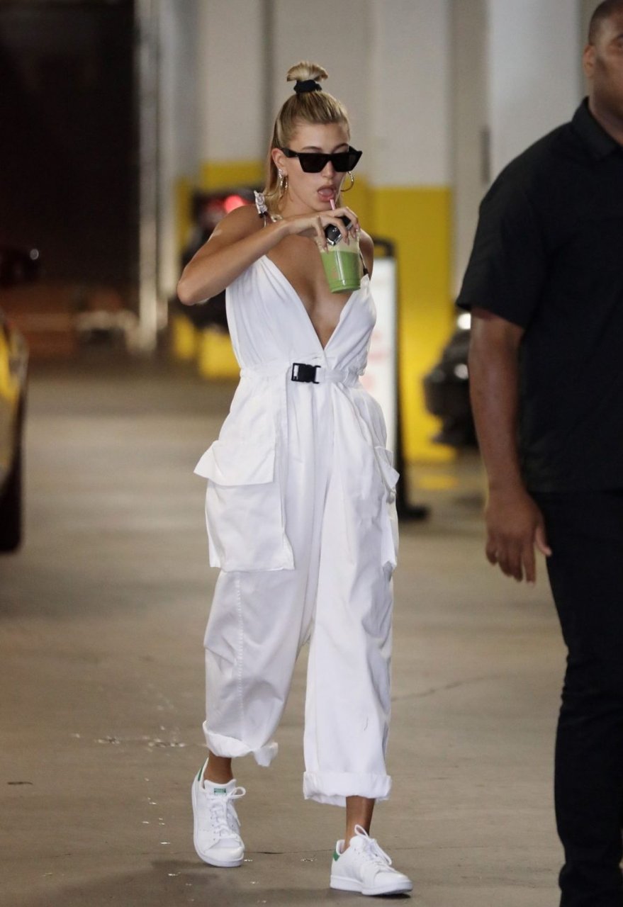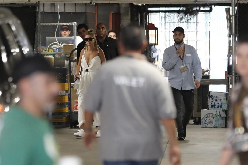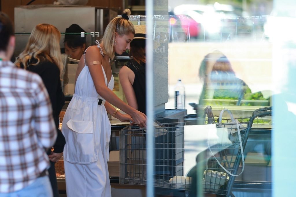 Hailey Bieber va de compras con su seguridad en el mercado Erewhon en Beverly Hills con un conjunto blanco que deja ver el escote, 12/06/2019.