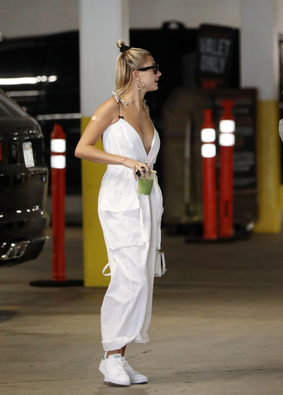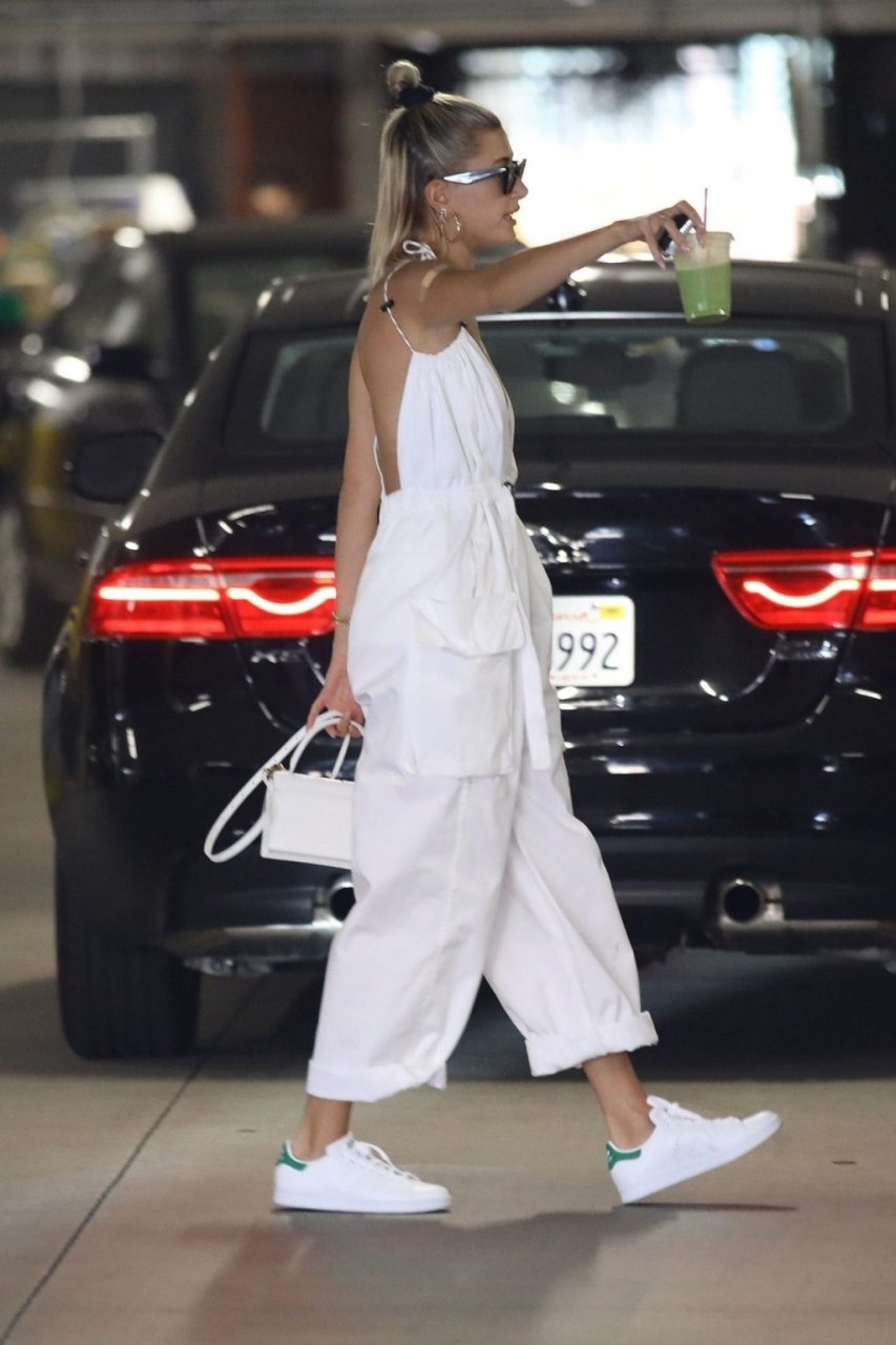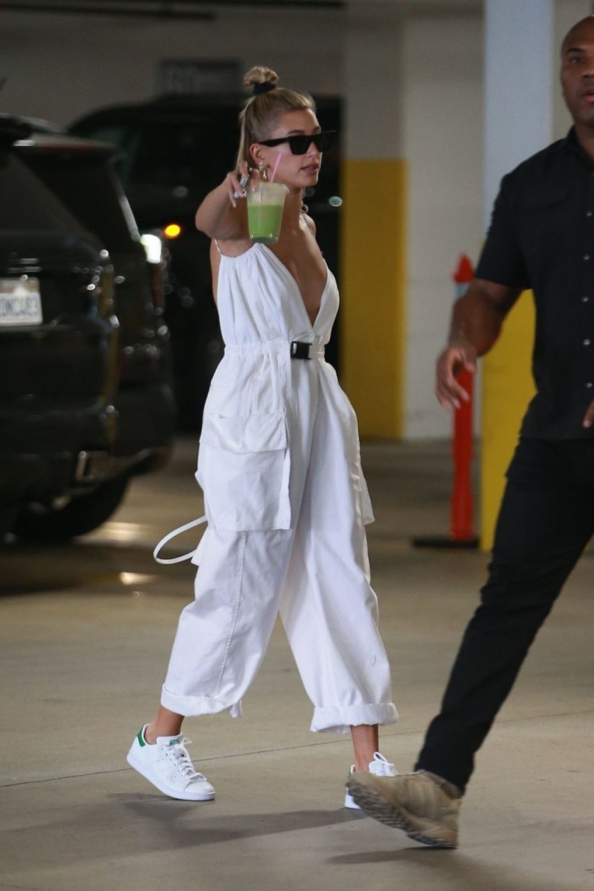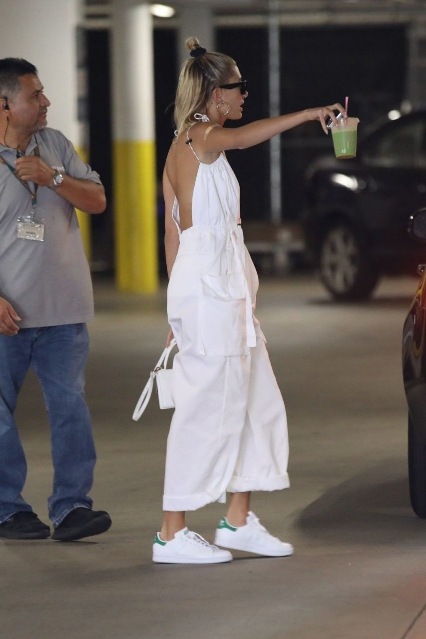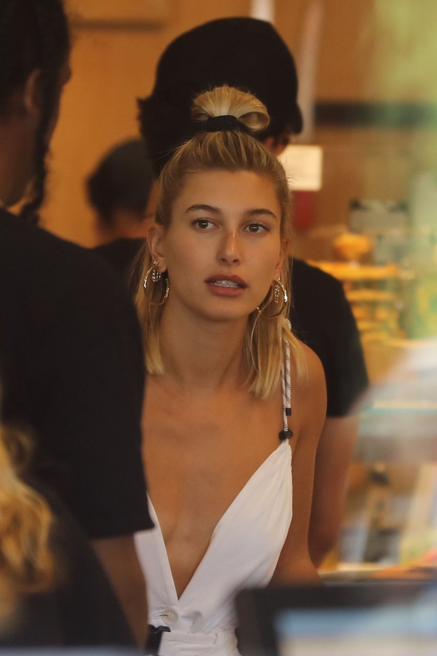 Hailey Bieber va de compras con su seguridad en el mercado Erewhon en Beverly Hills con un conjunto blanco que deja ver el escote, 12/06/2019.