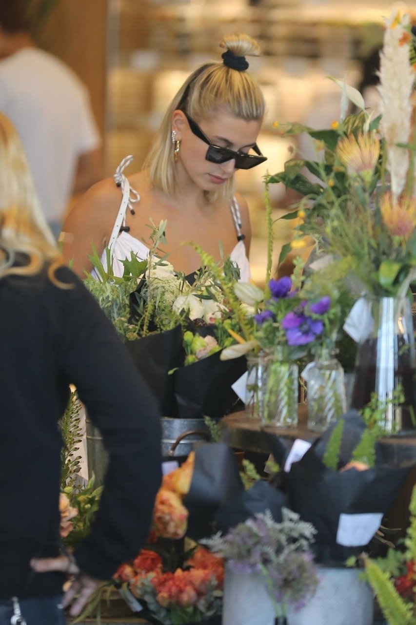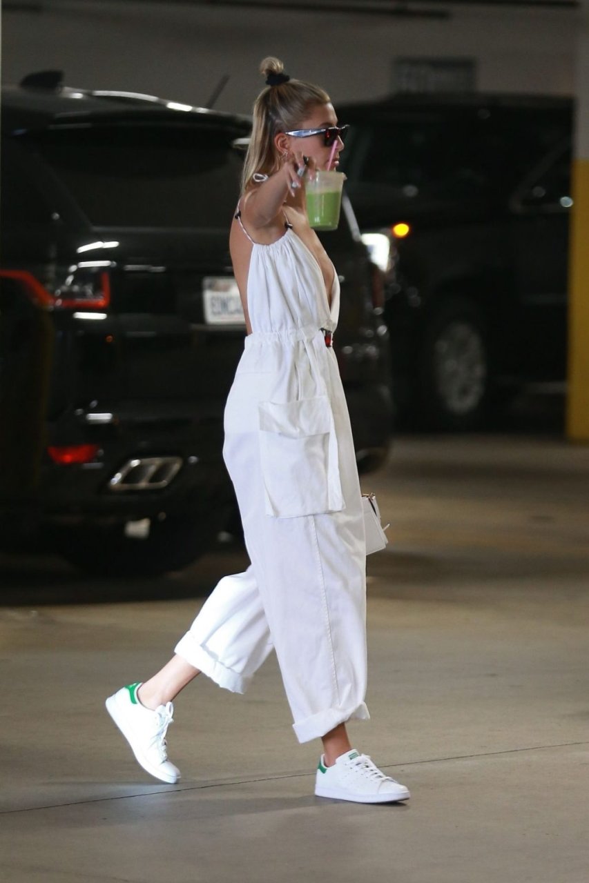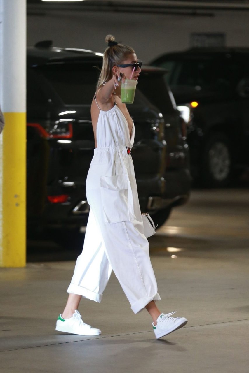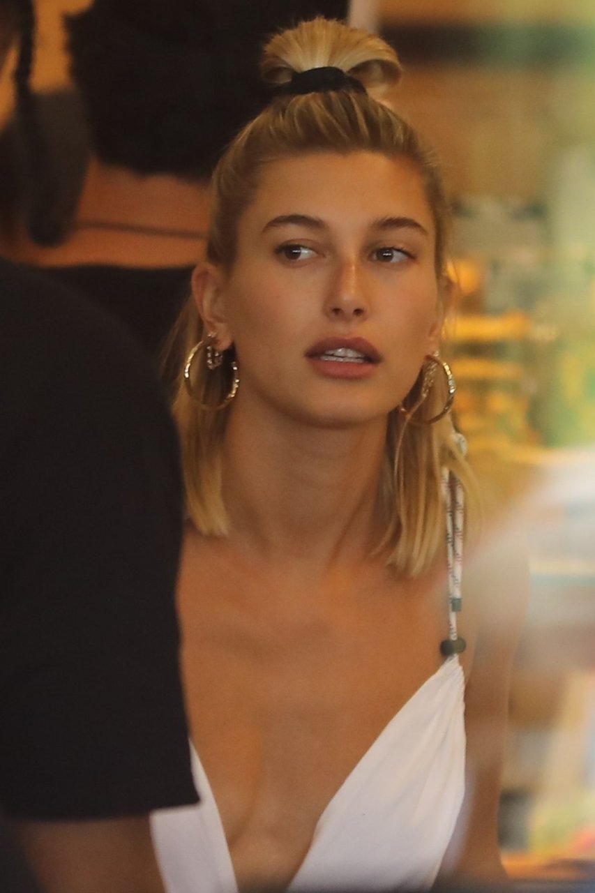 Hailey Bieber va de compras con su seguridad en el mercado Erewhon en Beverly Hills con un conjunto blanco que deja ver el escote, 12/06/2019.