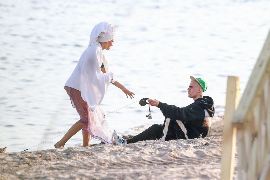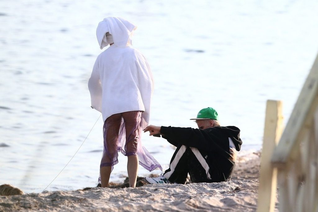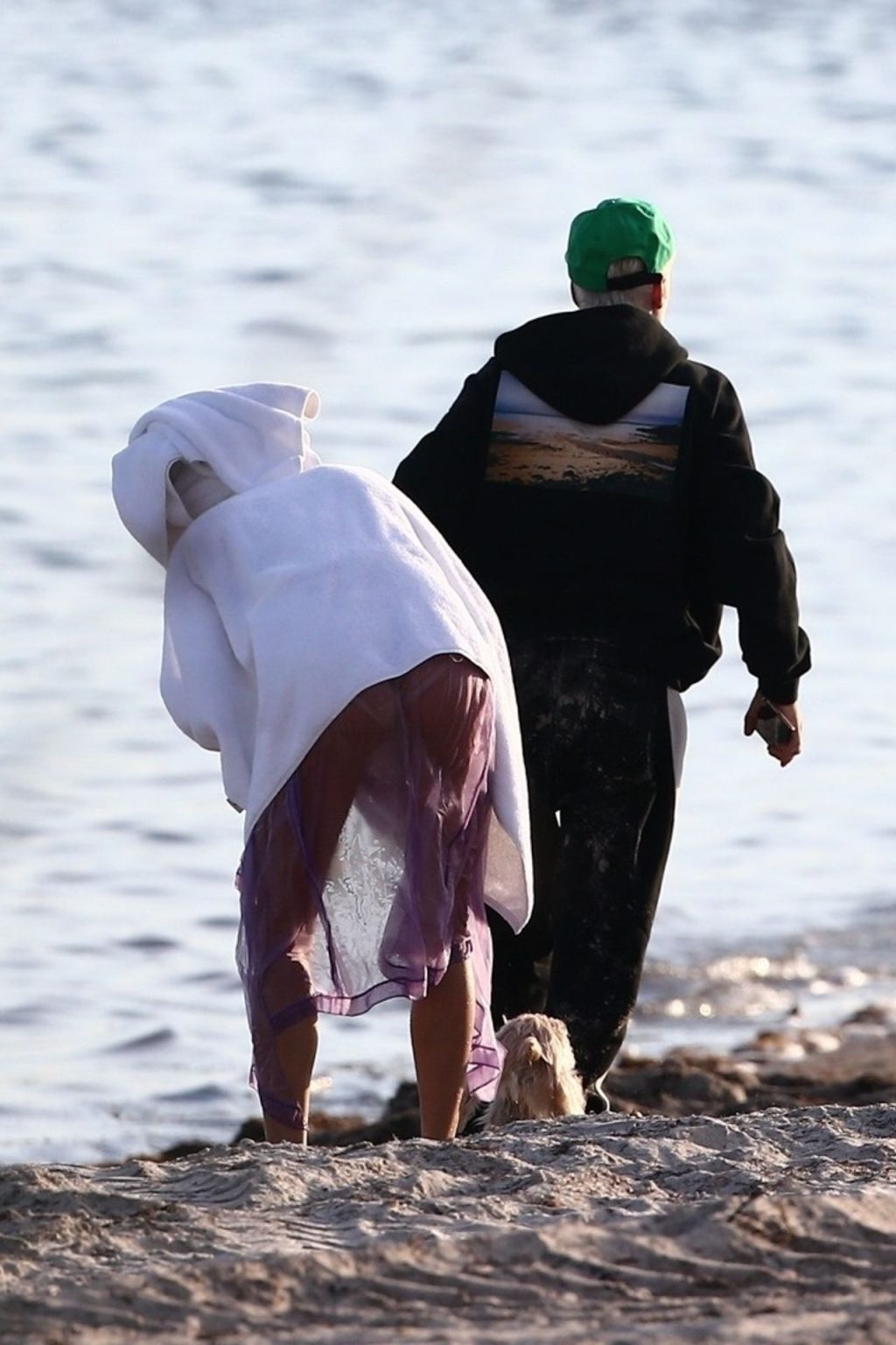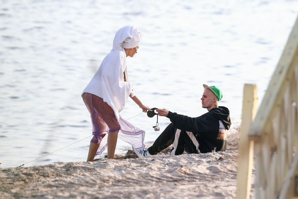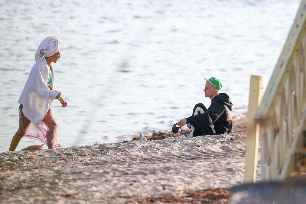 Justin Bieber visita a su esposa Hailey Bieber en Miami mientras la supermodelo se ocupa durante una sesión de fotos junto a la playa, 27/11/2019.