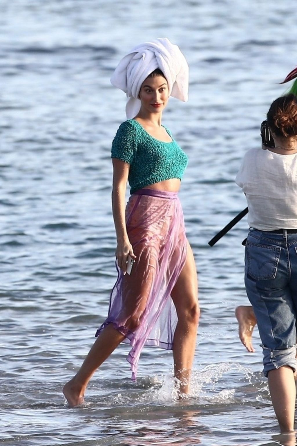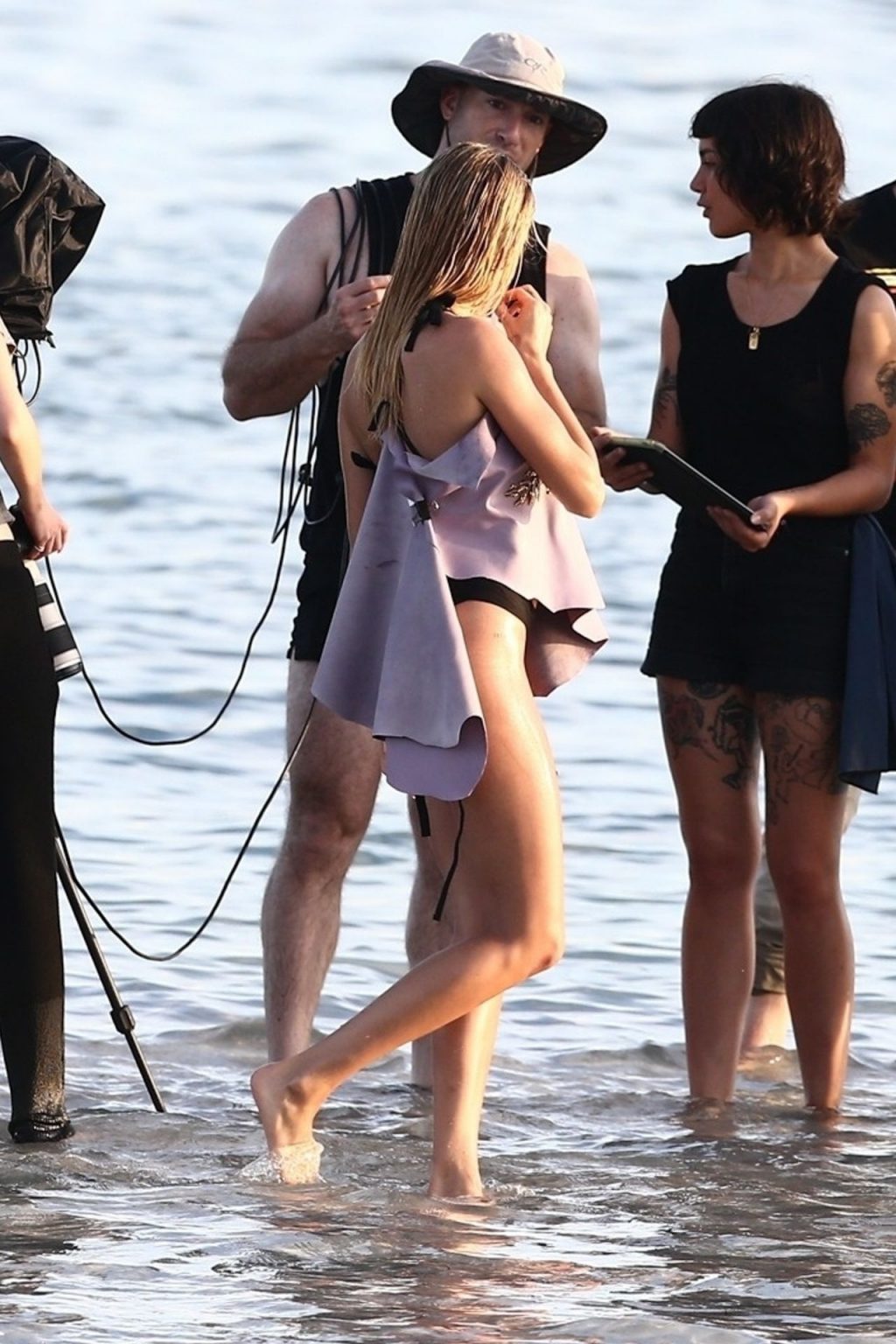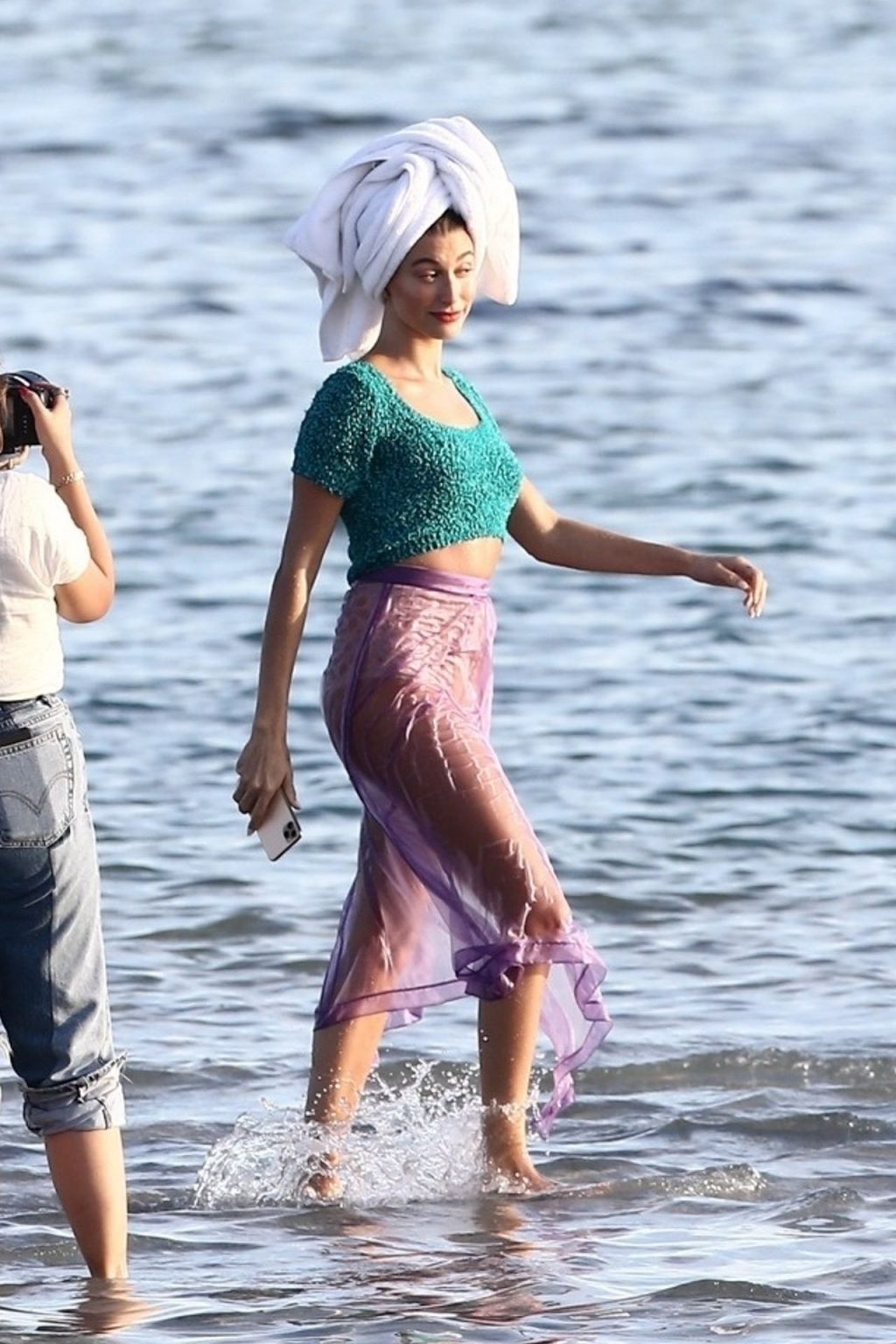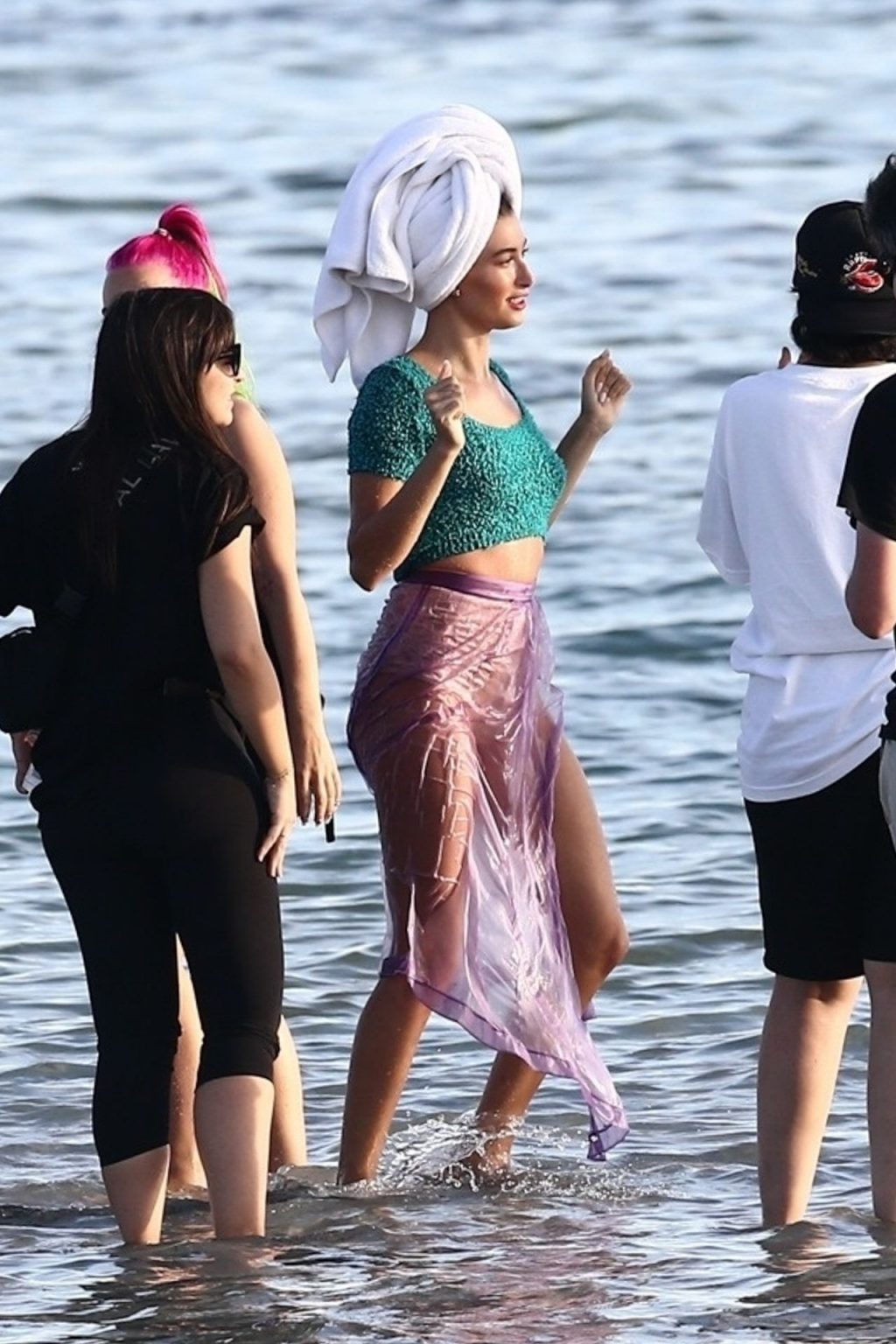 Justin se sienta en la arena mientras observa cómo un equipo de peluquería y maquillaje arregla a Hailey. Más tarde, Hailey se une a Justin, y la pareja casada se sienta junta con su adorable cachorro. Luego, Justin y Hailey se alejan del set de fotos y tienen una conversación íntima donde Hailey se abraza a Justin.