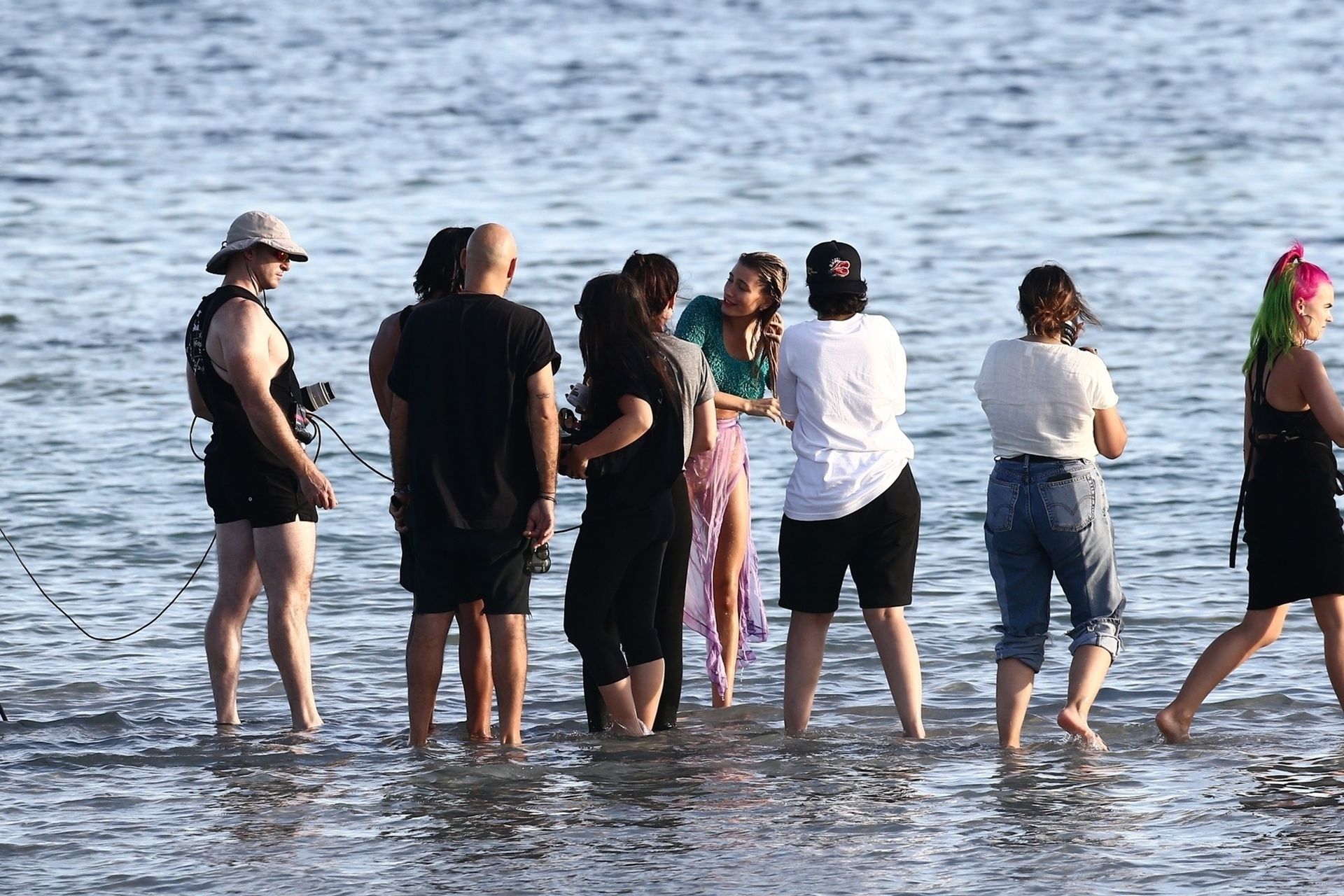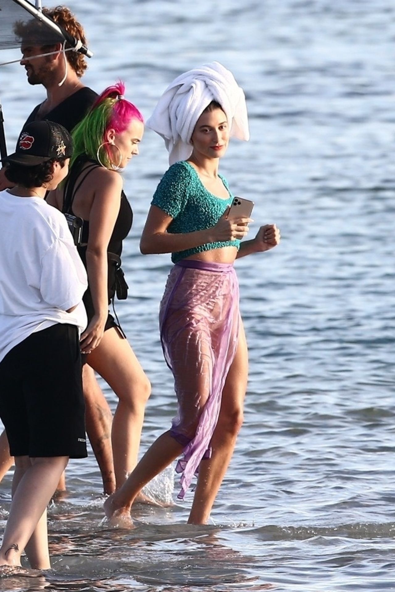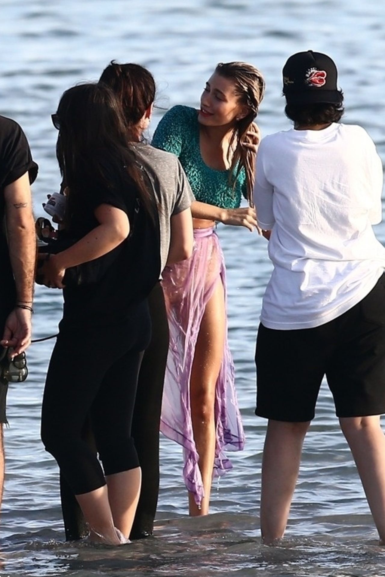 Justin se sienta en la arena mientras observa cómo un equipo de peluquería y maquillaje arregla a Hailey. Más tarde, Hailey se une a Justin, y la pareja casada se sienta junta con su adorable cachorro. Luego, Justin y Hailey se alejan del set de fotos y tienen una conversación íntima donde Hailey se abraza a Justin.