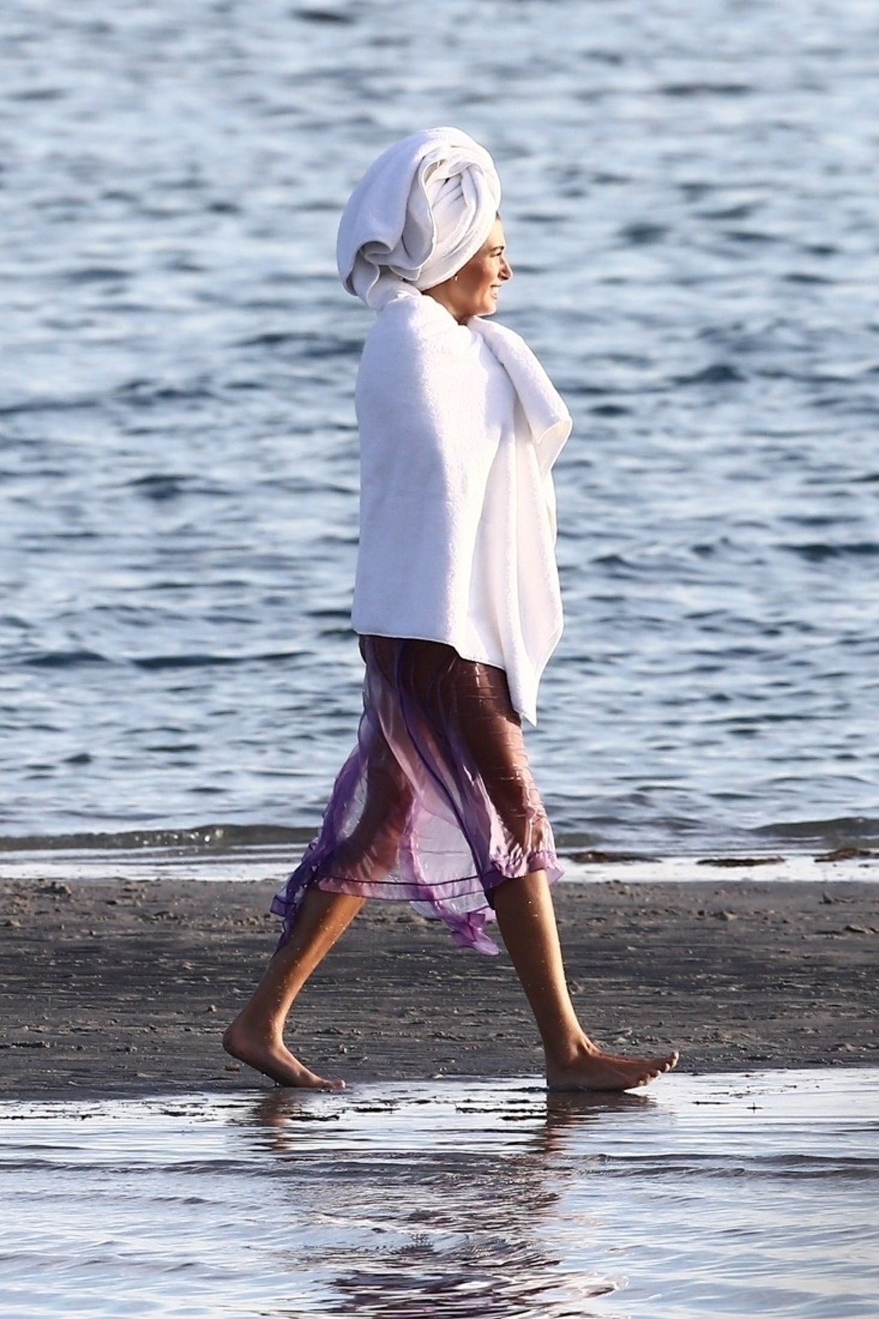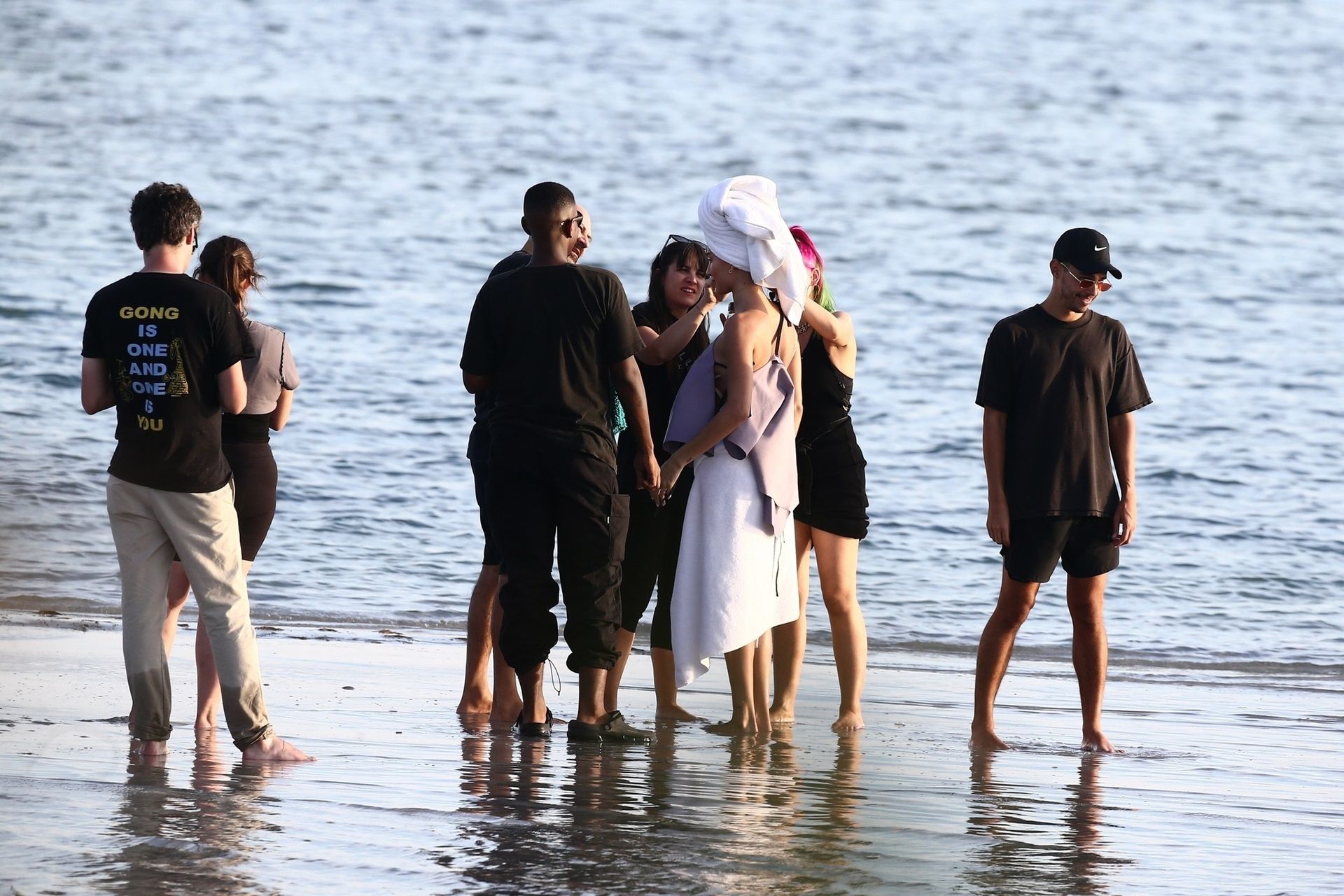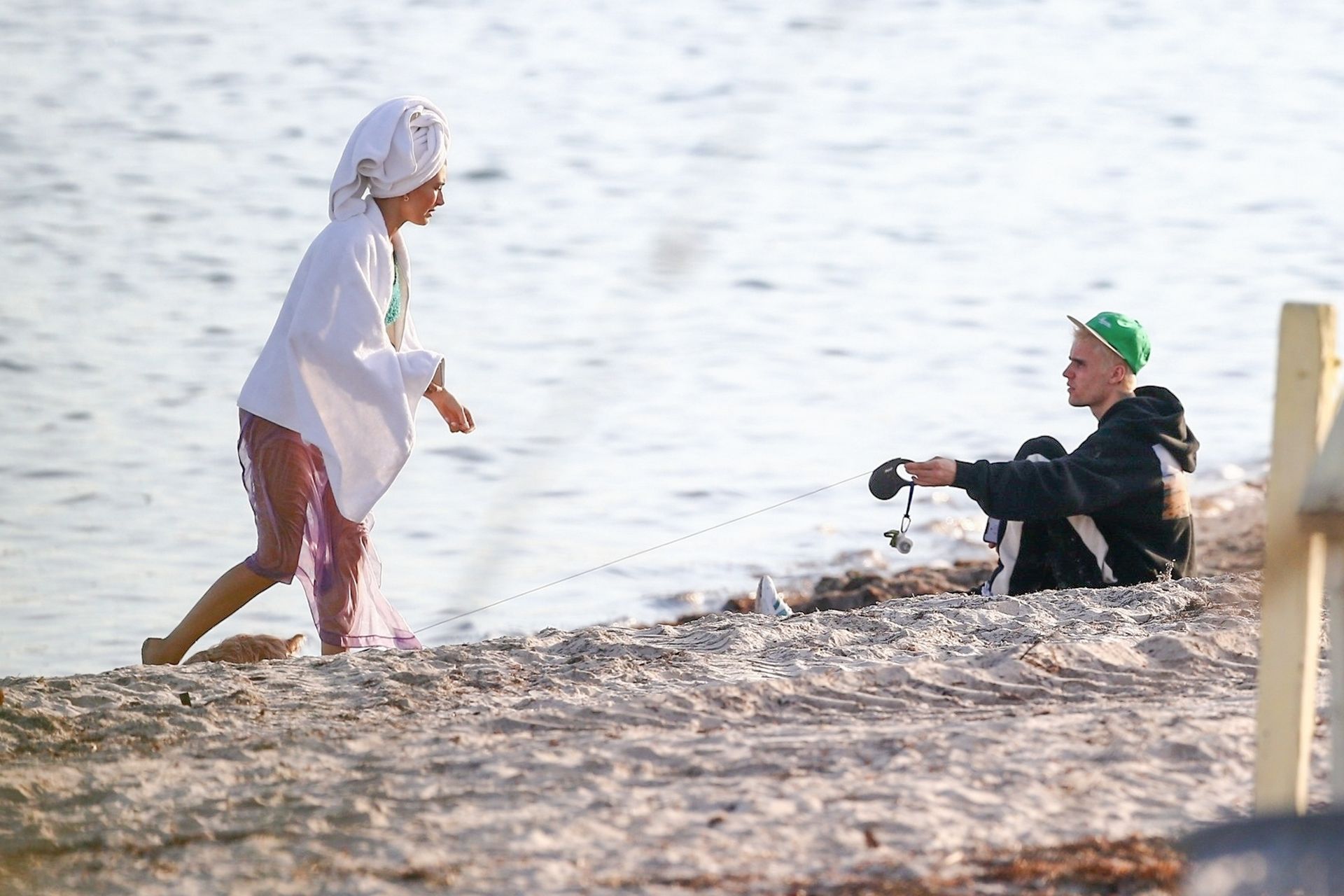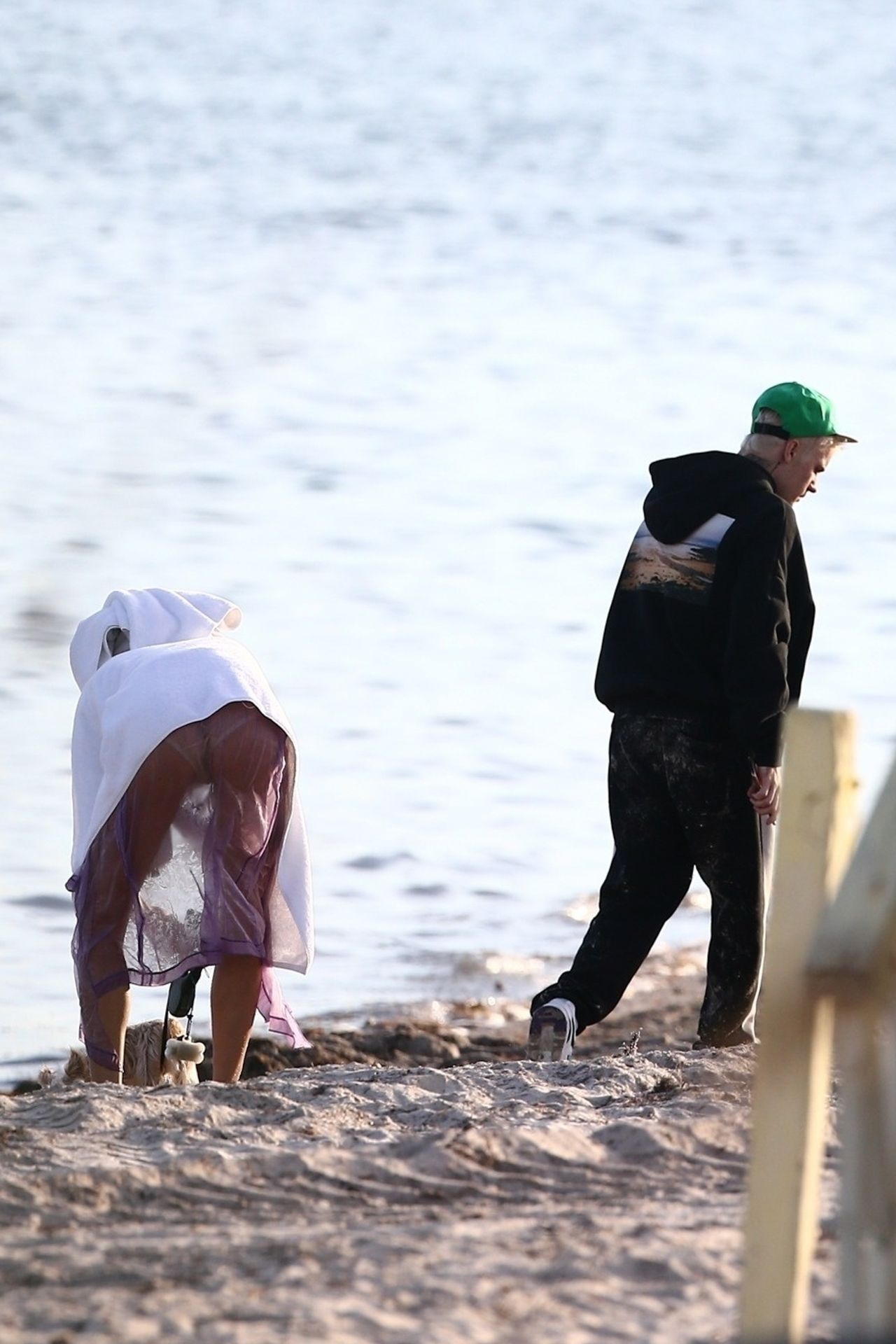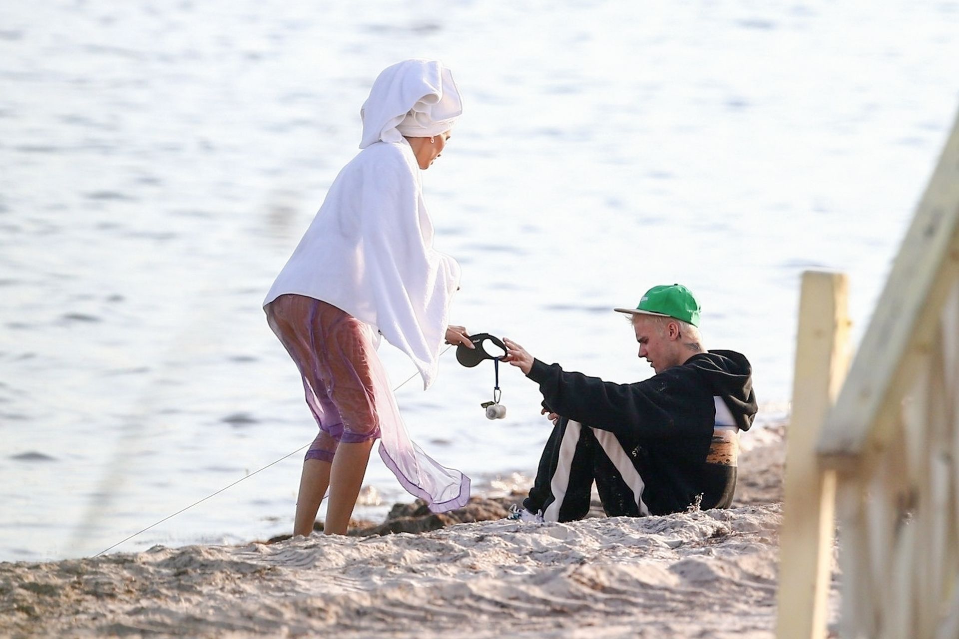 Justin Bieber visita a su esposa Hailey Bieber en Miami mientras la supermodelo se ocupa durante una sesión de fotos junto a la playa, 27/11/2019.