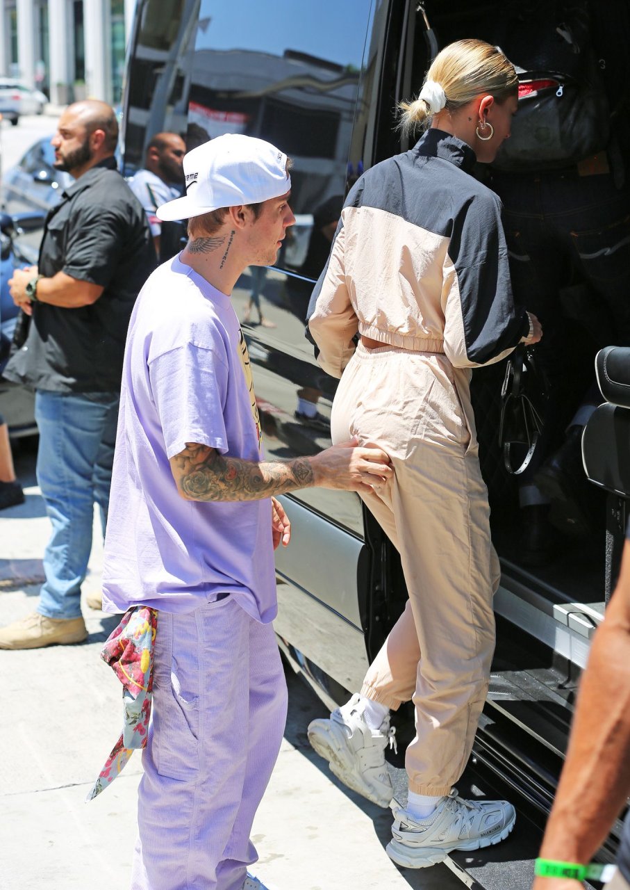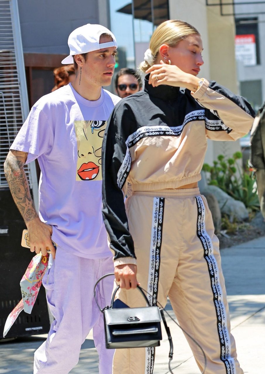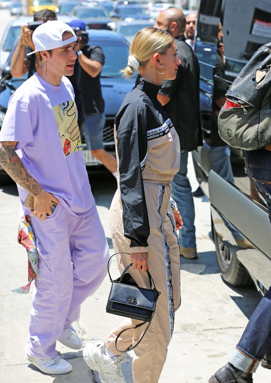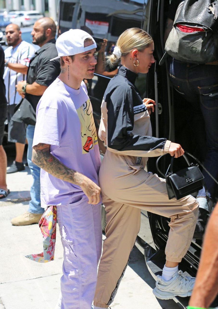 Justin Bieber y Hailey Baldwin salen con atuendos llamativos mientras están acompañados por miembros de su iglesia en Los Ángeles, 20/07/2019.