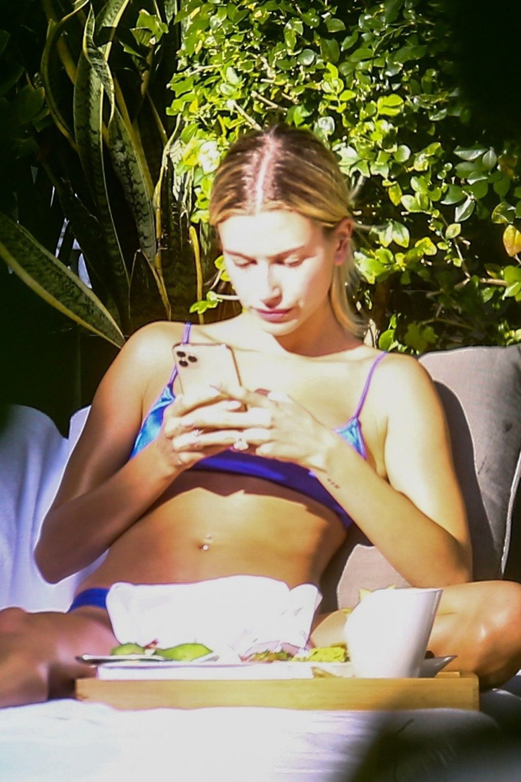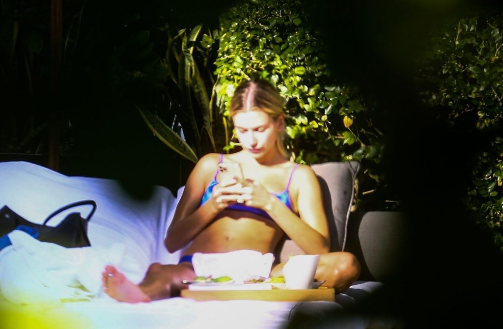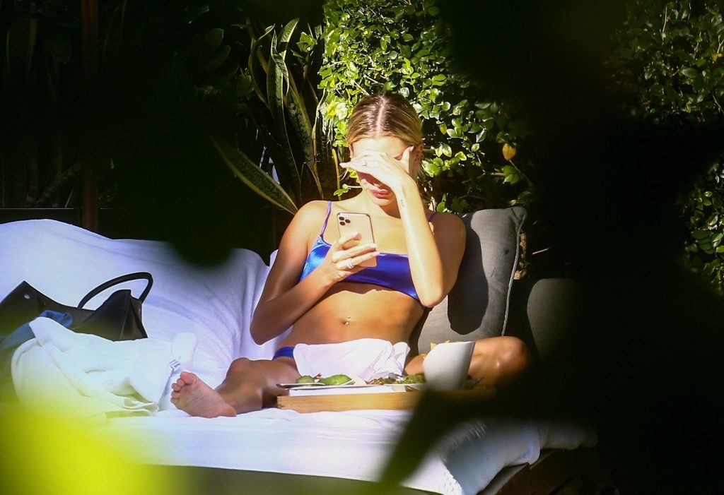 Supermodelo Hailey Bieber disfruta de un tiempo de descanso junto a la piscina en Miami, 26/11/2019. Hailey se relaja al borde de la piscina y disfruta de una bandeja de comida mientras revisa su teléfono. Hailey llevaba un bikini azul de satén a juego.