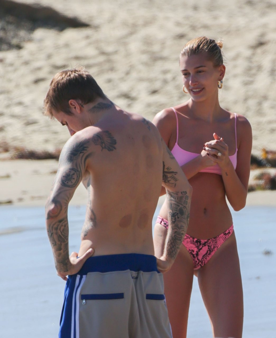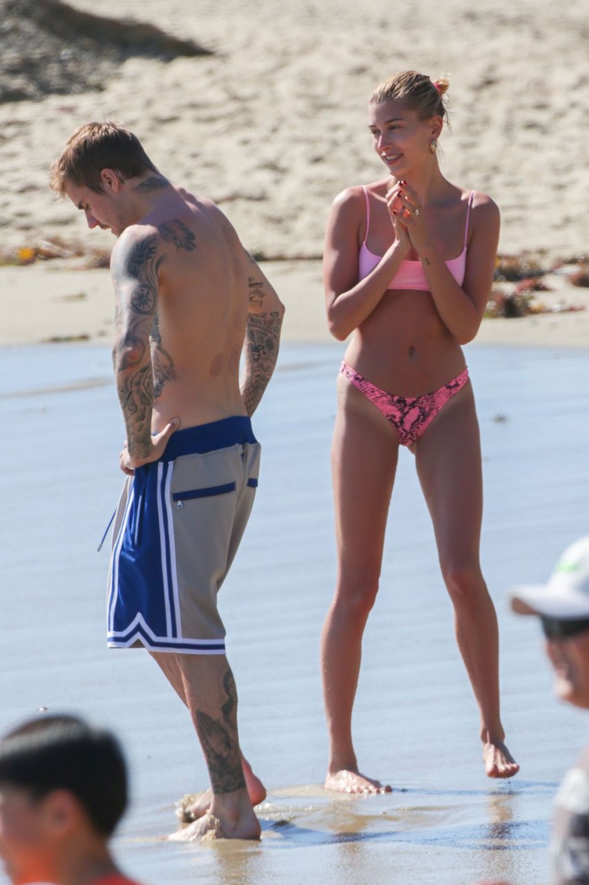 Justin Bieber y su esposa Hailey Baldwin están disfrutando de su día al sol, 17/03/2019. La pareja con problemas está dejando atrás sus preocupaciones mientras van a la playa y se reconectan tras el tratamiento de Bieber por depresión. Un Bieber con barba mostró sus tatuajes y sus abdominales marcados, mientras que la modelo Hailey estaba linda en rosa con un bikini diminuto.