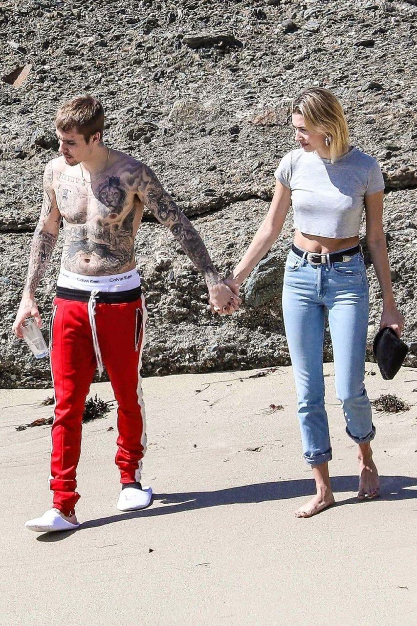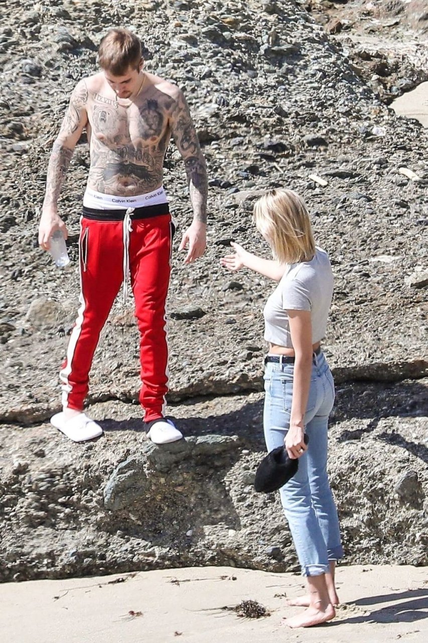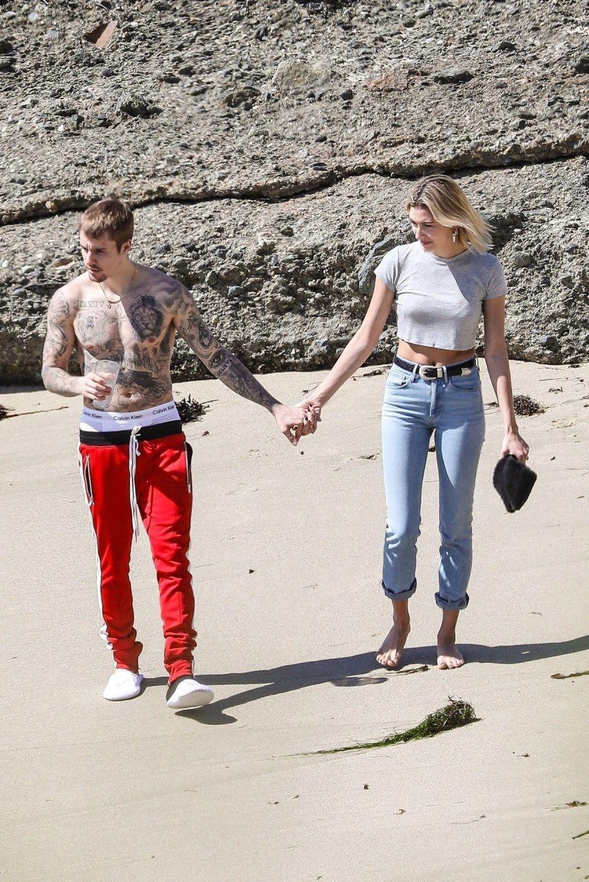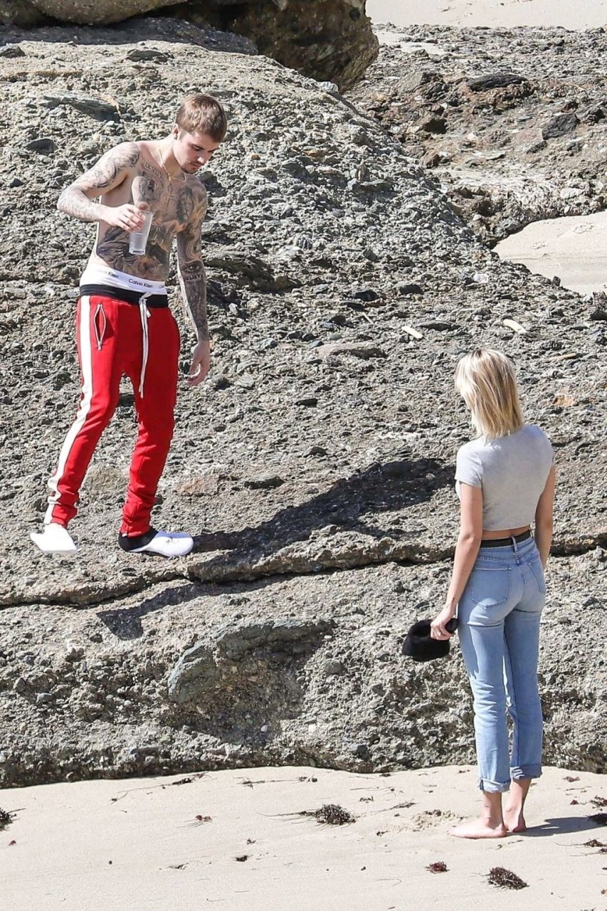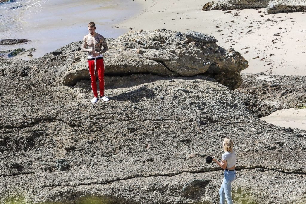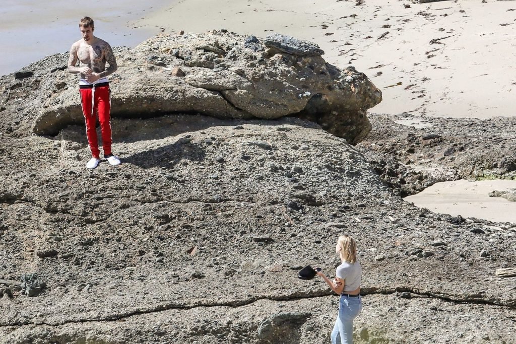 La pareja da un paseo romántico por los acantilados y la arena antes de encontrarse con fans a quienes saludan con sonrisas y selfies. En un momento, Justin parece reflexionar mientras está de pie en un pequeño acantilado con vista a las olas rompiendo, con la cabeza inclinada hacia abajo. JB estuvo sin camisa durante todo el paseo; mientras tanto, su esposa Hailey llevaba un par de jeans de lavado claro y un top corto gris.