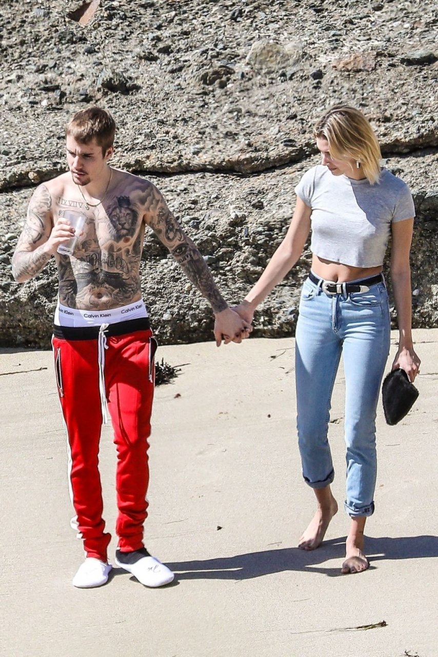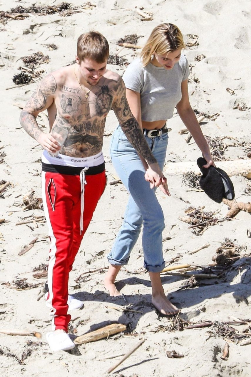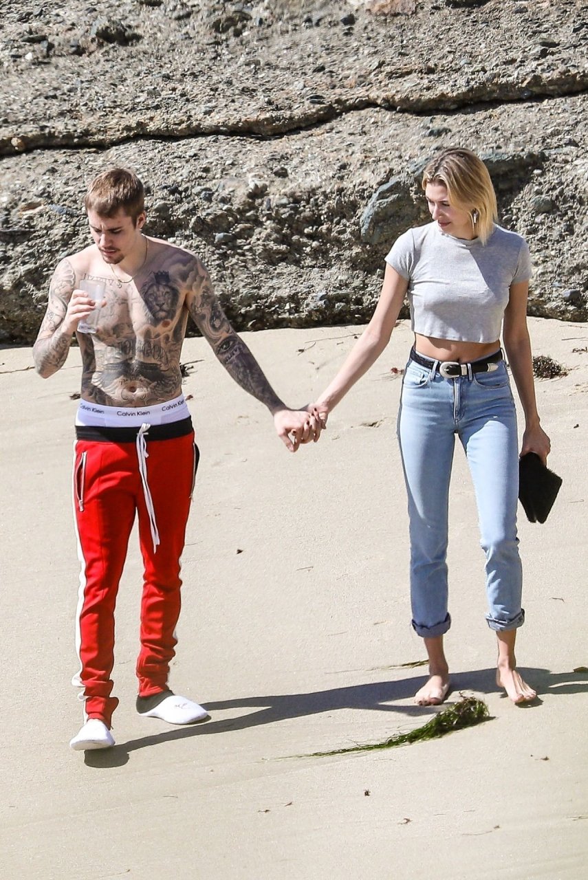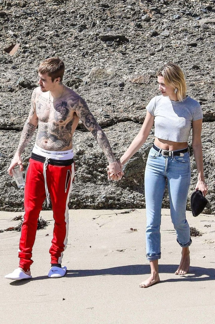 La pareja da un paseo romántico por los acantilados y la arena antes de encontrarse con fans a quienes saludan con sonrisas y selfies. En un momento, Justin parece reflexionar mientras está de pie en un pequeño acantilado con vista a las olas rompiendo, con la cabeza inclinada hacia abajo. JB estuvo sin camisa durante todo el paseo; mientras tanto, su esposa Hailey llevaba un par de jeans de lavado claro y un top corto gris.