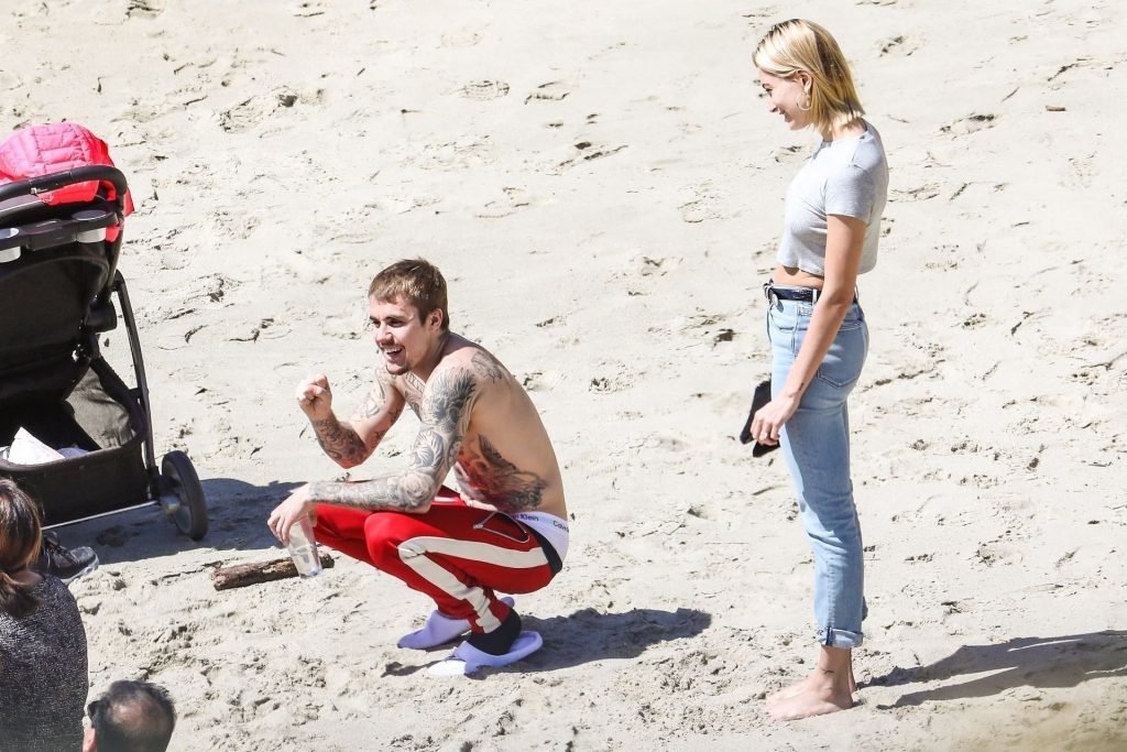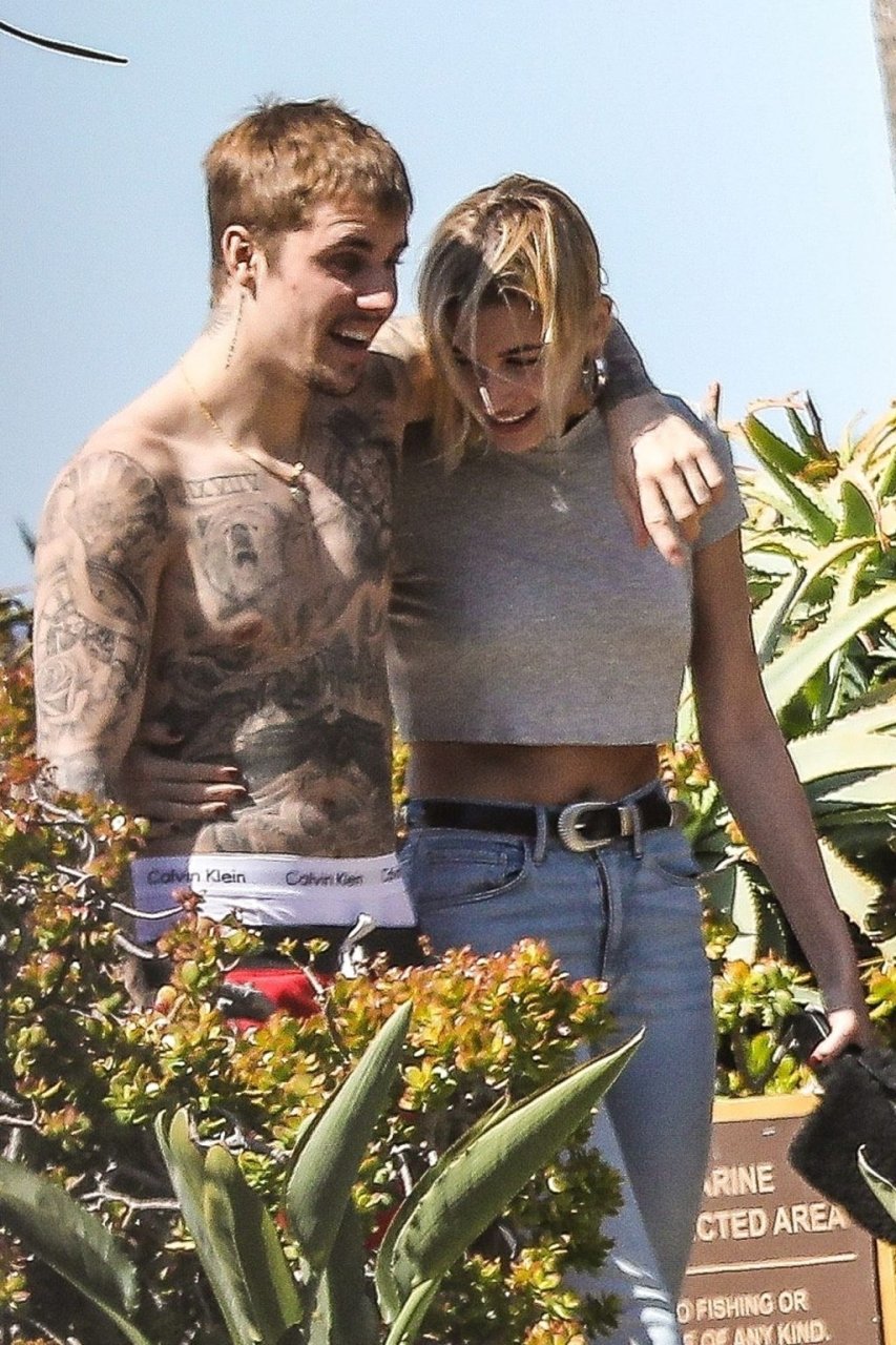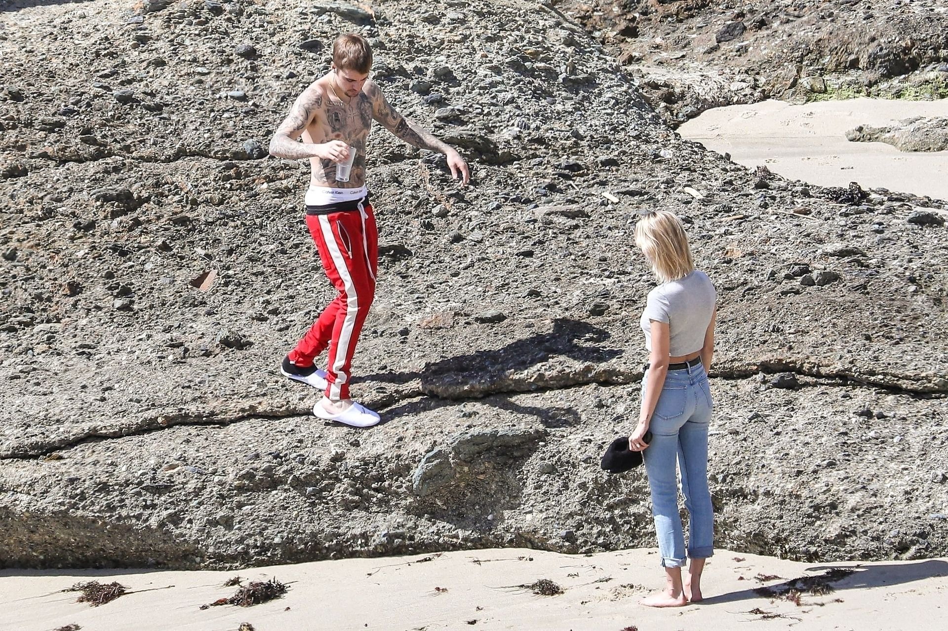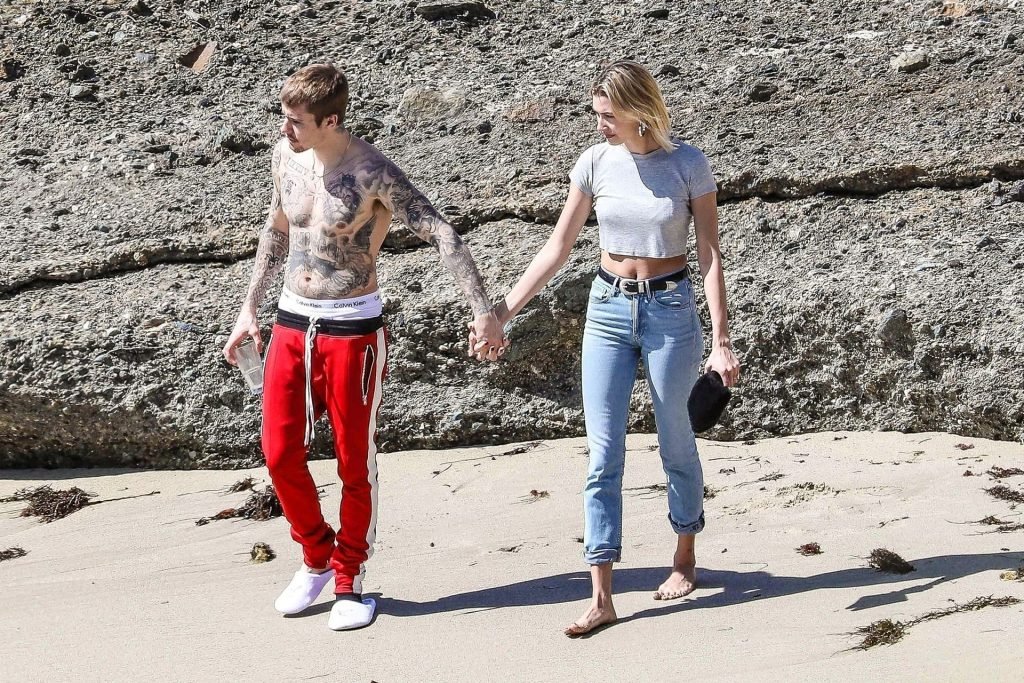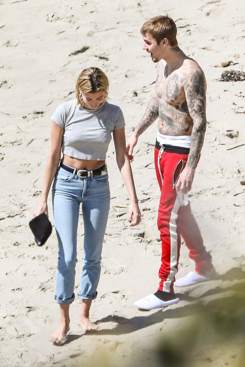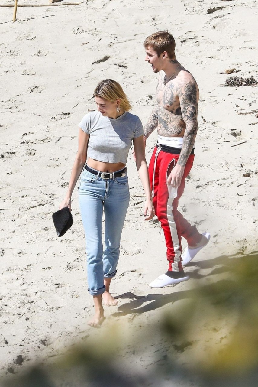 La pareja da un paseo romántico por los acantilados y la arena antes de encontrarse con fans a quienes saludan con sonrisas y selfies. En un momento, Justin parece reflexionar mientras está de pie en un pequeño acantilado con vista a las olas rompiendo, con la cabeza inclinada hacia abajo. JB estuvo sin camisa durante todo el paseo; mientras tanto, su esposa Hailey llevaba un par de jeans de lavado claro y un top corto gris.