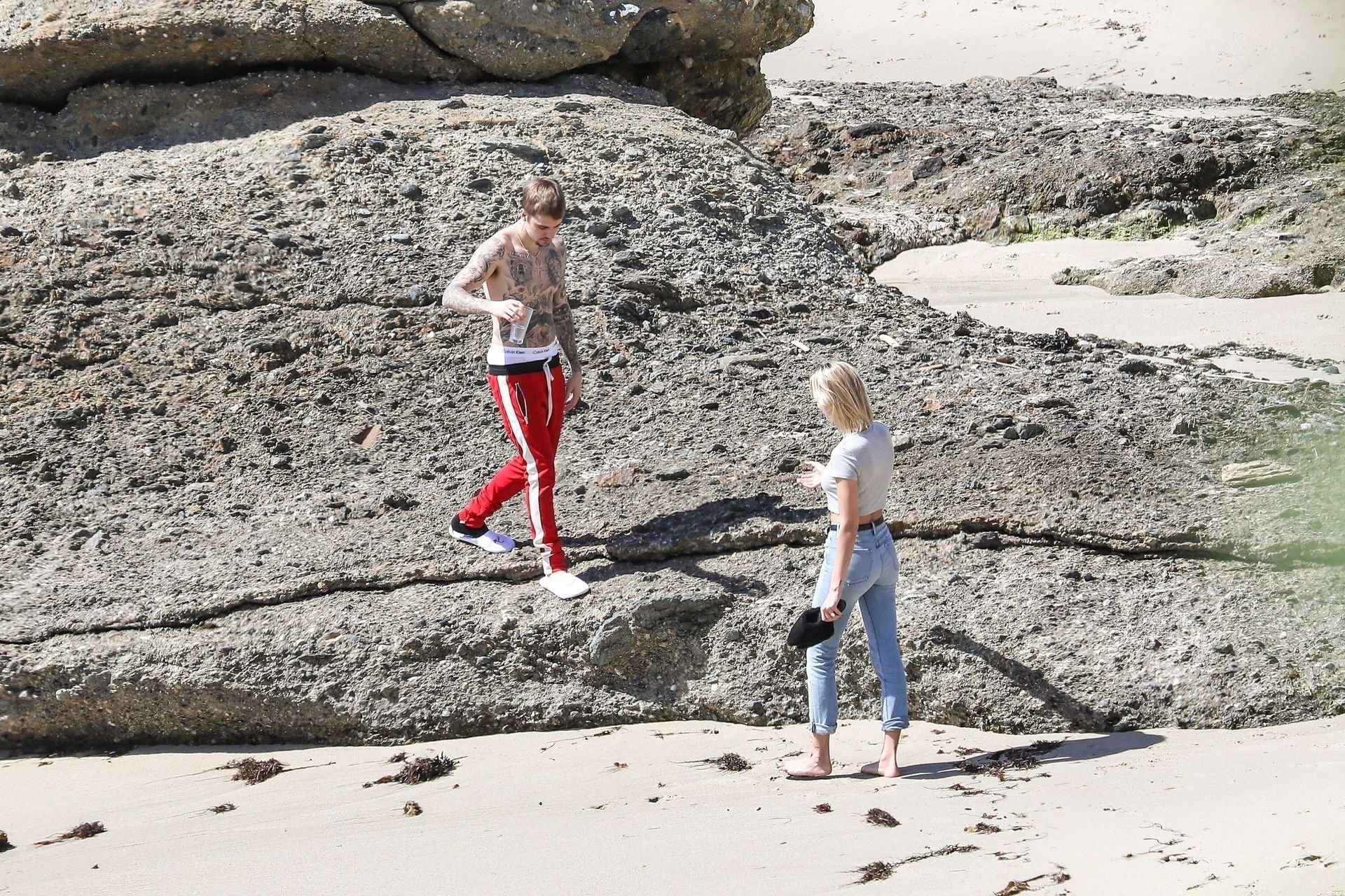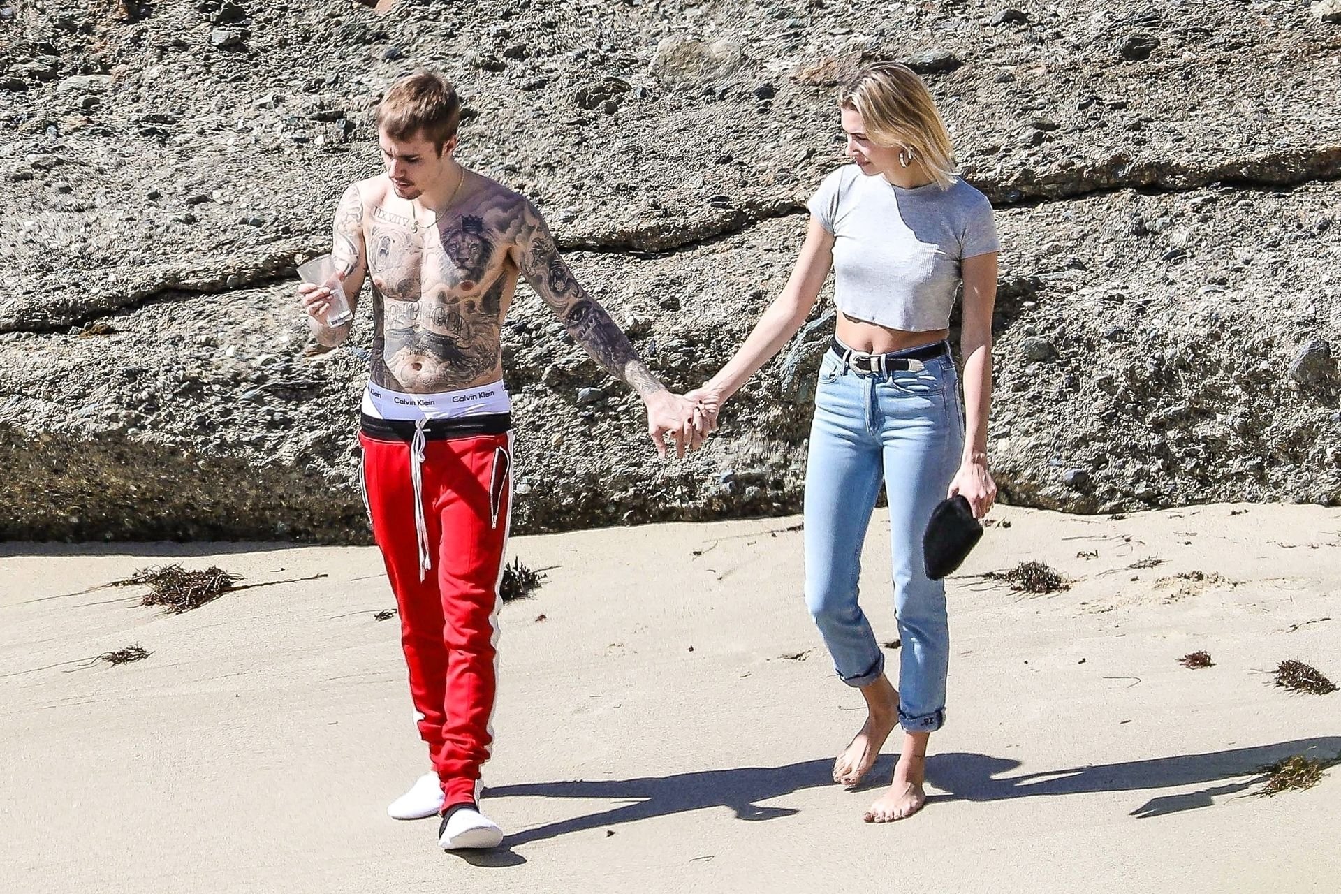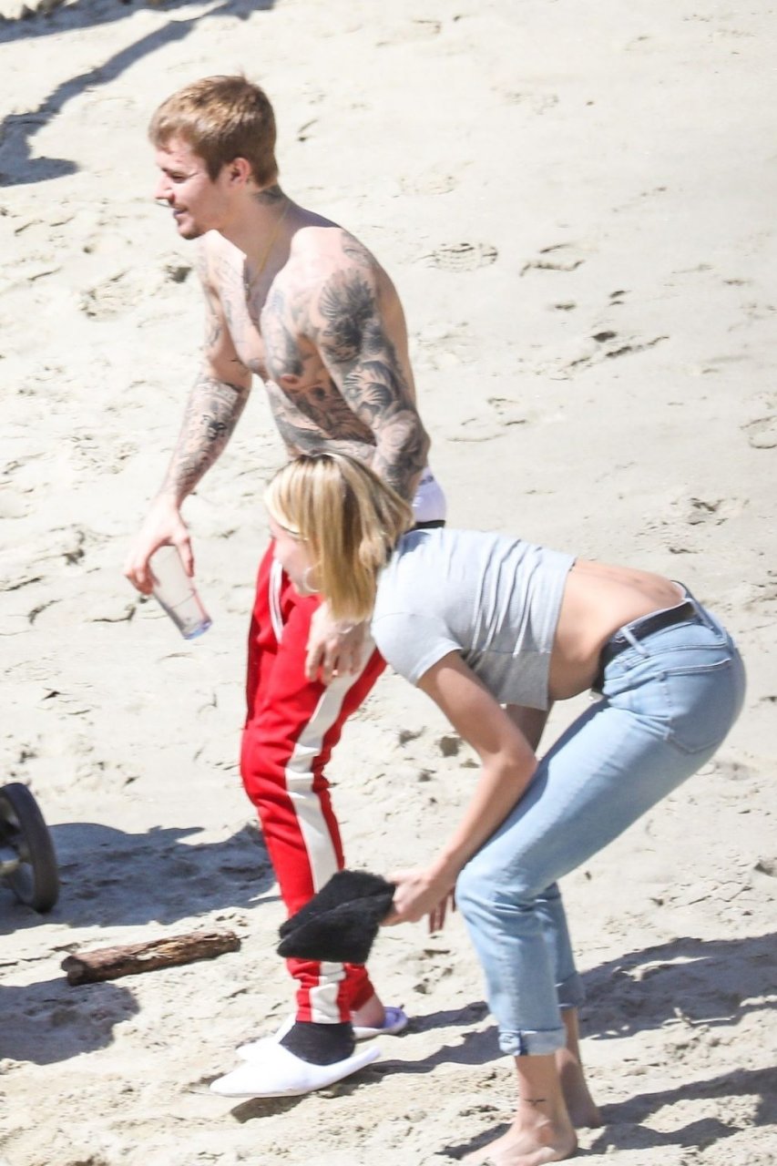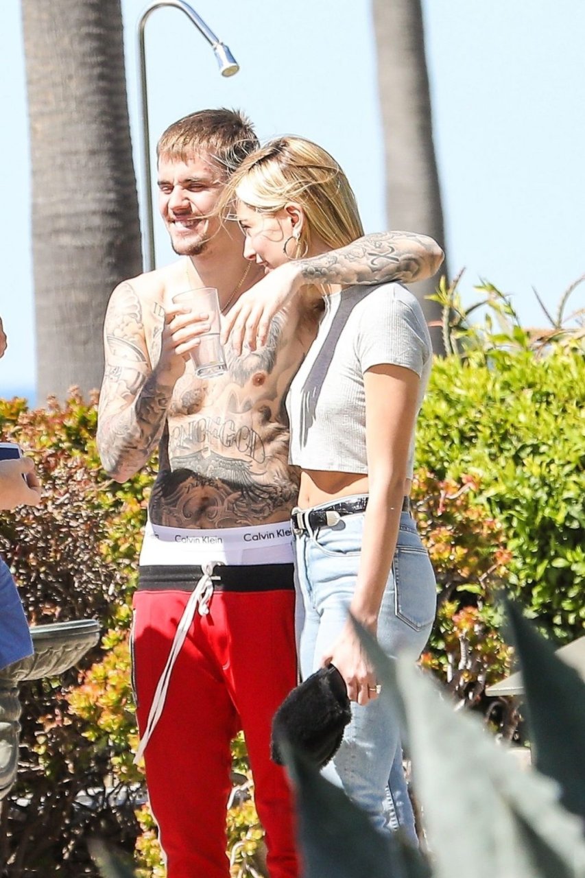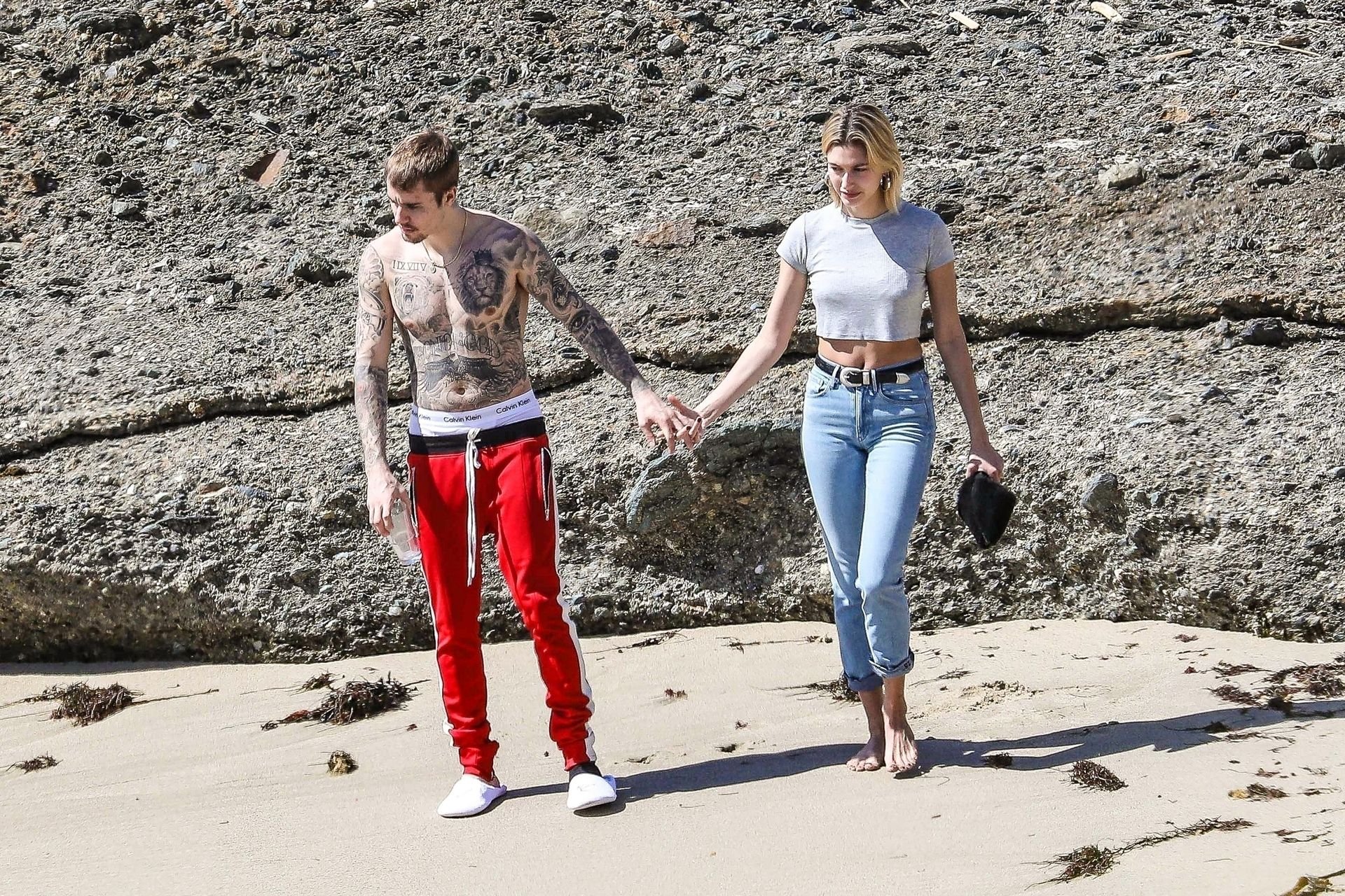 La pareja da un paseo romántico por los acantilados y la arena antes de encontrarse con fans a quienes saludan con sonrisas y selfies. En un momento, Justin parece reflexionar mientras está de pie en un pequeño acantilado con vista a las olas rompiendo, con la cabeza inclinada hacia abajo. JB estuvo sin camisa durante todo el paseo; mientras tanto, su esposa Hailey llevaba un par de jeans de lavado claro y un top corto gris.