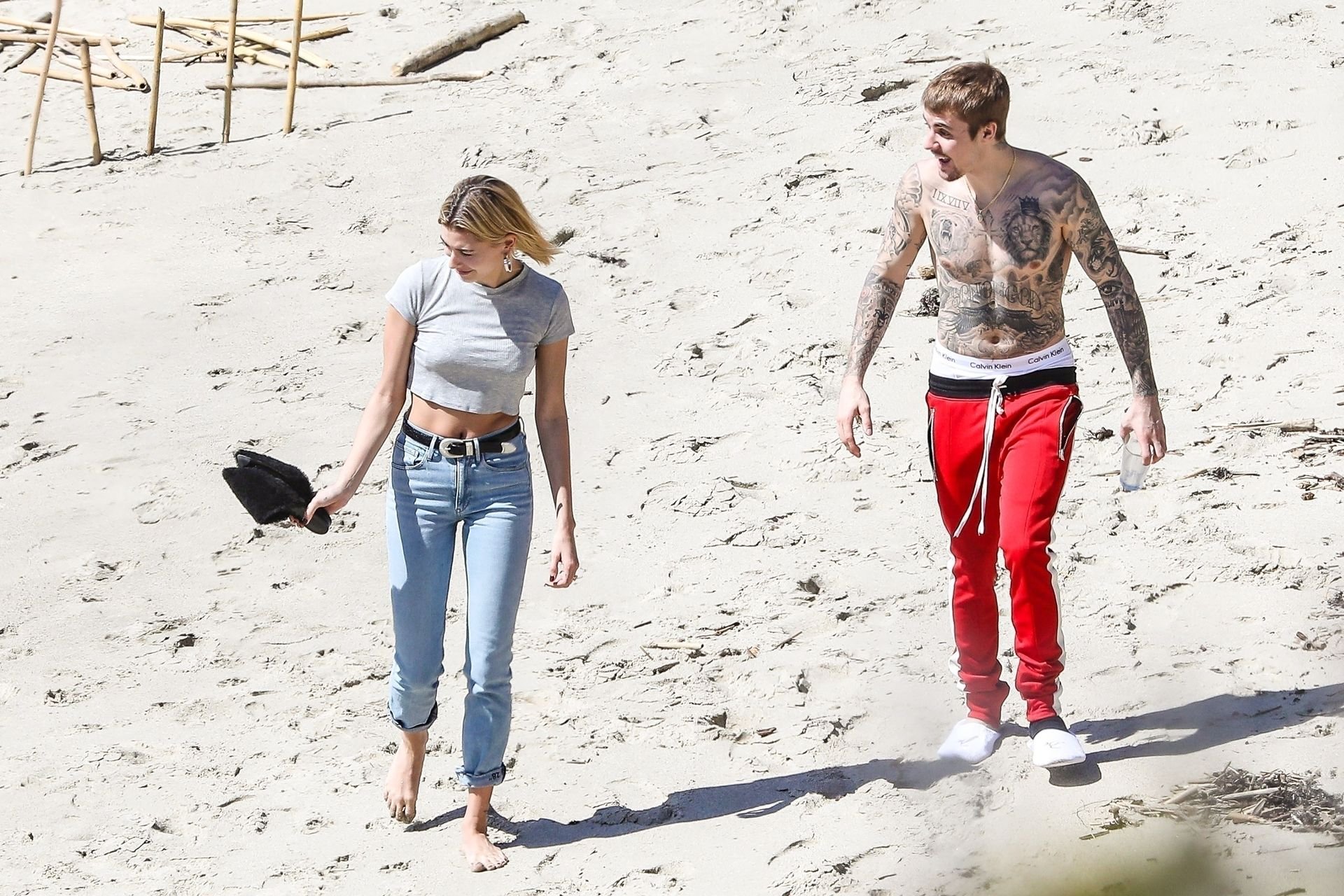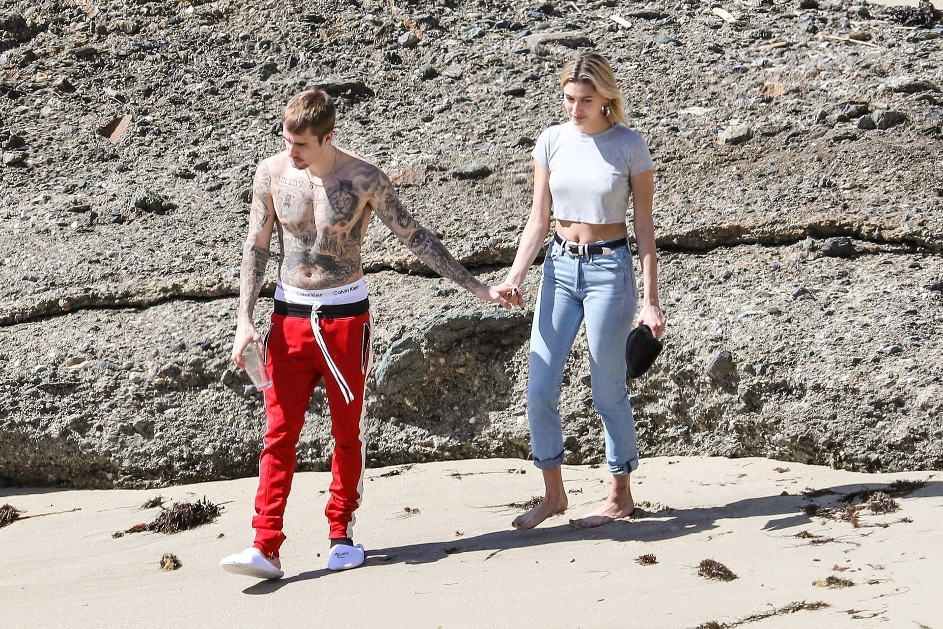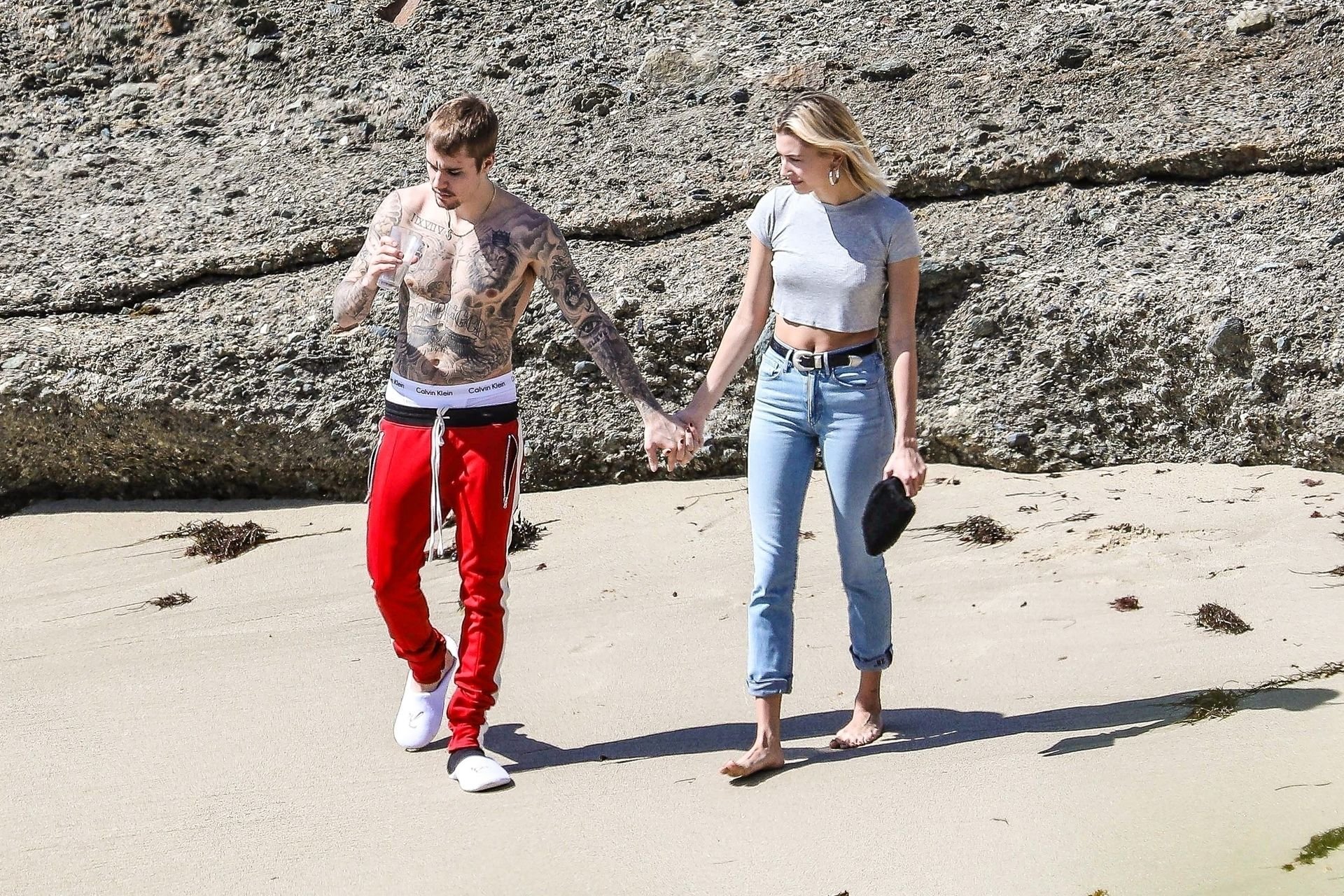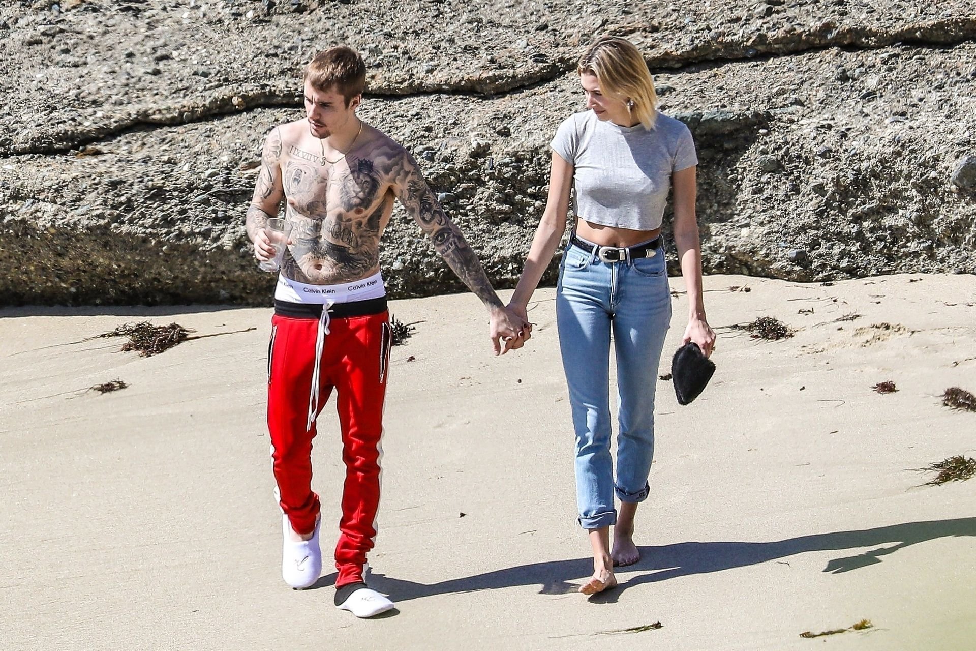 La pareja da un paseo romántico por los acantilados y la arena antes de encontrarse con fans a quienes saludan con sonrisas y selfies. En un momento, Justin parece reflexionar mientras está de pie en un pequeño acantilado con vista a las olas rompiendo, con la cabeza inclinada hacia abajo. JB estuvo sin camisa durante todo el paseo; mientras tanto, su esposa Hailey llevaba un par de jeans de lavado claro y un top corto gris.