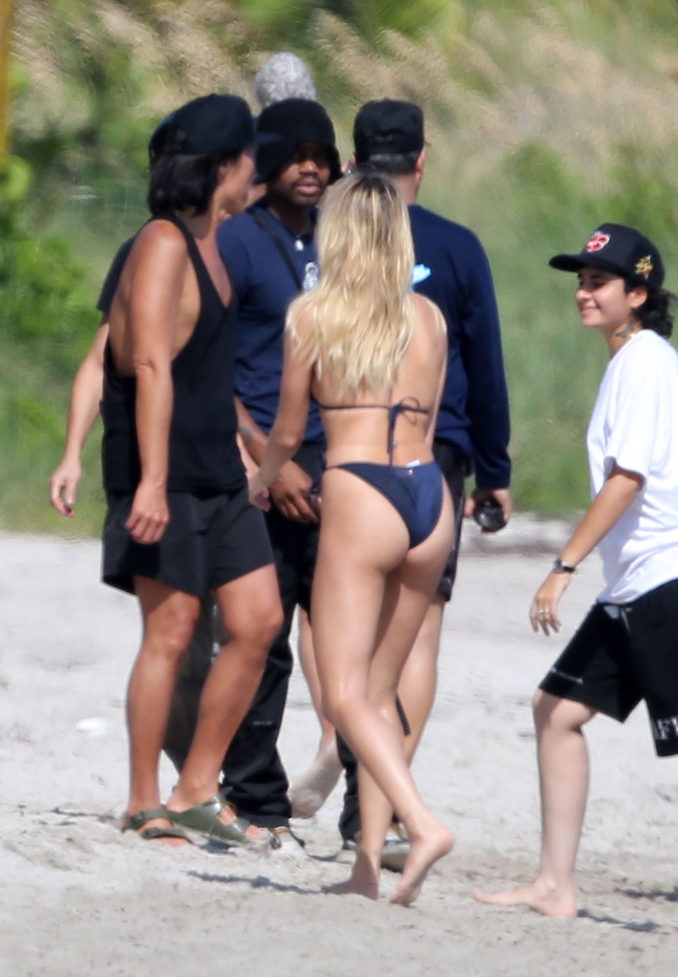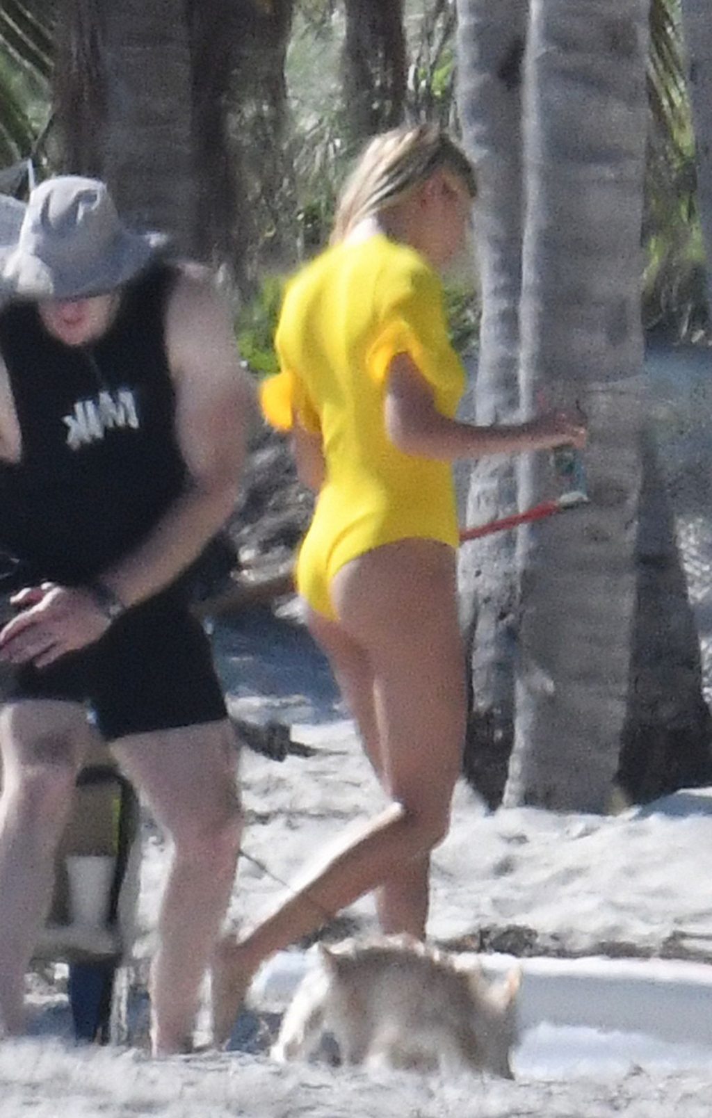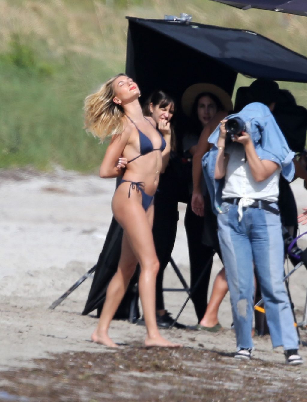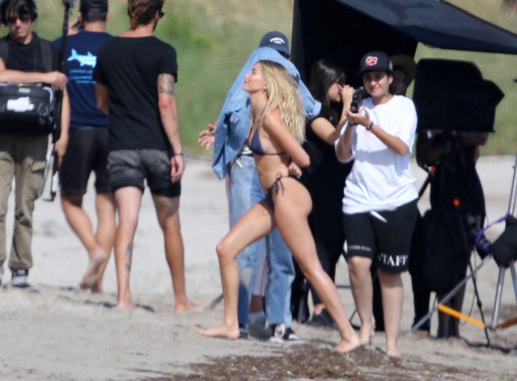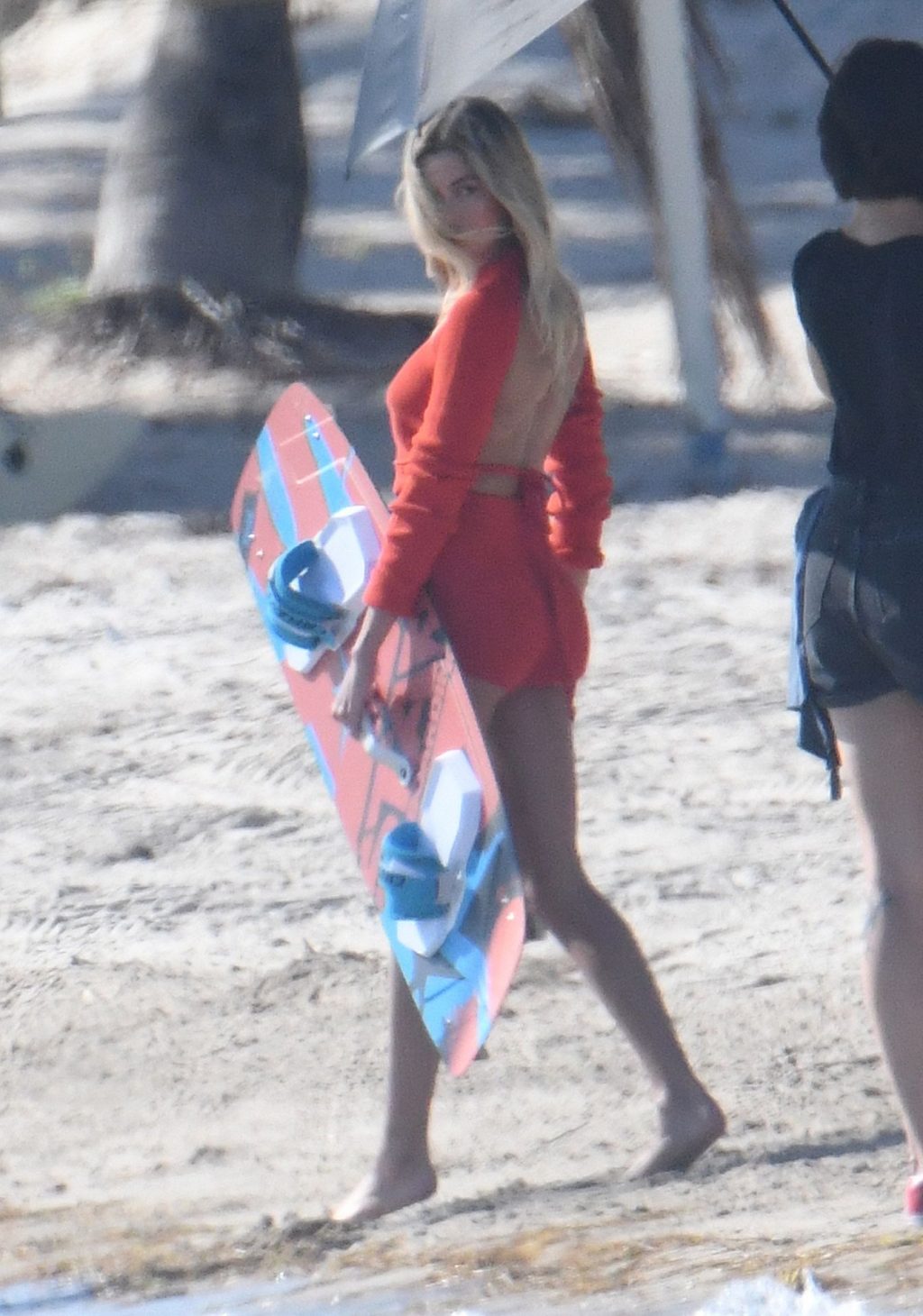 Model Hailey Bieber lleva un traje de baño azul, rojo y amarillo mientras posa durante una sesión de fotos en la playa de Miami, 27/11/2019.