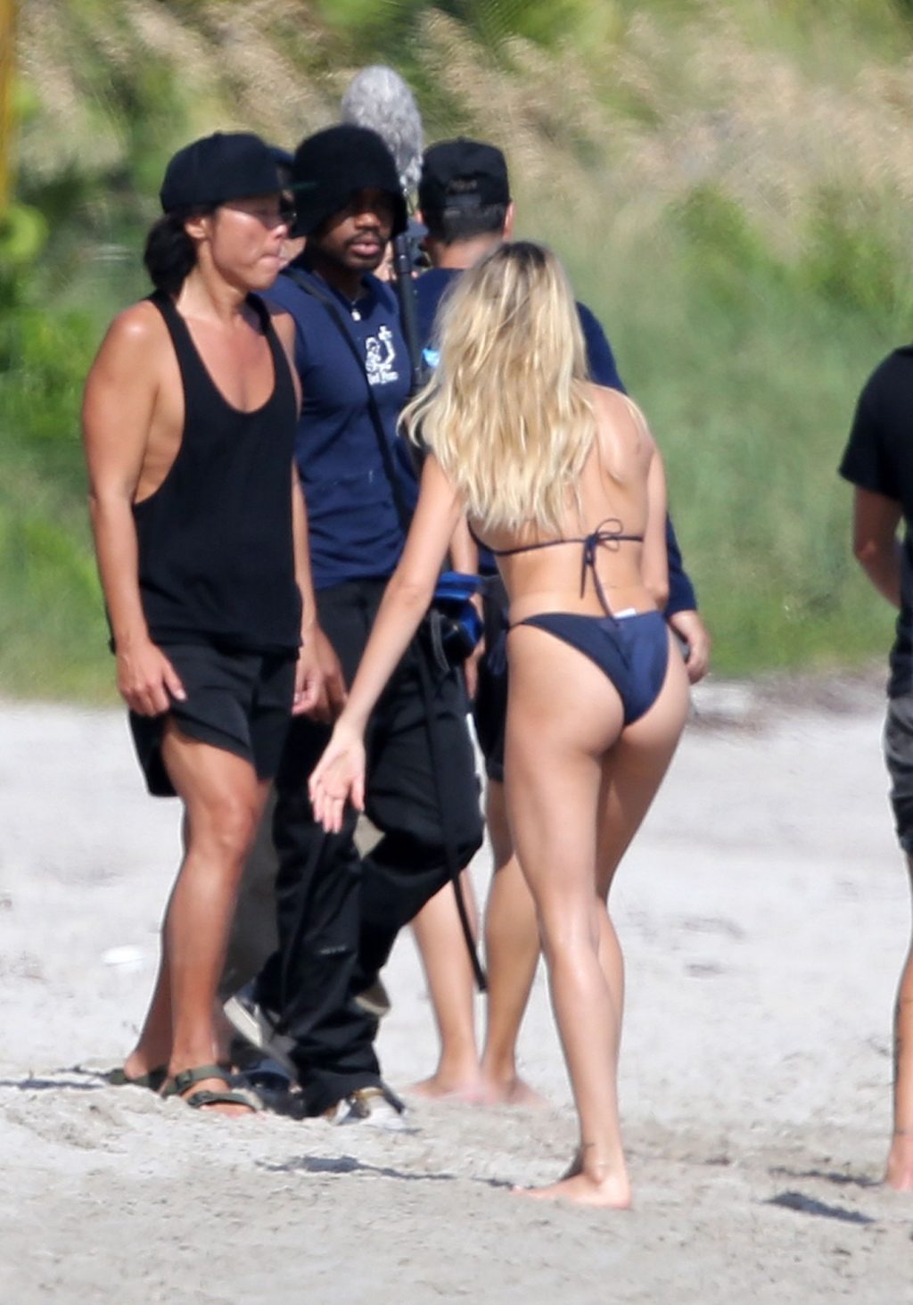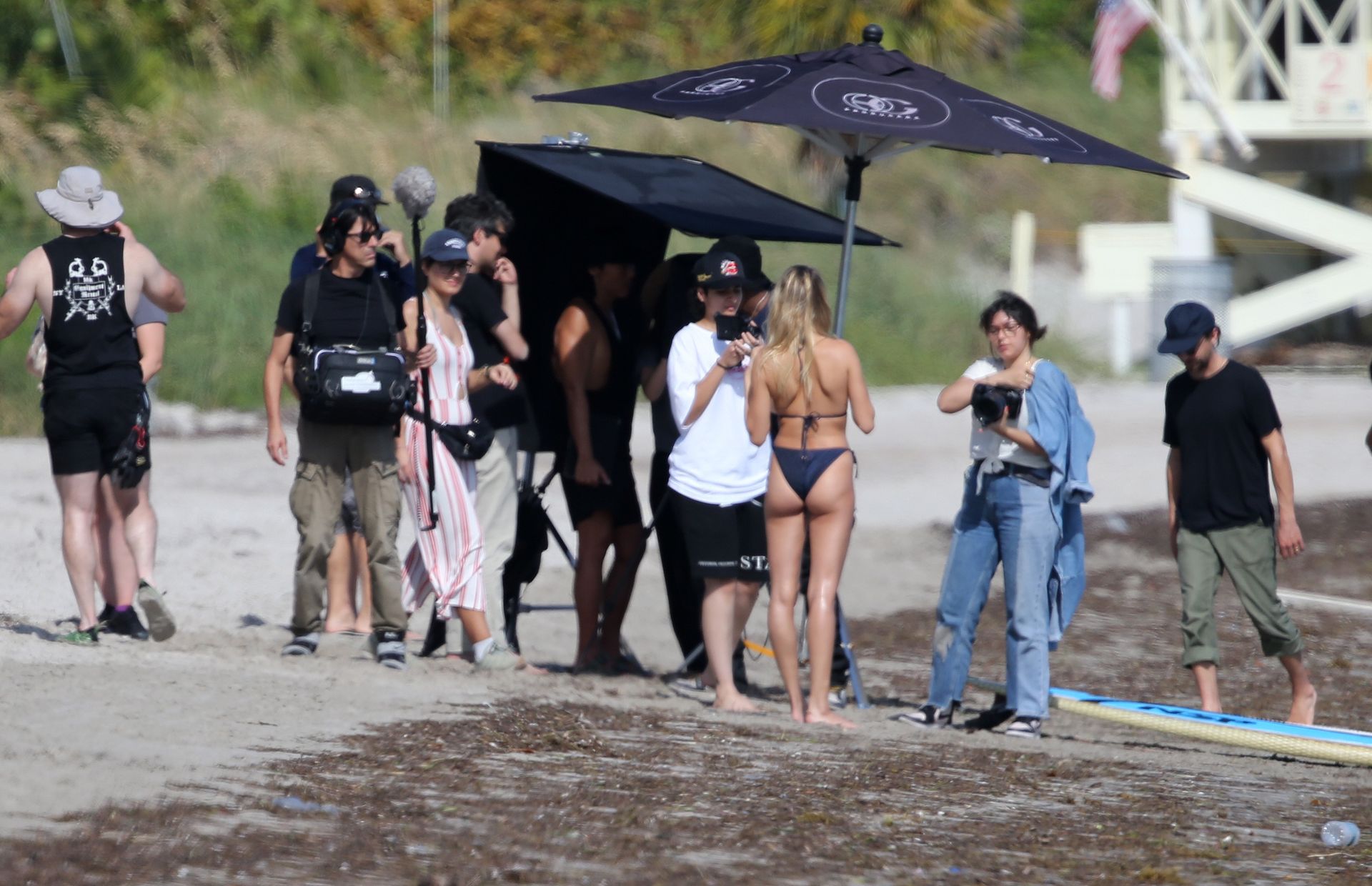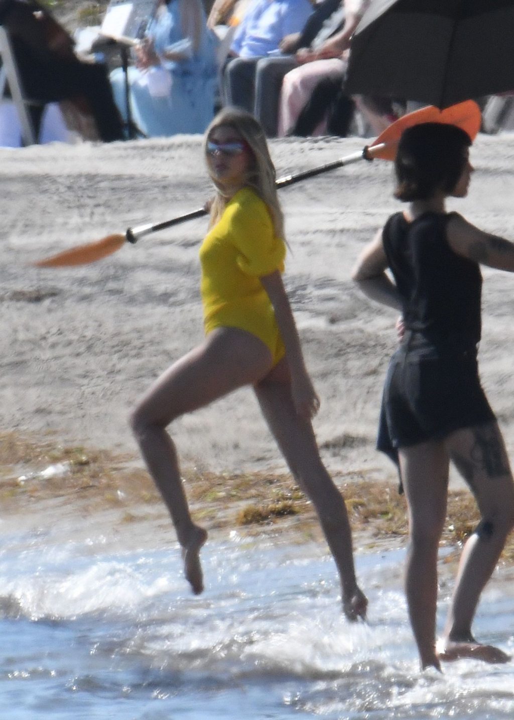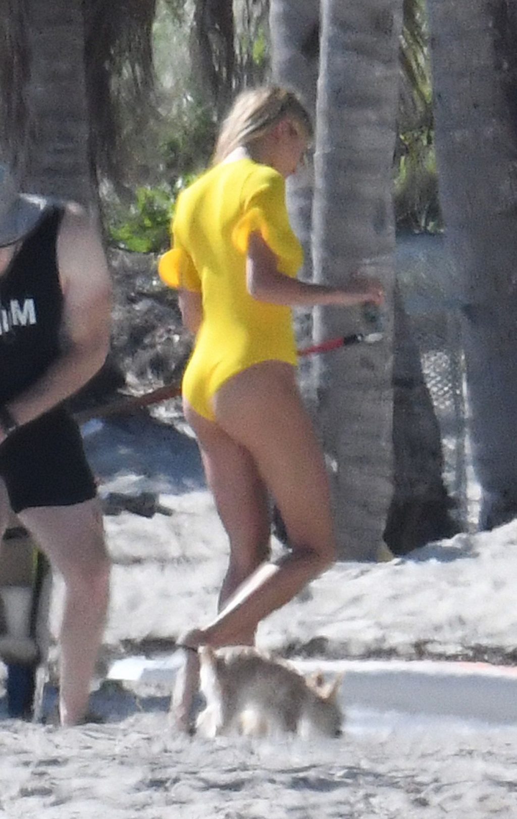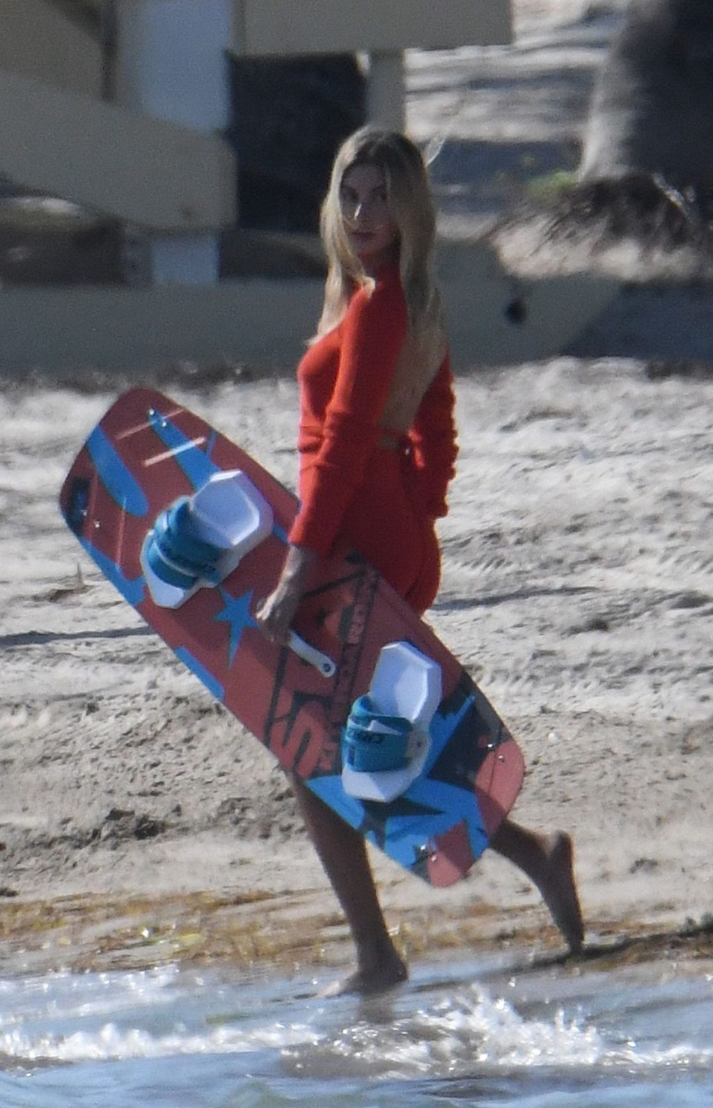 Model Hailey Bieber lleva un traje de baño azul, rojo y amarillo mientras posa durante una sesión de fotos en la playa de Miami, 27/11/2019.