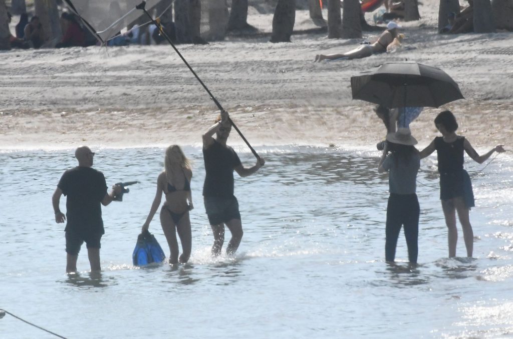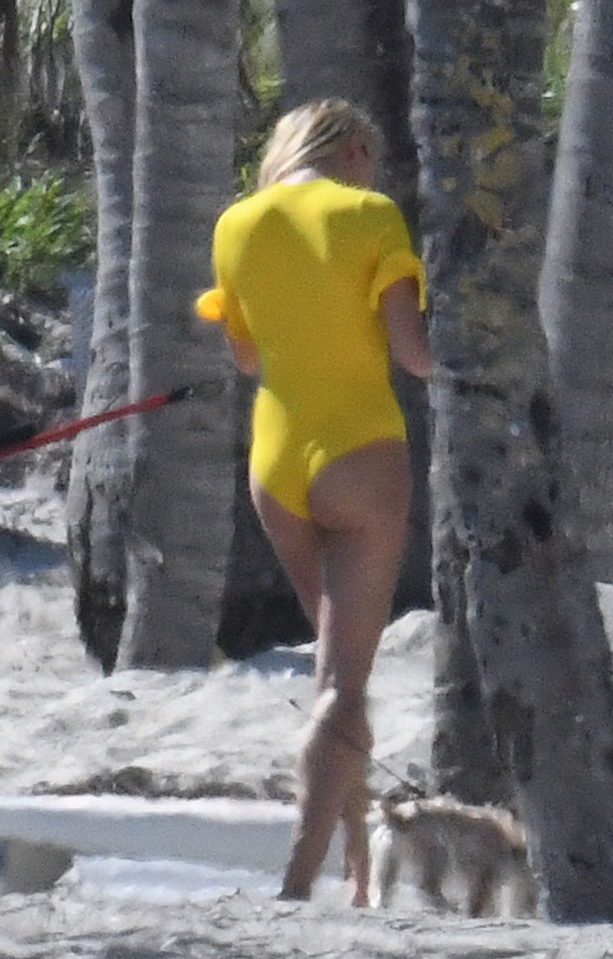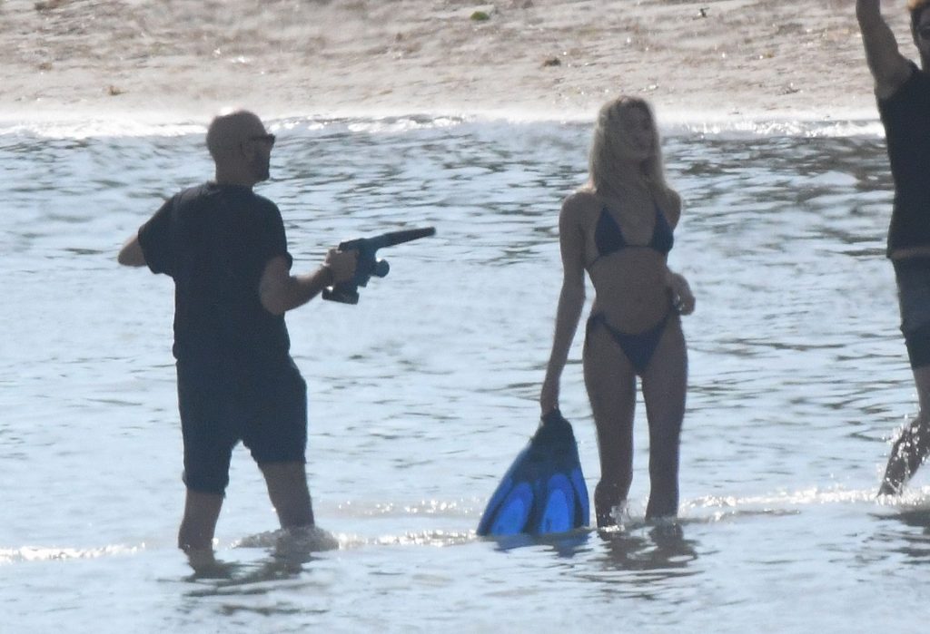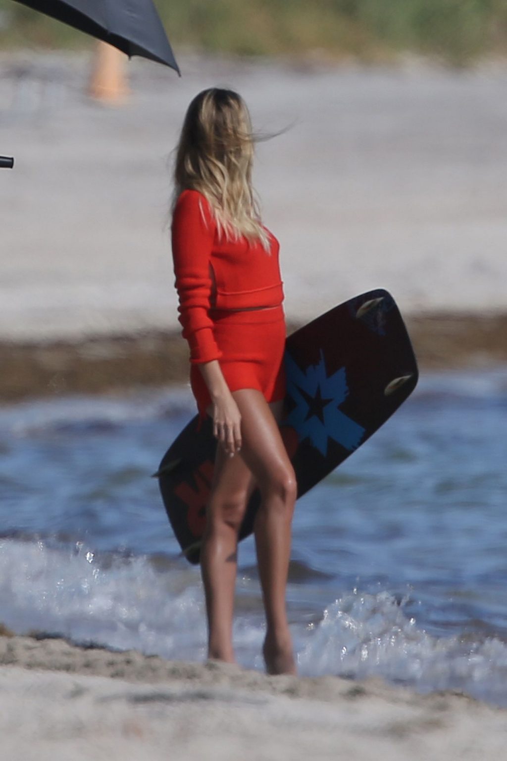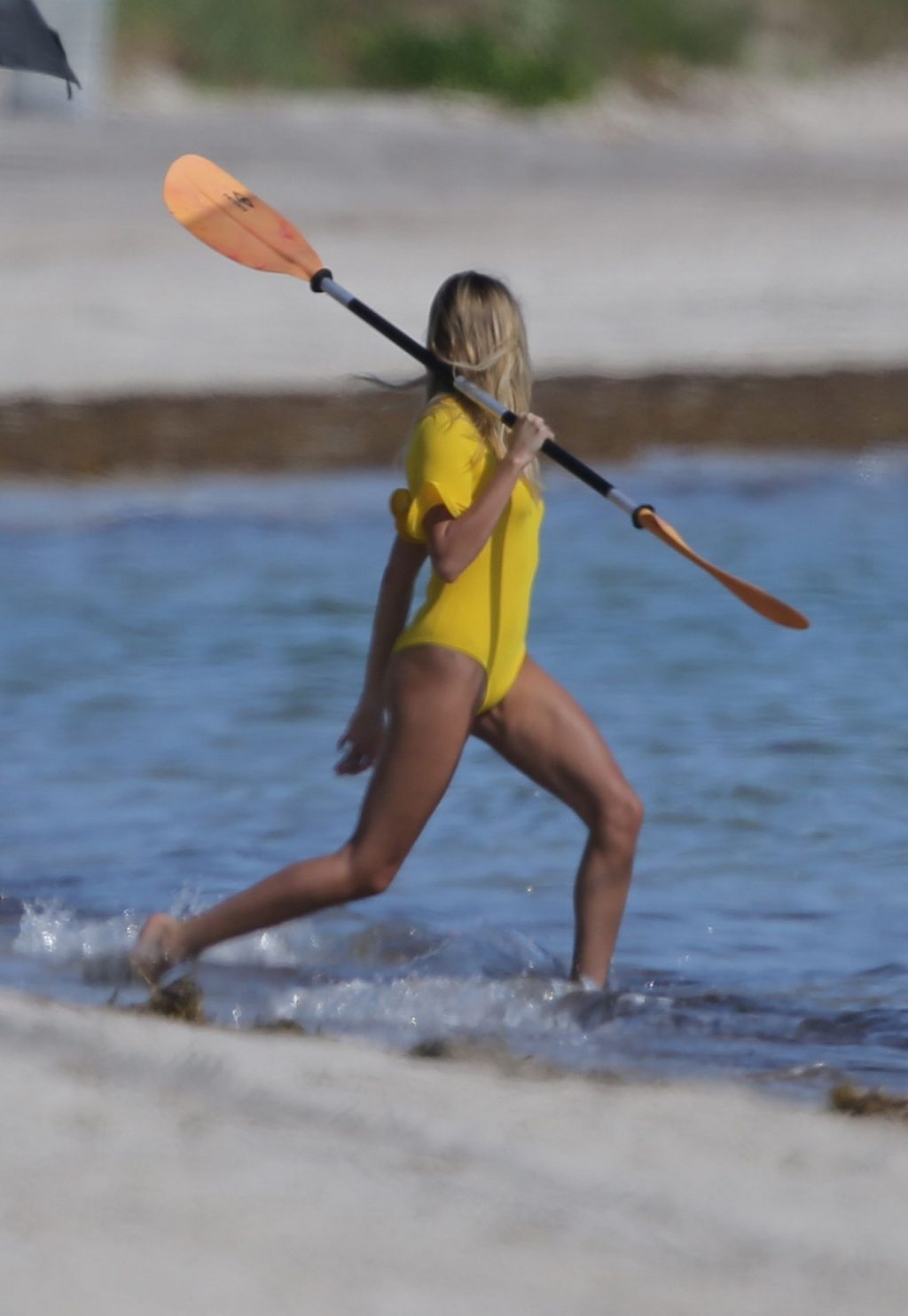 Model Hailey Bieber lleva un traje de baño azul, rojo y amarillo mientras posa durante una sesión de fotos en la playa de Miami, 27/11/2019.