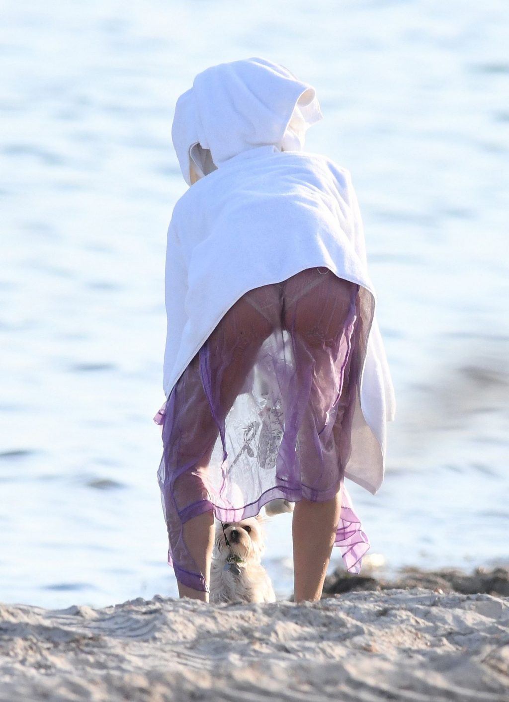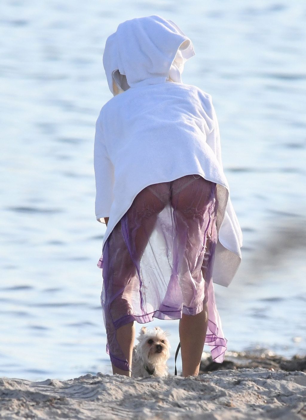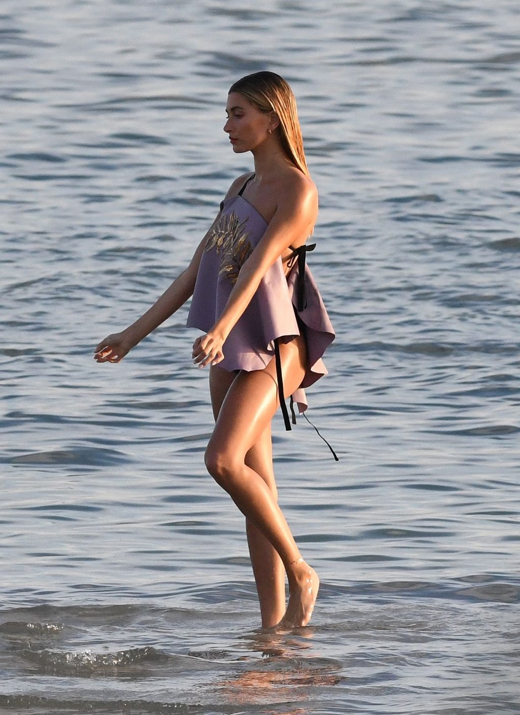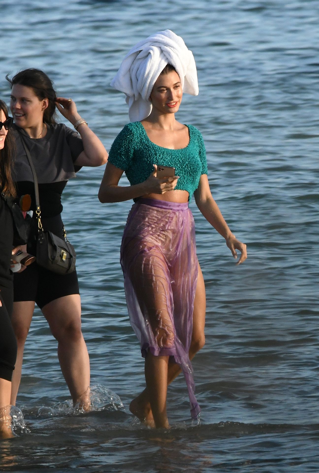 Hailey Bieber (23) lleva varios bikinis y conjuntos y recibe la visita de su esposo Justin Bieber mientras posa durante una sesión de fotos en la playa de Miami, 27/11/2019.
