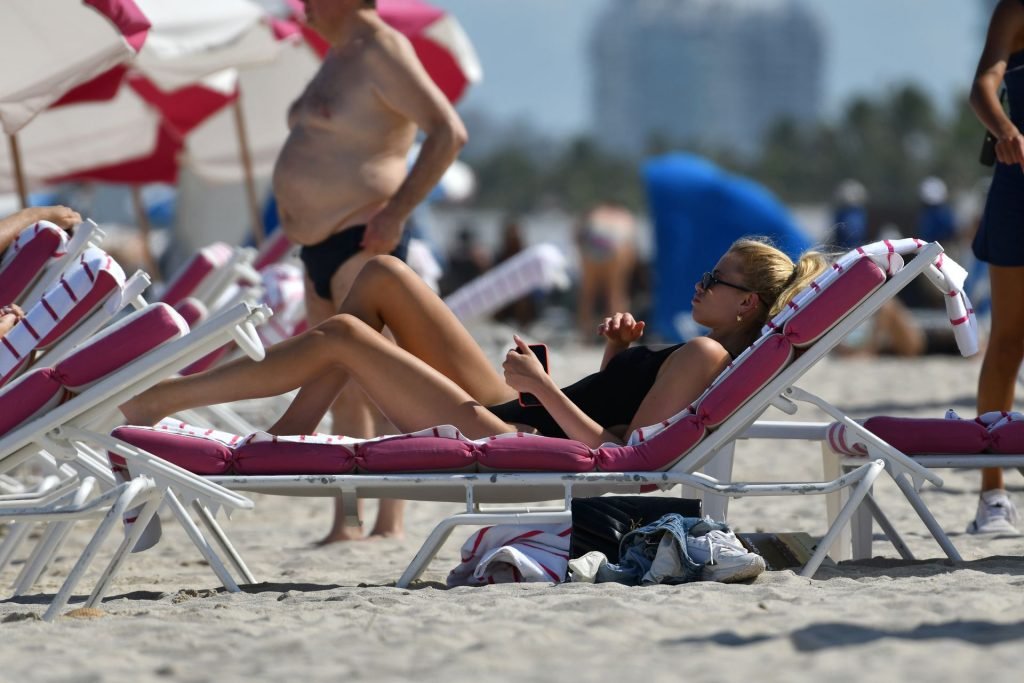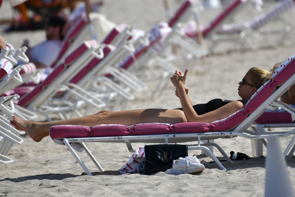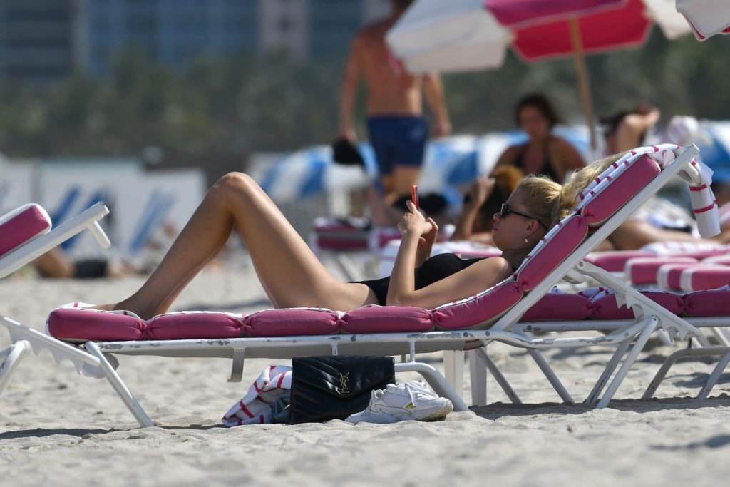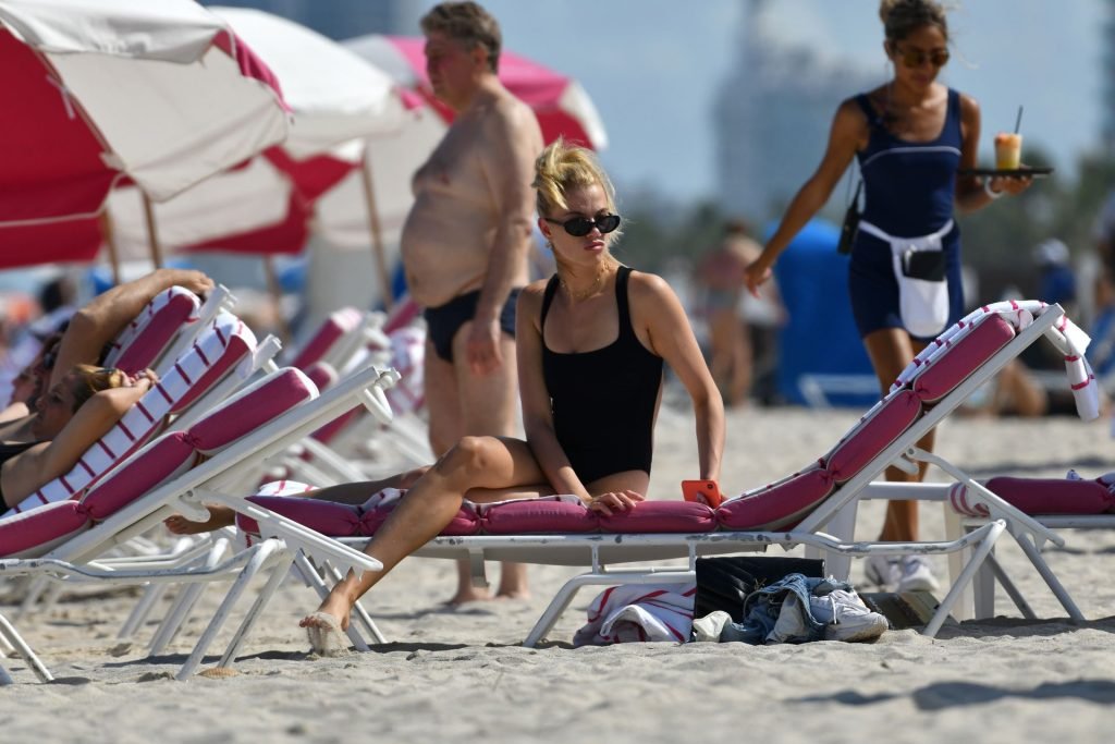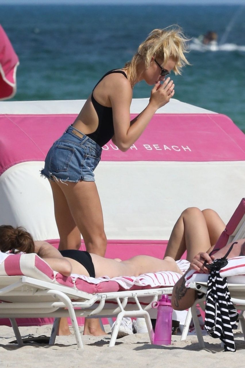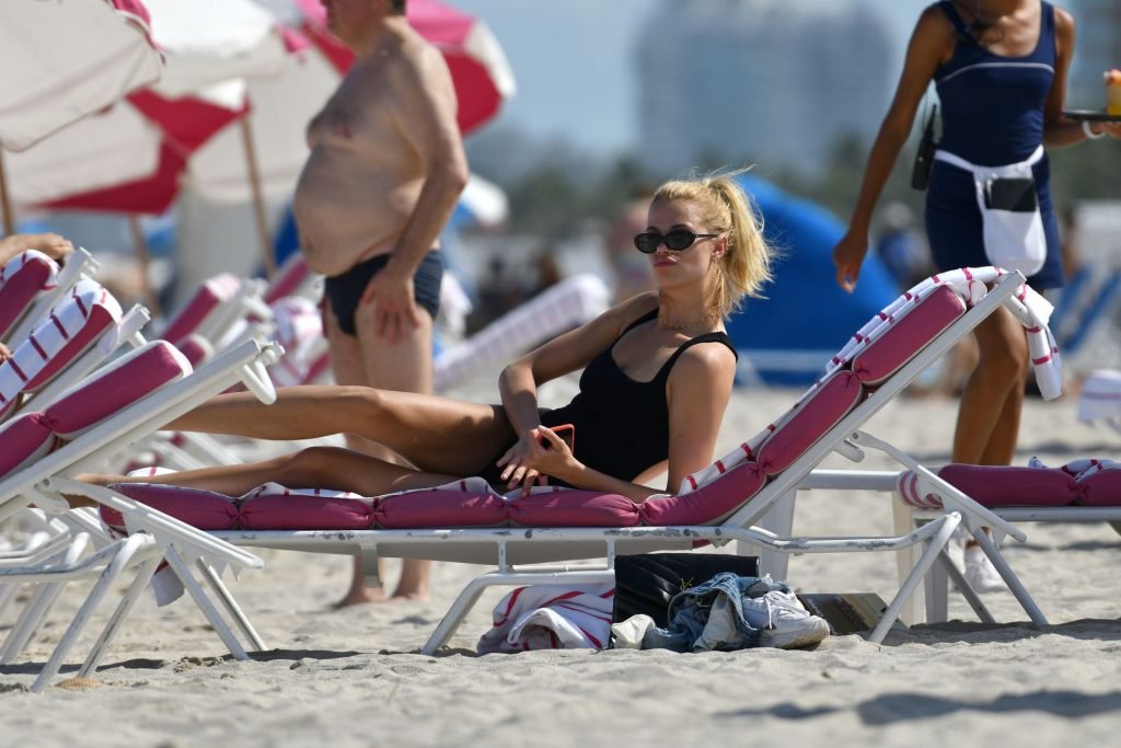 Hailey Clauson sonríe para las cámaras mientras termina su viaje a la playa en Miami, 09/05/2019. La modelo de Sports Illustrated Swimsuit lleva shorts de mezclilla con un traje de baño negro mientras carga sus zapatillas blancas y una bolsa de cuero negra para su tarde en la playa.