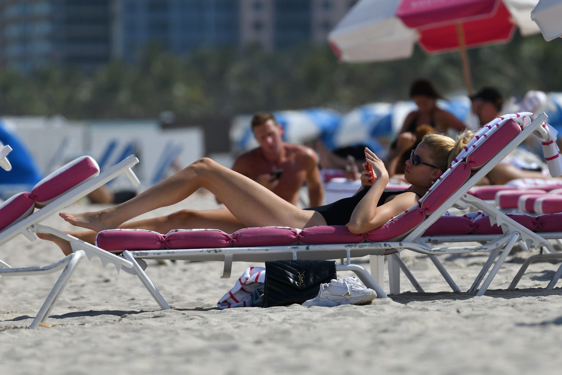 Hailey Clauson sonríe para las cámaras mientras termina su viaje a la playa en Miami, 09/05/2019. La modelo de Sports Illustrated Swimsuit lleva shorts de mezclilla con un traje de baño negro mientras carga sus zapatillas blancas y una bolsa de cuero negra para su tarde en la playa.