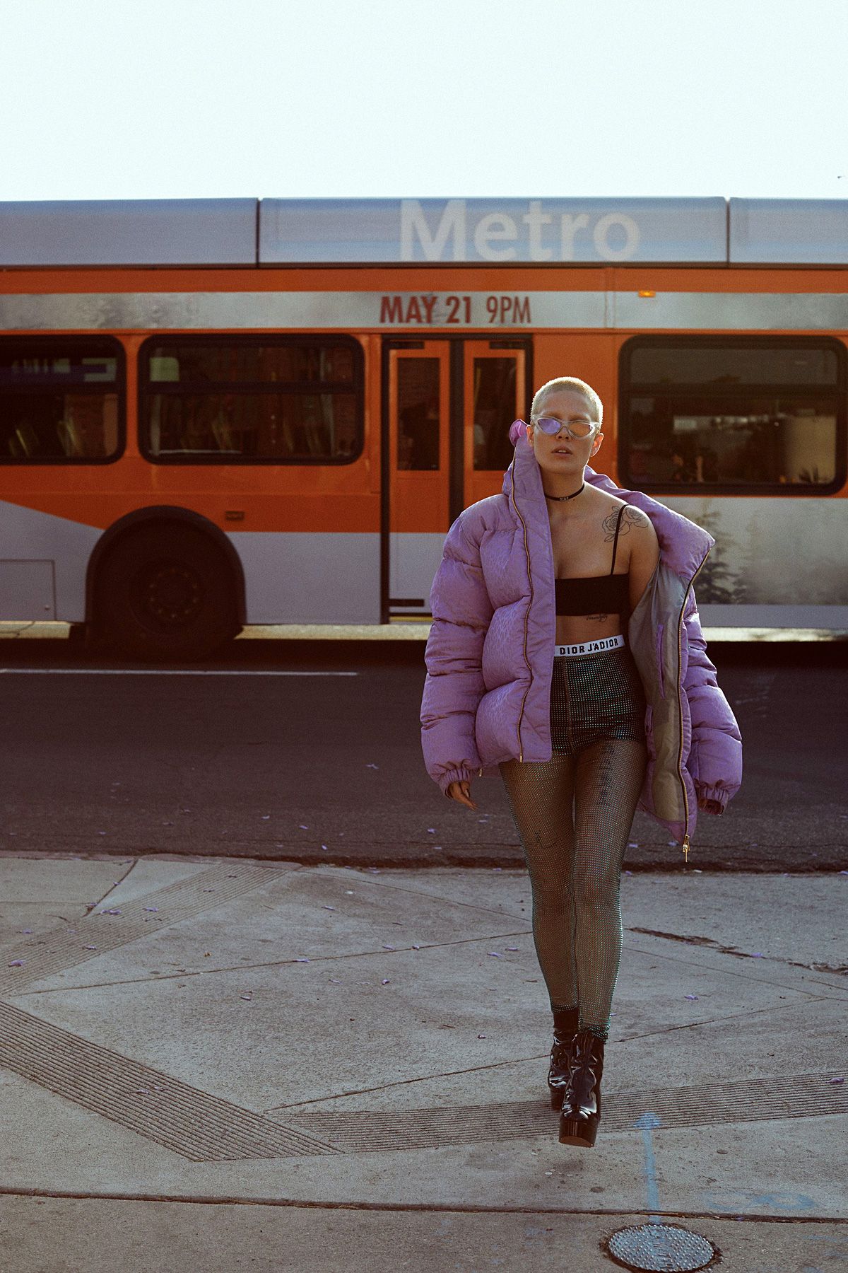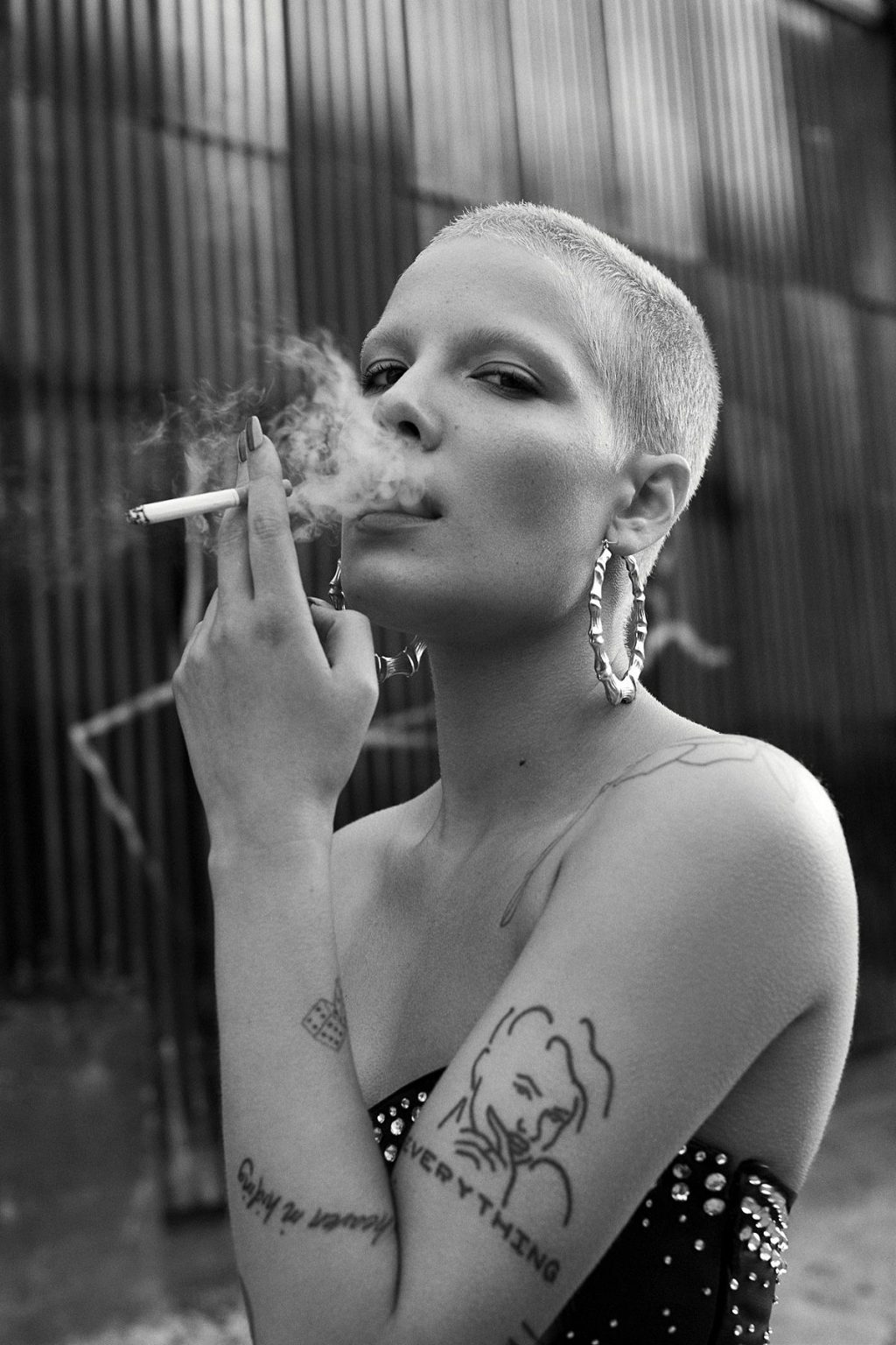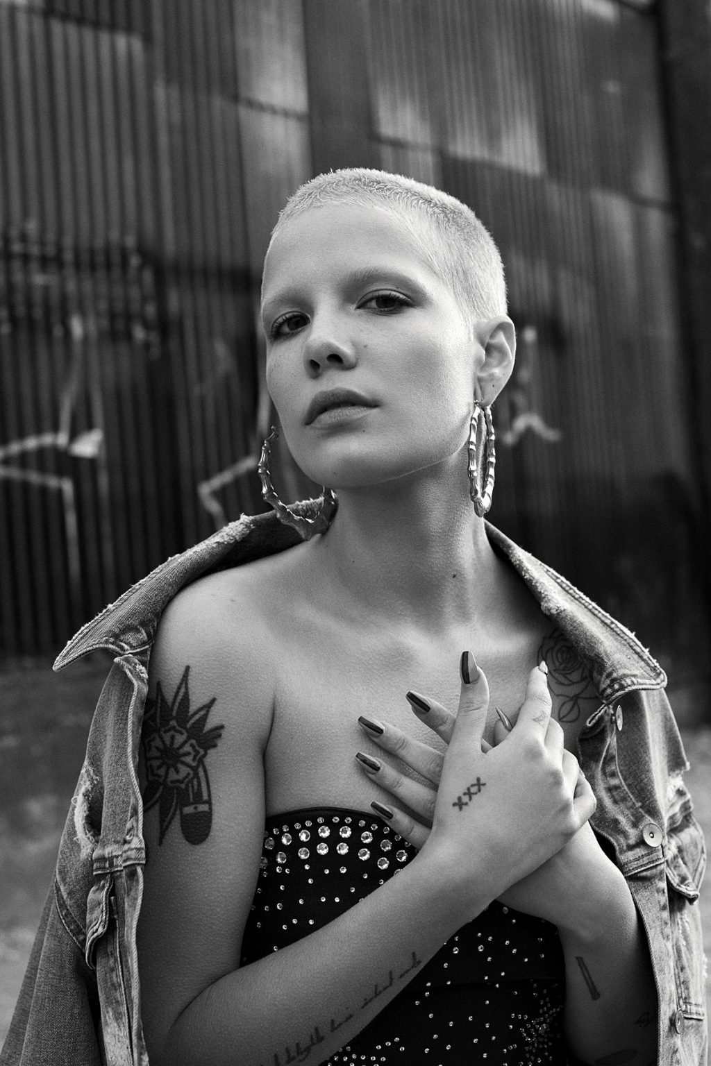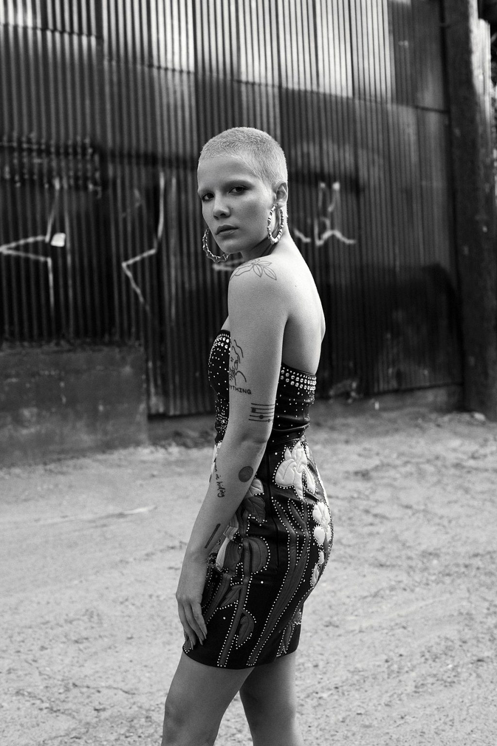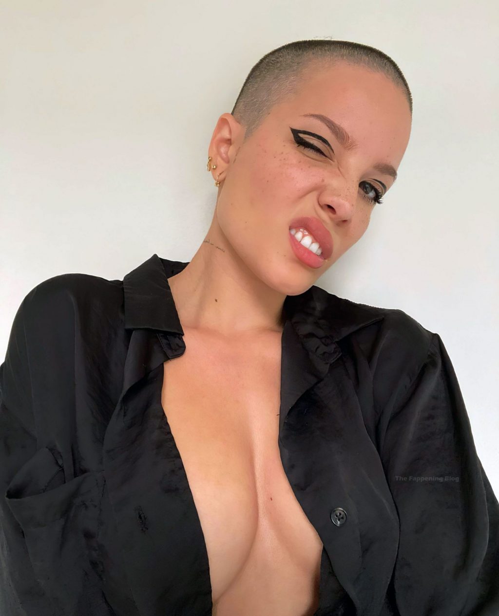 Alright, folks, so let’s take a look at some newer pics of our dear crazy-ass bitch! Halsey has yet again gone through a mental health issue. And this time, she shaved down all of her hair, put on some skanky make-up, and unbuttoned her shirt! And here are some pictures of that!