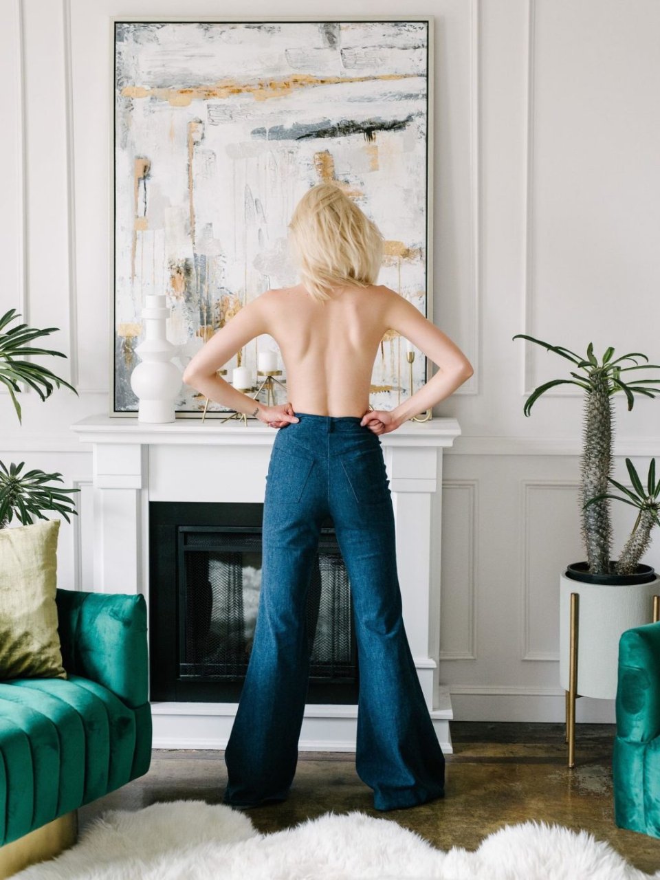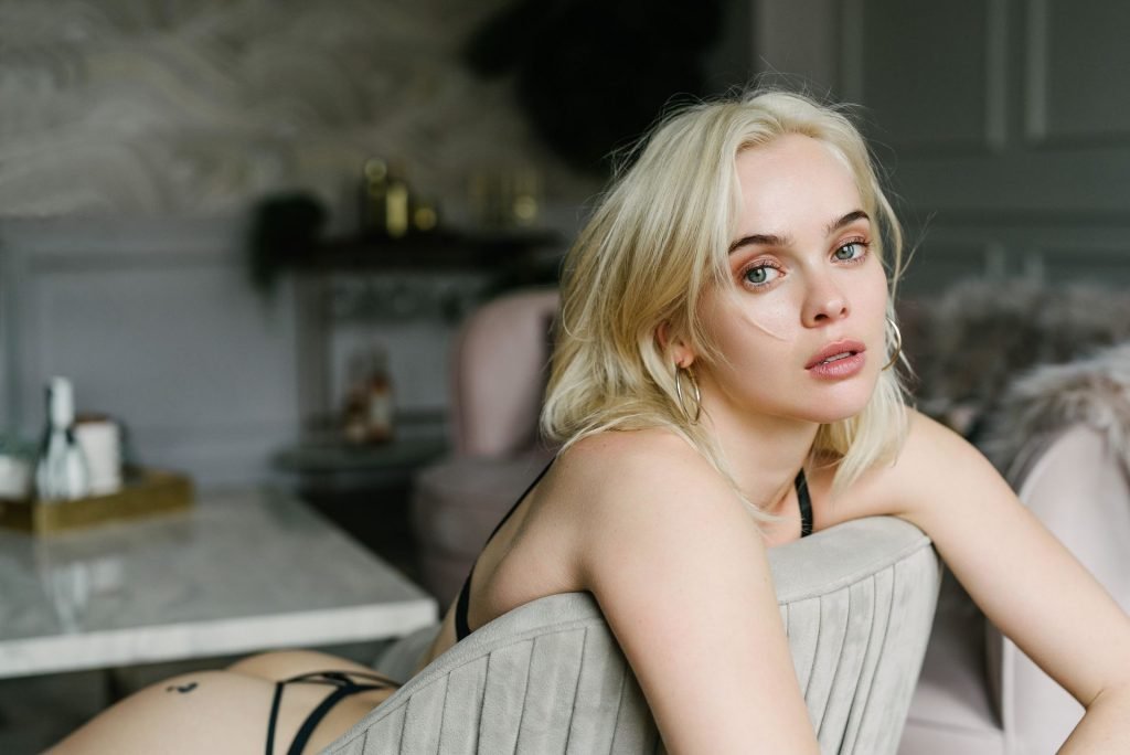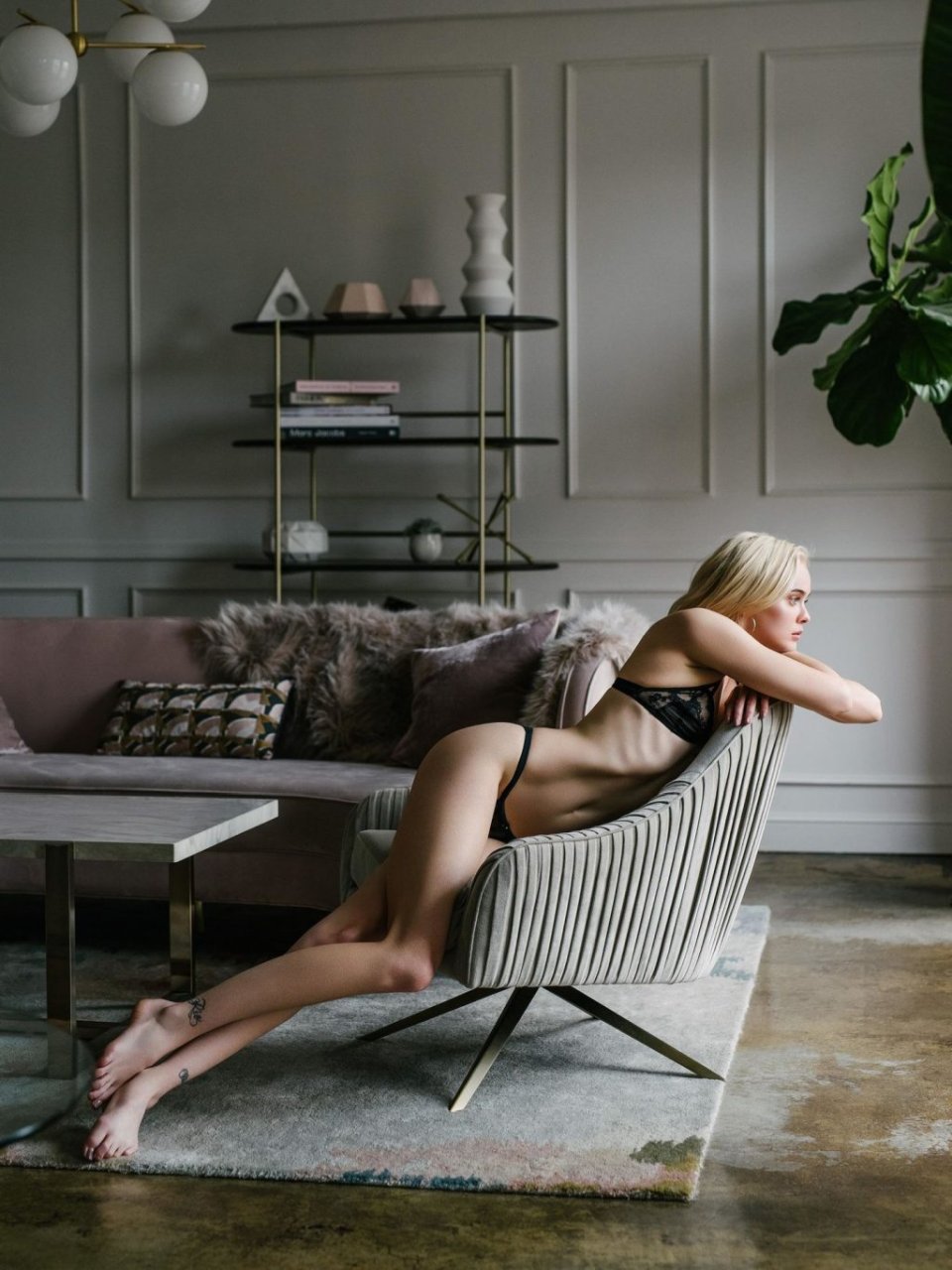 Casi perfecta, la delgada modelo Hannah Glasby posa sin camiseta y en lencería en una sesión de fotos realizada por Jeffrey Chan (2019). Sus pequeños tatuajes en el trasero y el pecho se ven interesantes.
