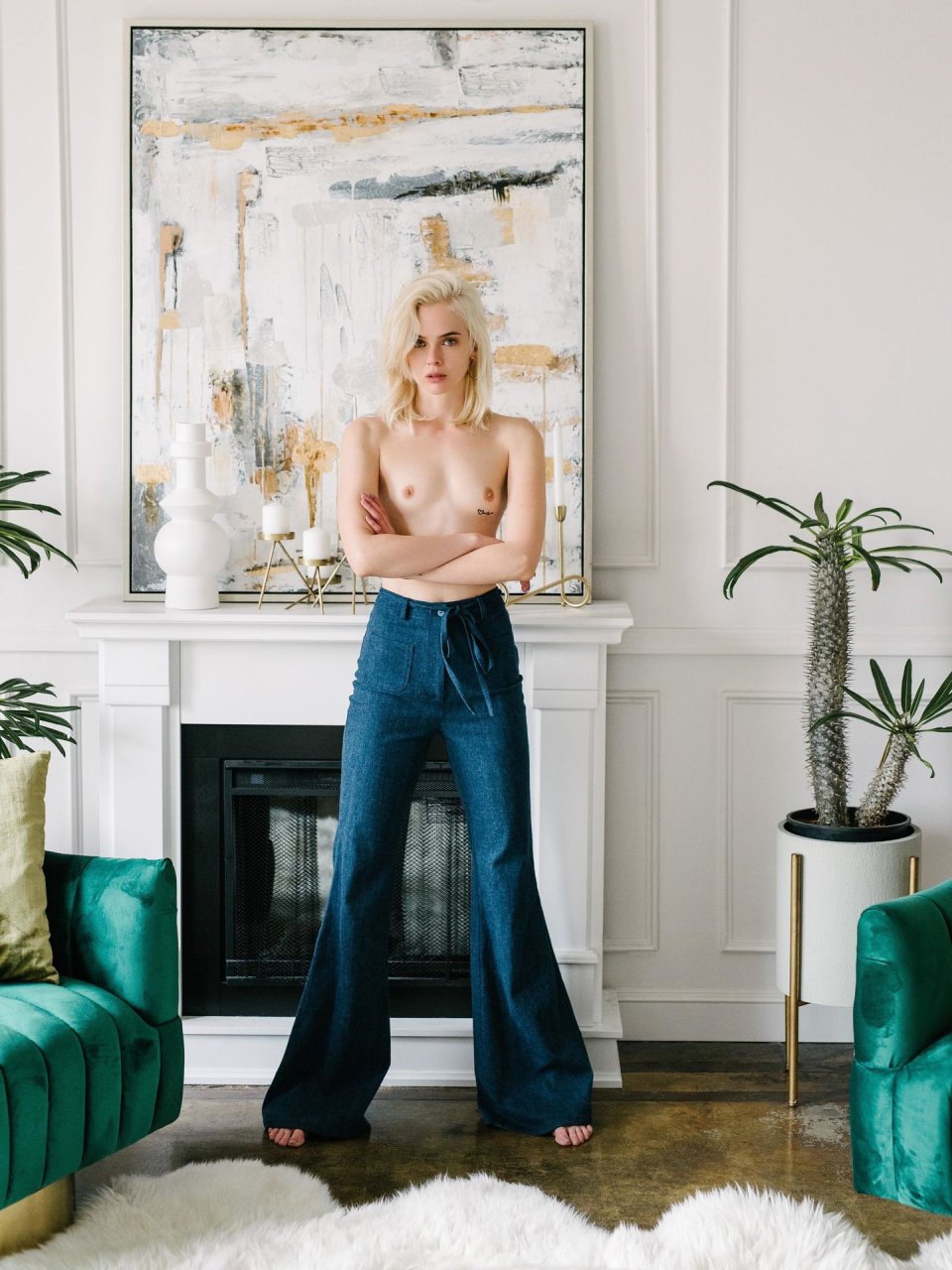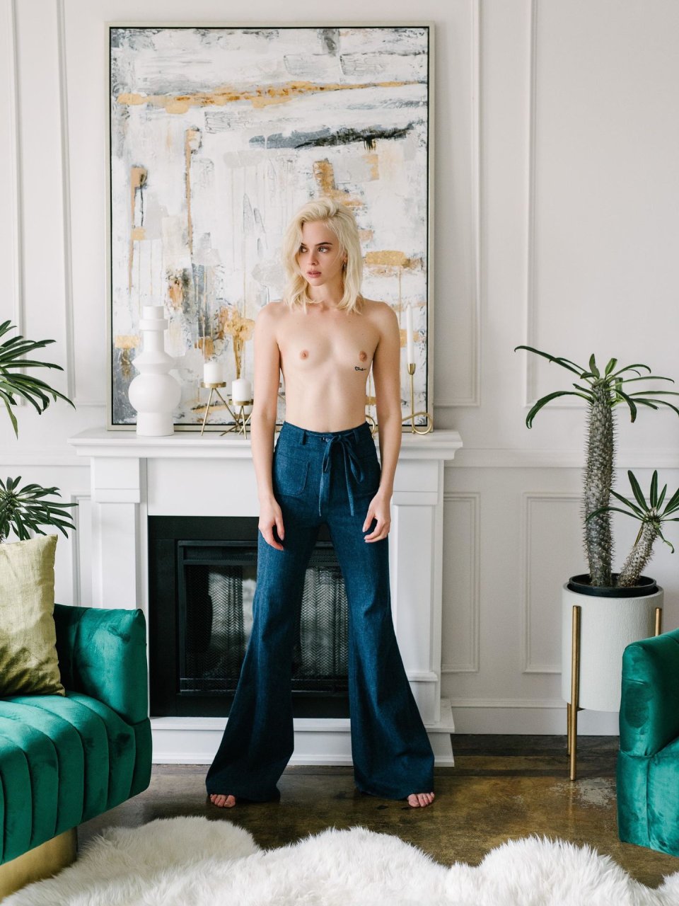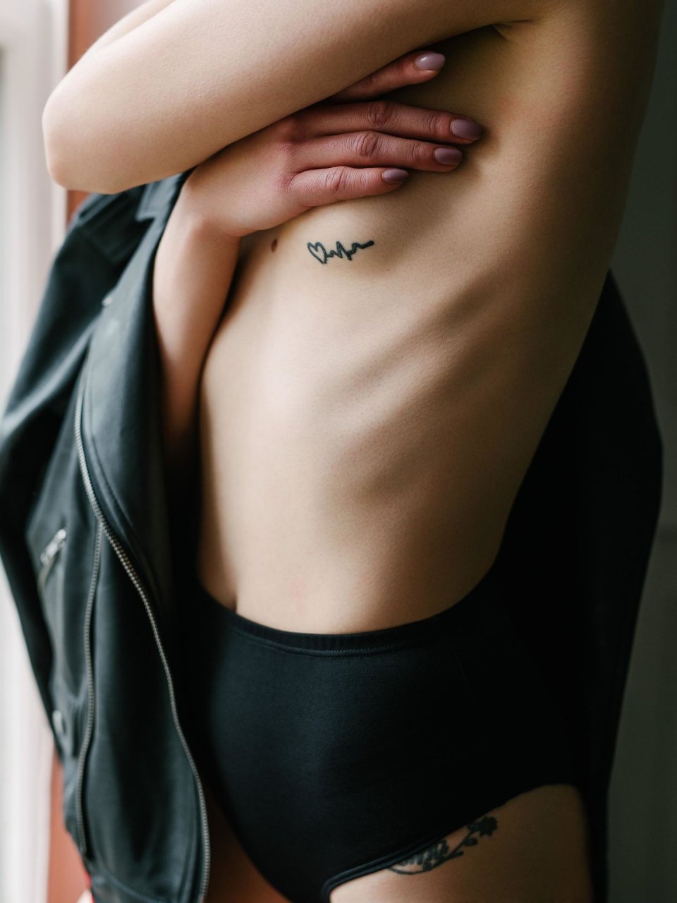 Casi perfecta, la delgada modelo Hannah Glasby posa sin camiseta y en lencería en una sesión de fotos realizada por Jeffrey Chan (2019). Sus pequeños tatuajes en el trasero y el pecho se ven interesantes.