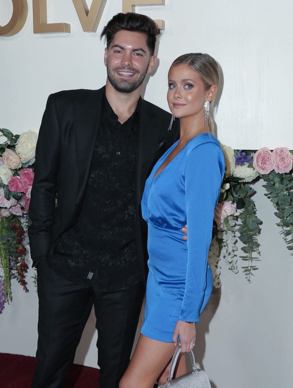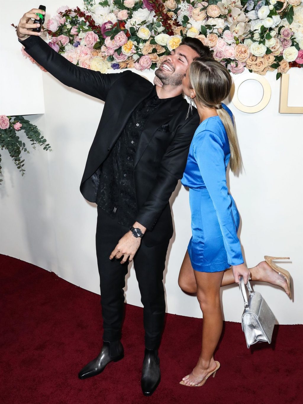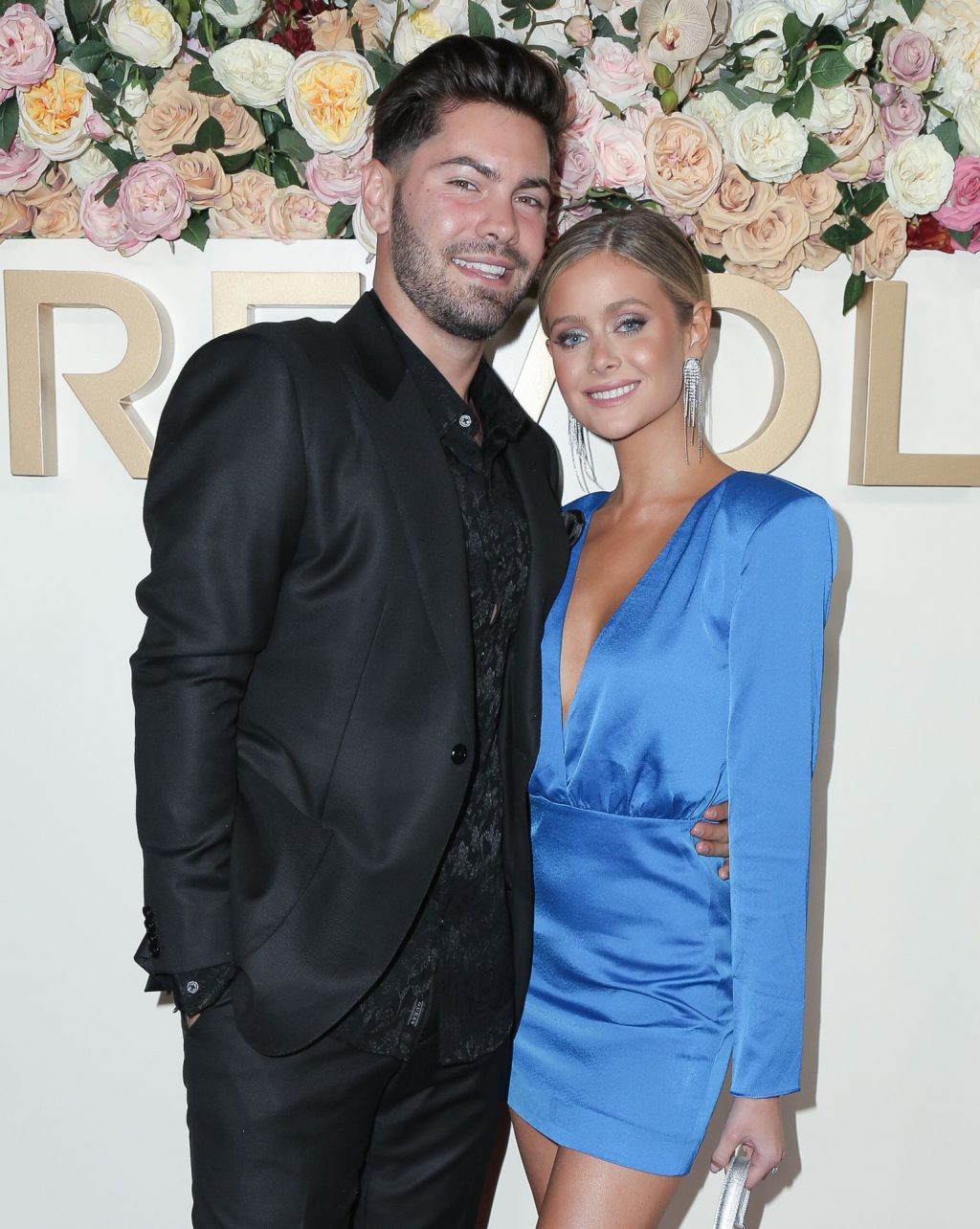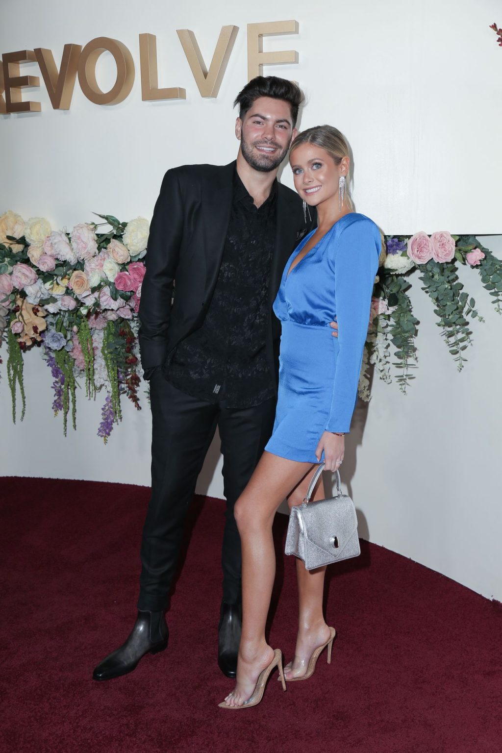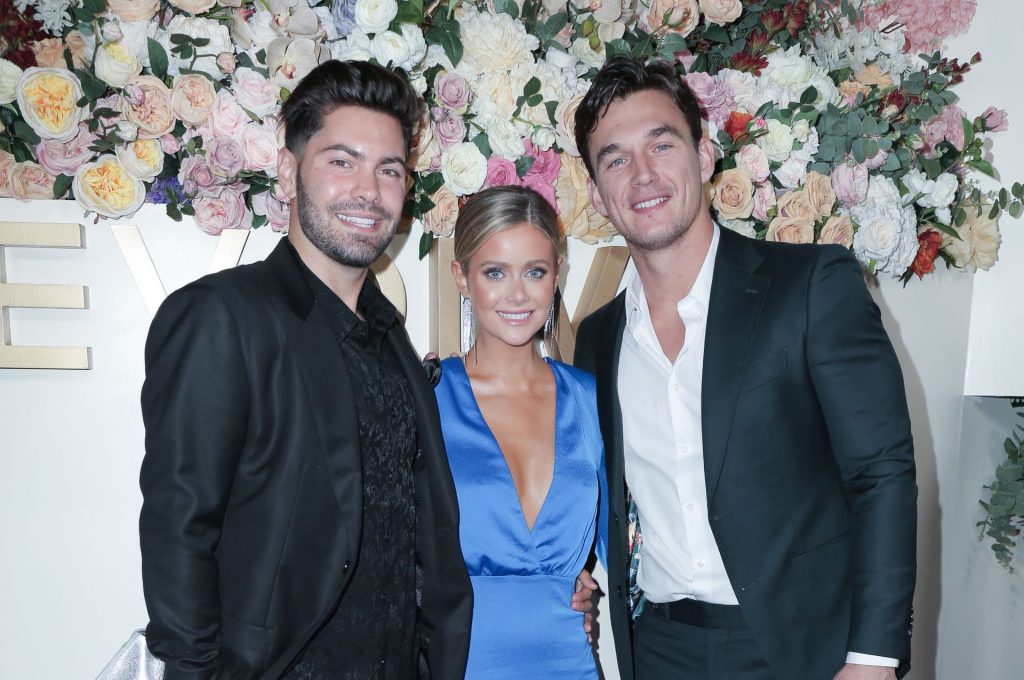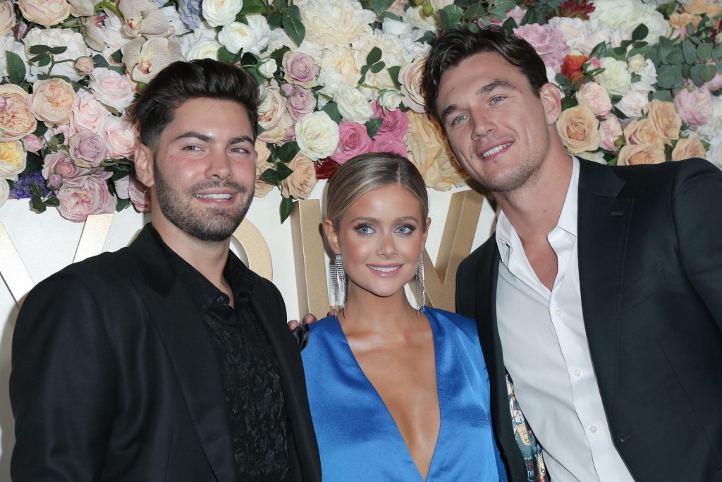 Modelo de piernas largas y estrella de reality TV Hannah Godwin fue fotografiada con Dylan Barbour y Tyler Cameron en la alfombra roja de los 3ros Premios Anuales #REVOLVEawards 2019 celebrados en Goya Studios en Hollywood, 15/11/2019.