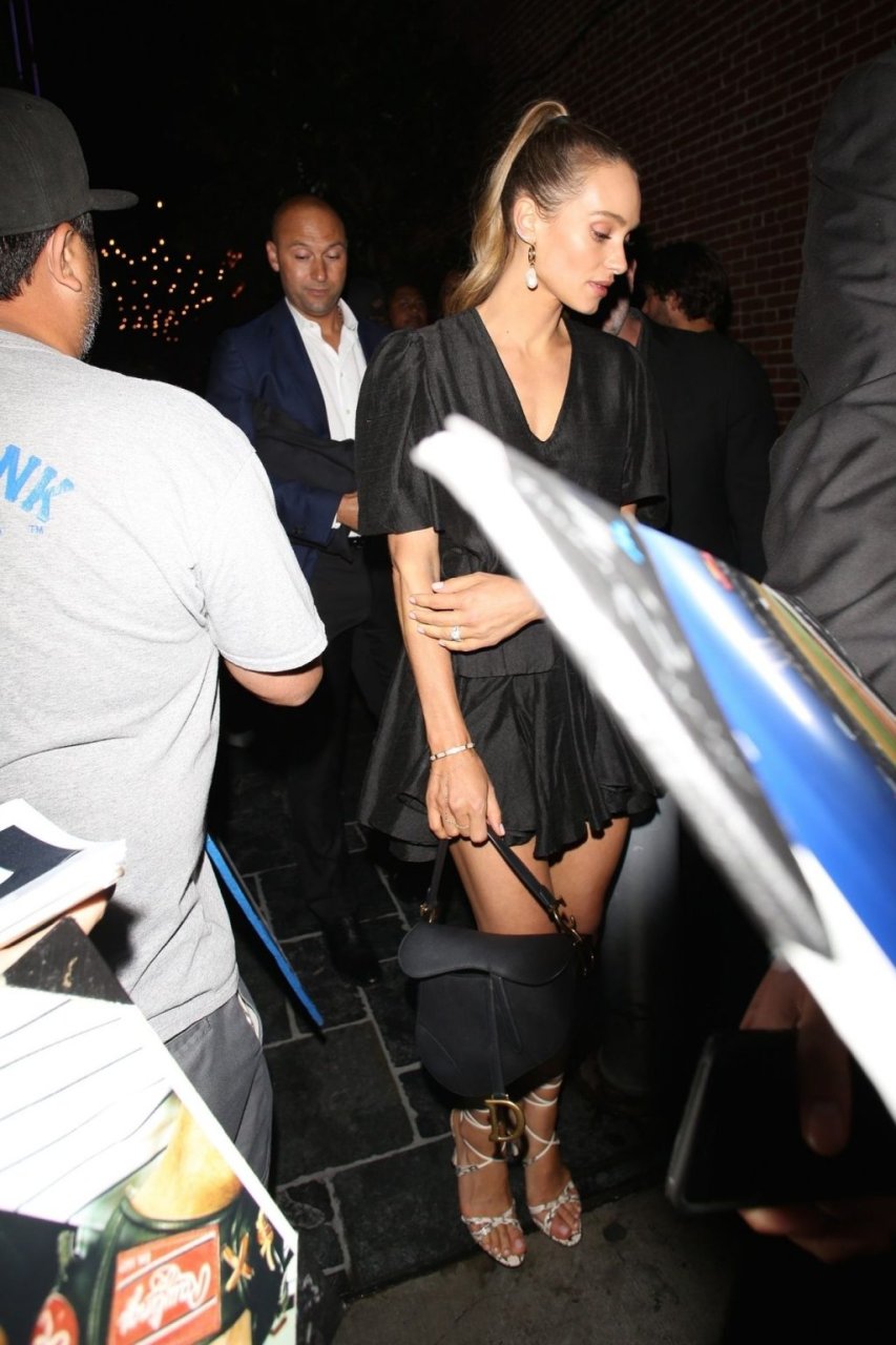 Derek Jeter y su esposa, la modelo de Sports Illustrated Swimsuit, Hannah Jeter, fueron vistos en una fiesta previa a los premios ESPYs en Hollywood, 07/09/2019. La pareja fue vista saliendo de Dream Hollywood la noche antes de los premios. La esposa de Jeter sonrió y saludó a los fans mientras Jeter firmaba recuerdos.