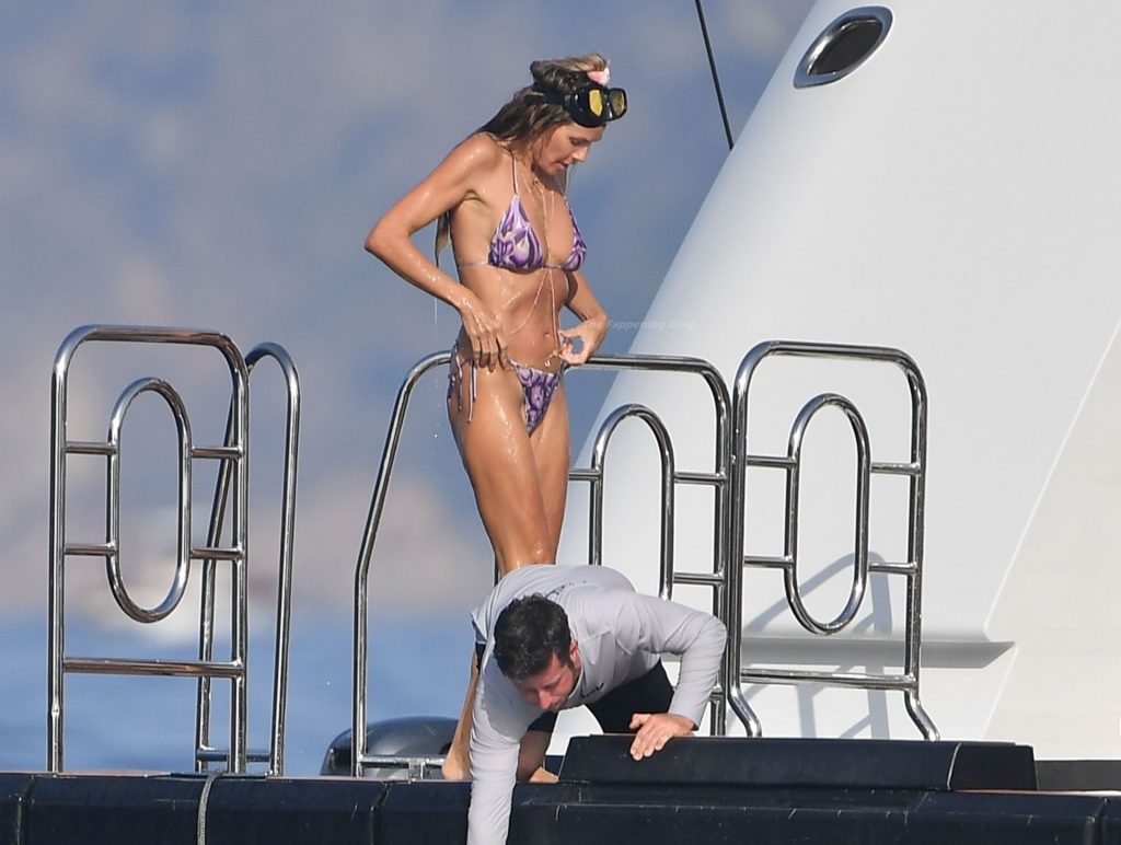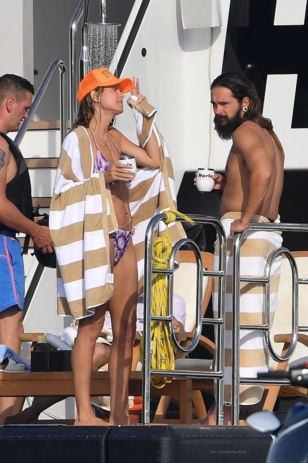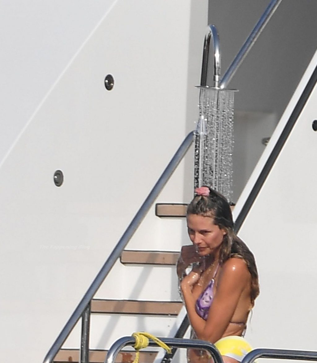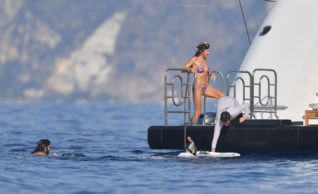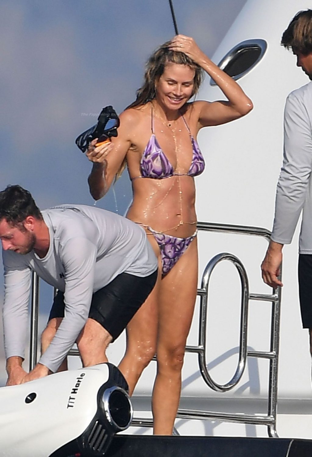 Disfrutando del intenso calor italiano en su lujoso yate en el Mediterráneo, la modelo alemana Heidi Klum irradiaba atractivo sexual, luciendo su diminuto bikini púrpura durante sus vacaciones italianas bañadas por el sol (julio de 2021).