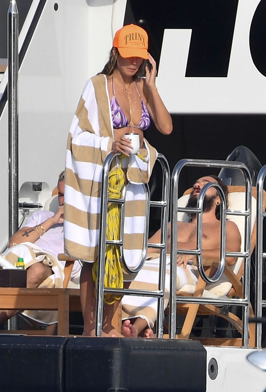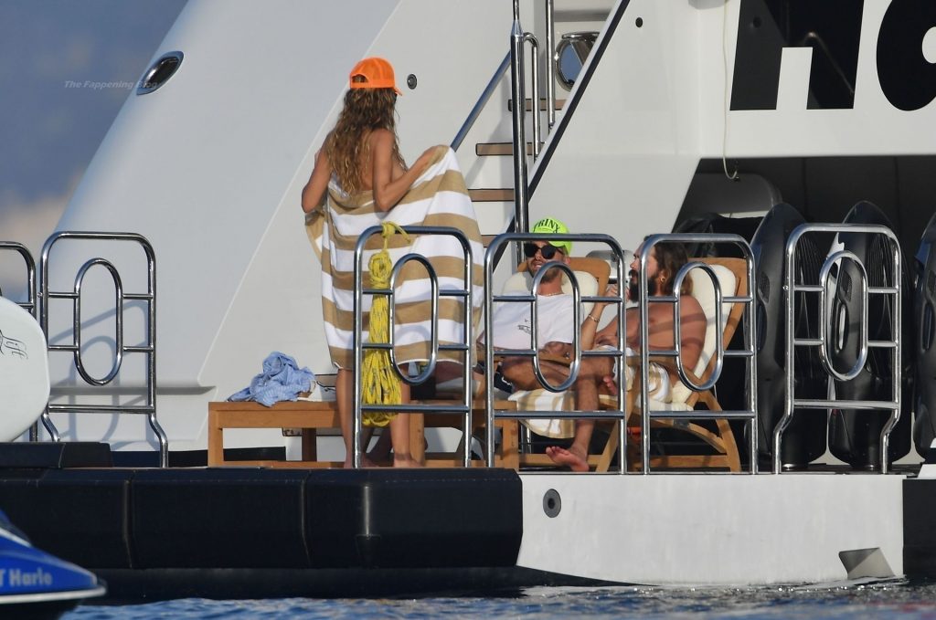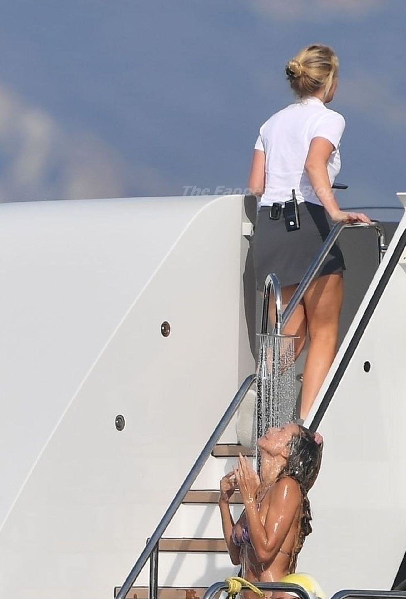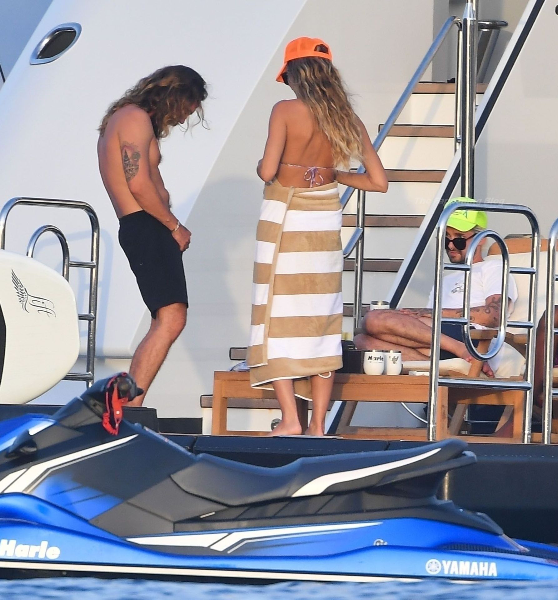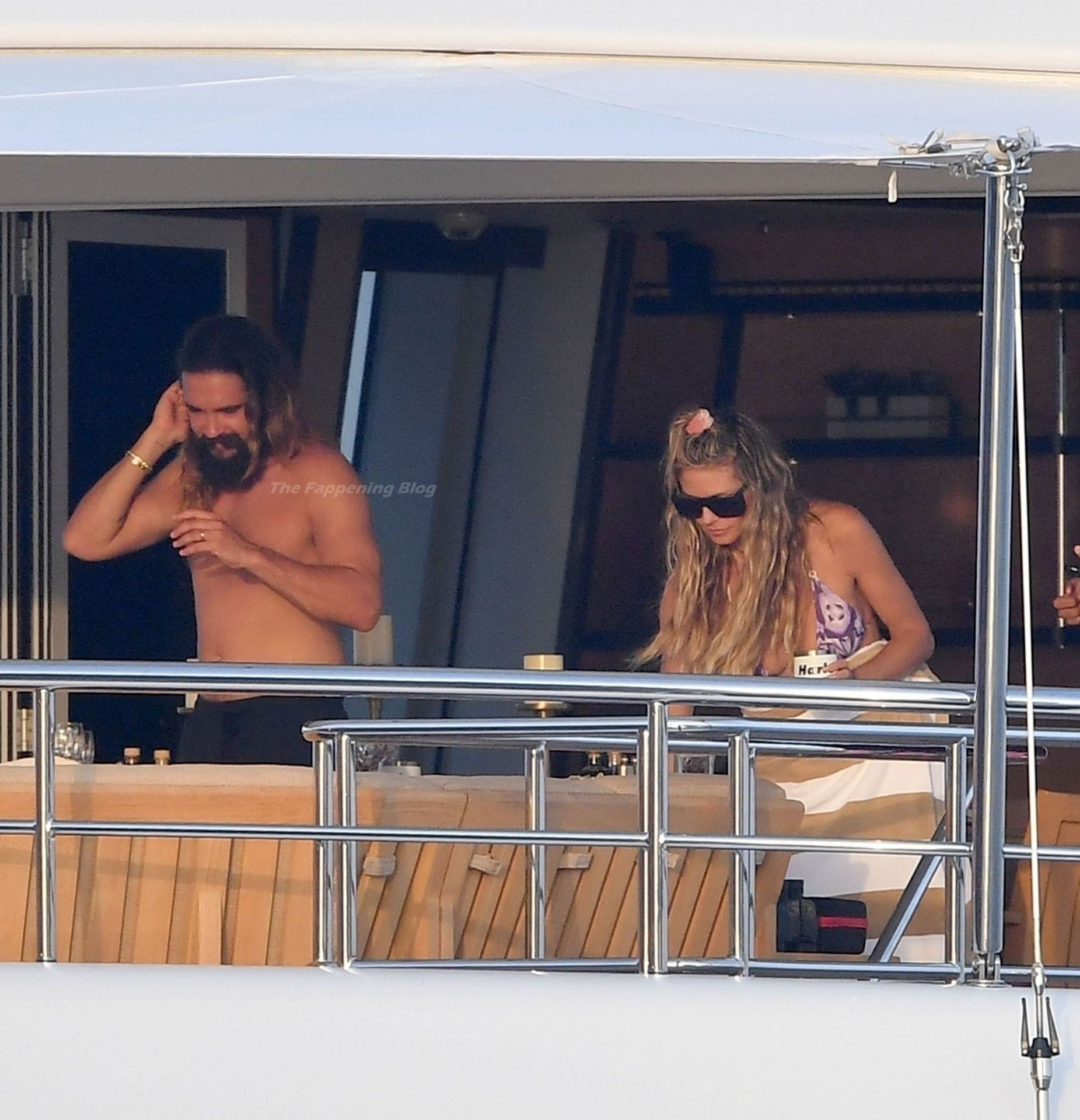 Disfrutando del intenso calor italiano en su lujoso yate en el Mediterráneo, la modelo alemana Heidi Klum irradiaba atractivo sexual, luciendo su diminuto bikini púrpura durante sus vacaciones italianas bañadas por el sol (julio de 2021).