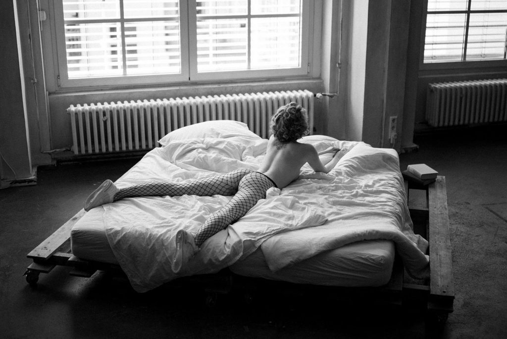 Modelo adulta Heidi Romanova posa desnuda con medias de red y zapatillas en una sesión fotográfica de Sacha Leyendecker (2019).