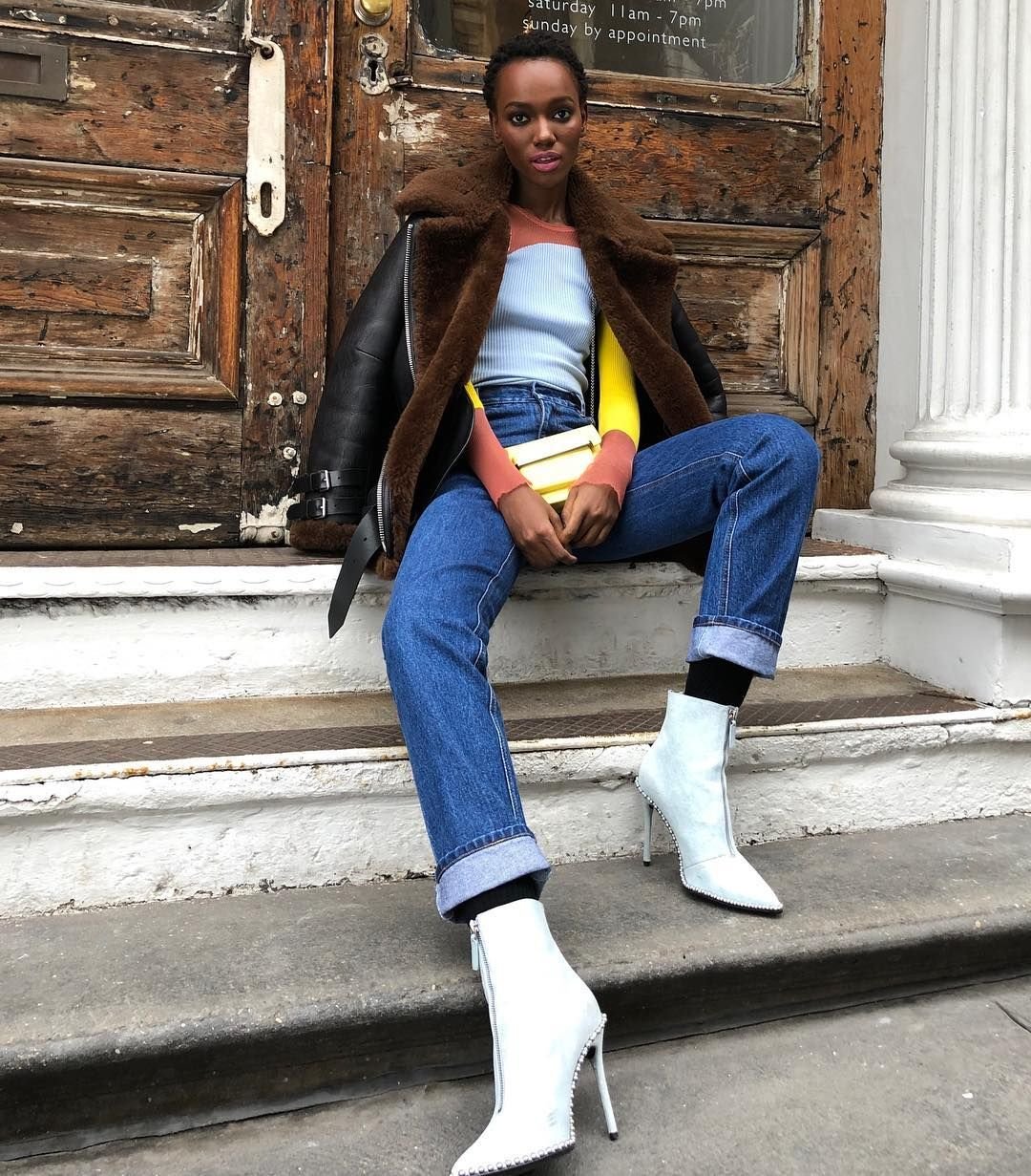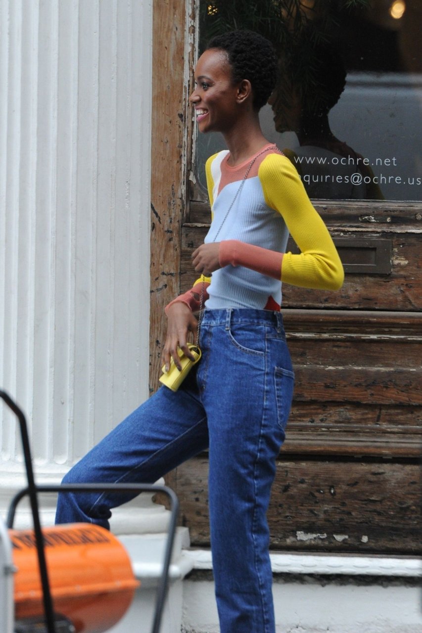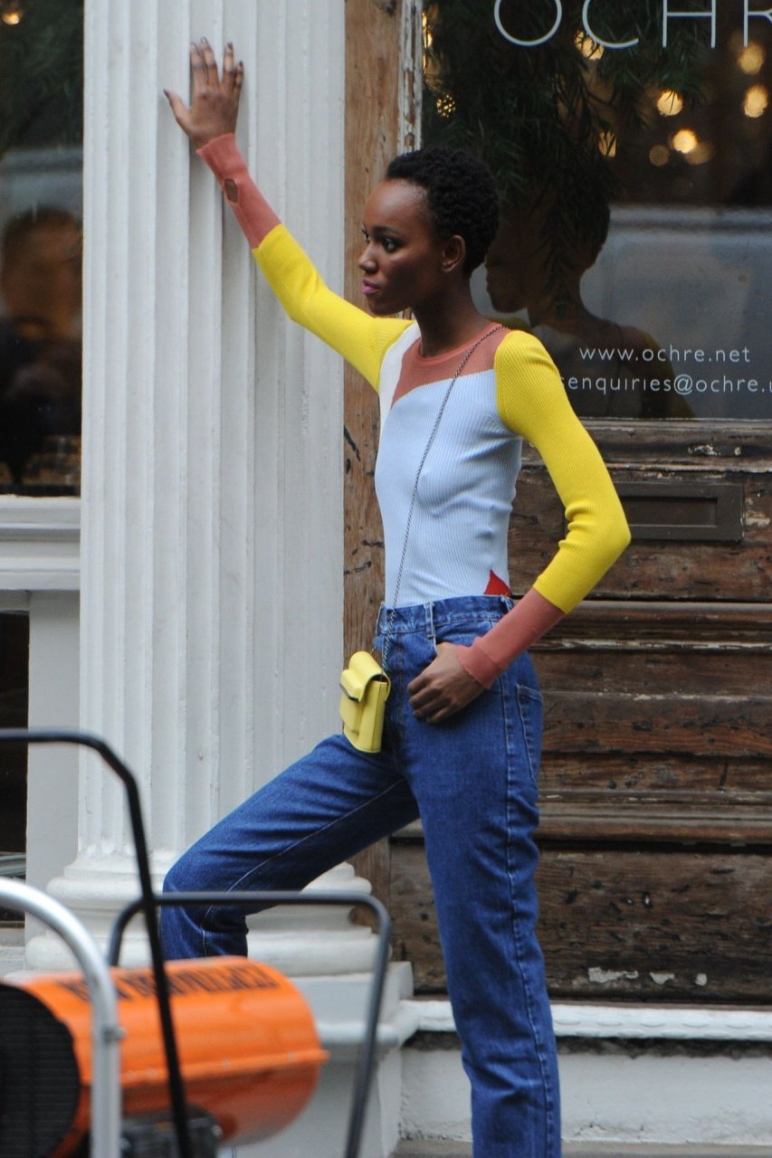 Modelo de moda, Herieth Paul, está en NYC posando sin sostén para una sesión de fotos en SoHo, 15/02/2019. La modelo tanzana lleva una sudadera acanalada de bloques de color combinada con jeans azules y un pequeño bolso amarillo.