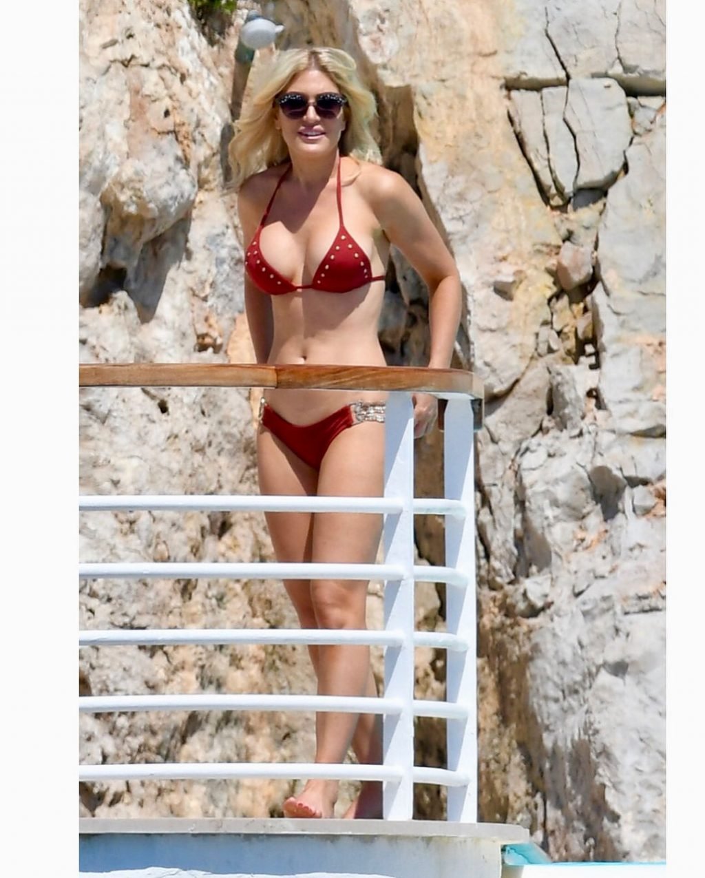 Hofit Golan muestra sus muy abundantes atributos en un traje de baño a rayas con escote pronunciado mientras disfrutaba de unas vacaciones de lujo en el Hotel Eden Roc en Antibes. 21/07/2018.