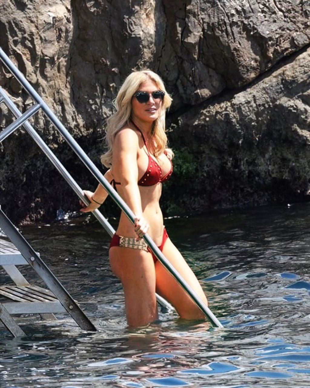 Hofit Golan muestra sus muy abundantes atributos en un traje de baño a rayas con escote pronunciado mientras disfrutaba de unas vacaciones de lujo en el Hotel Eden Roc en Antibes. 21/07/2018.