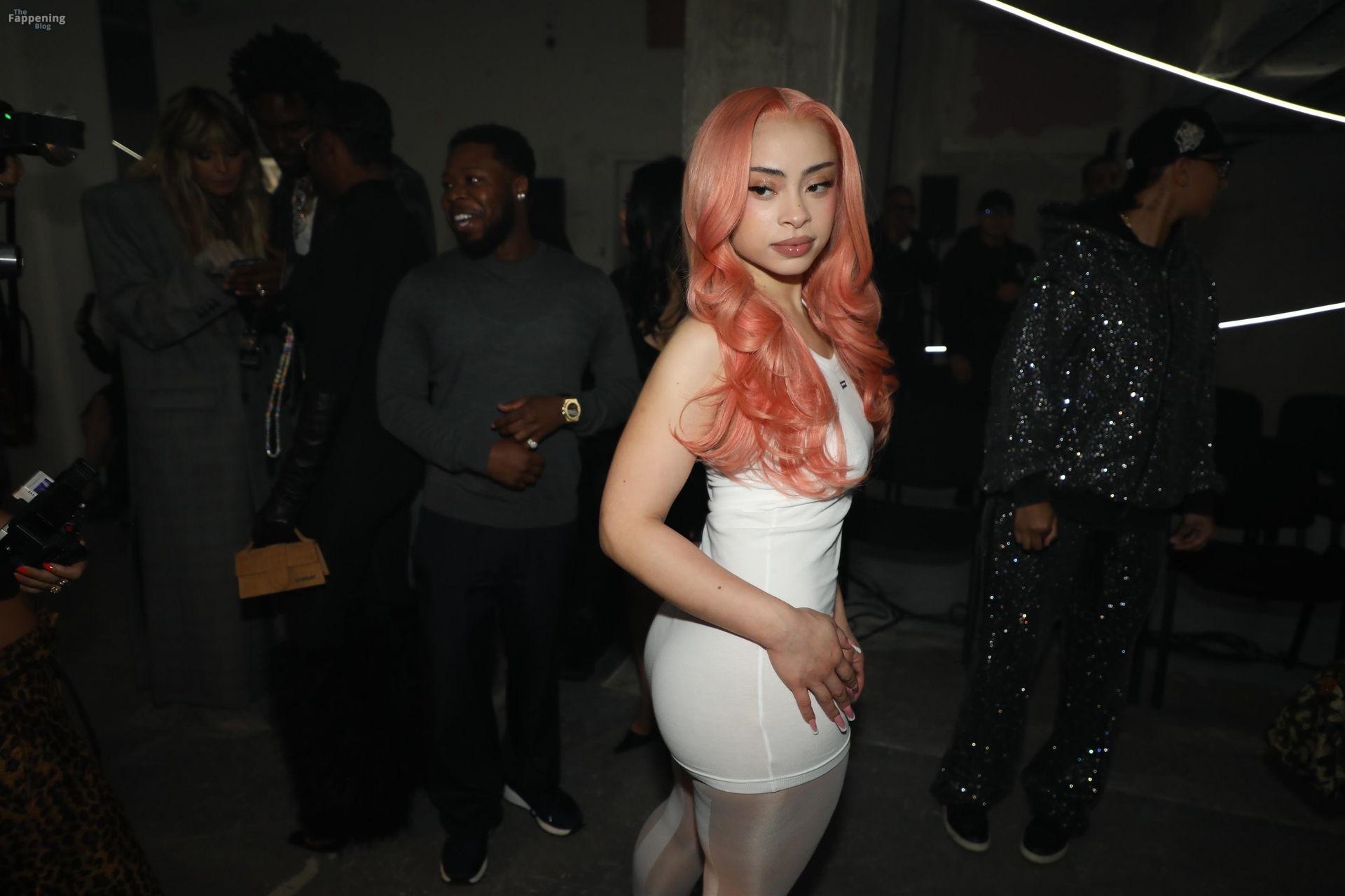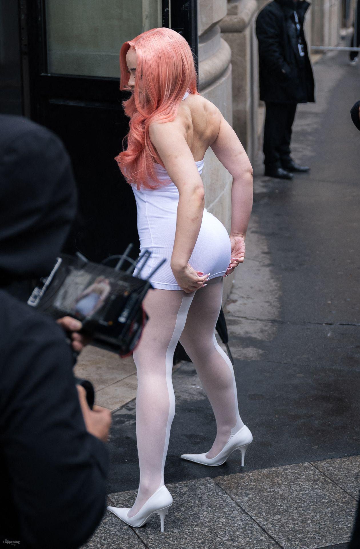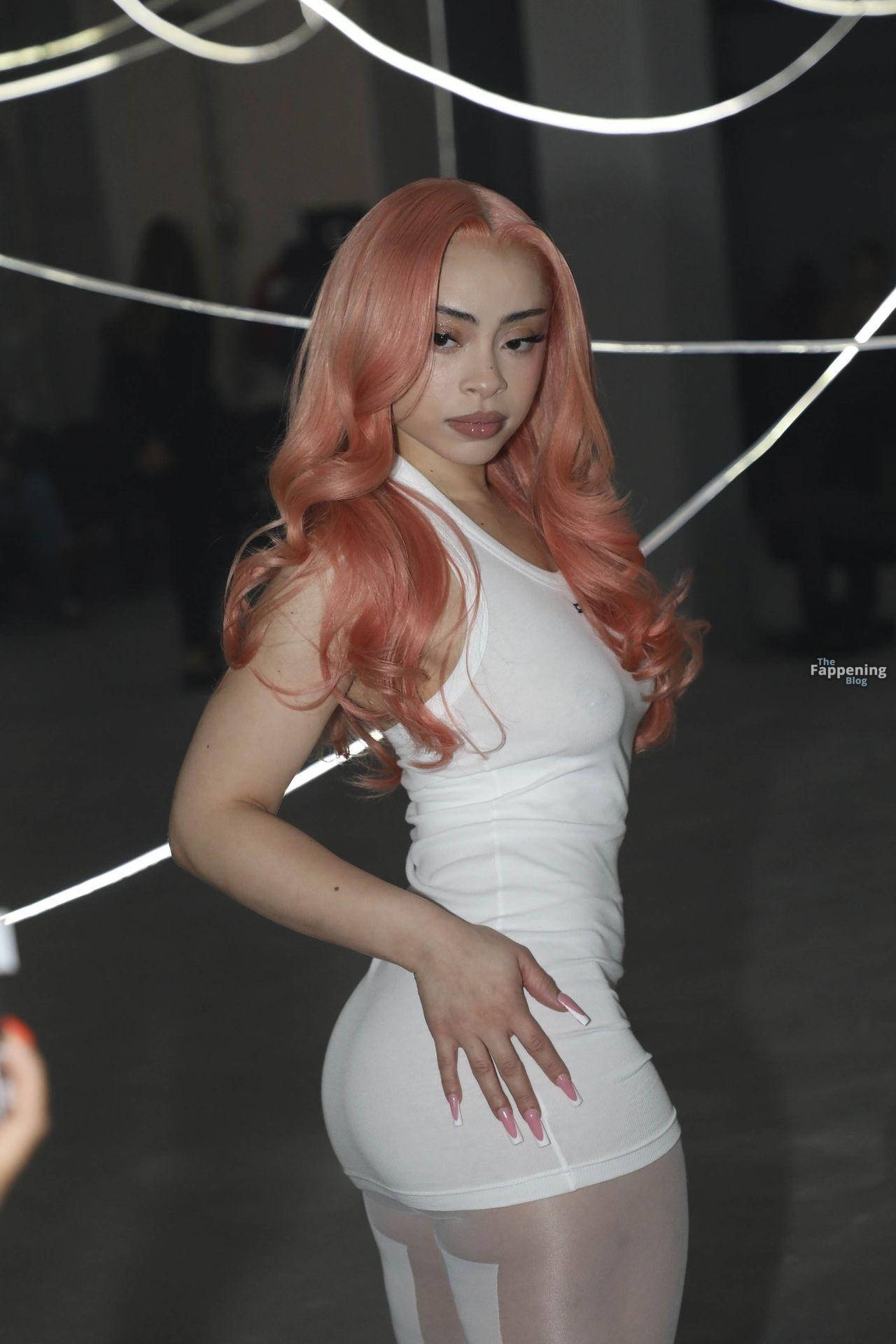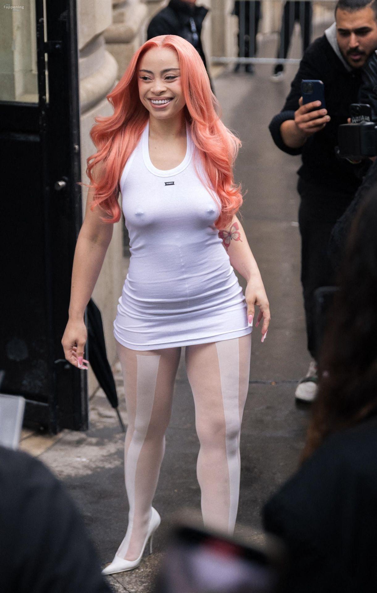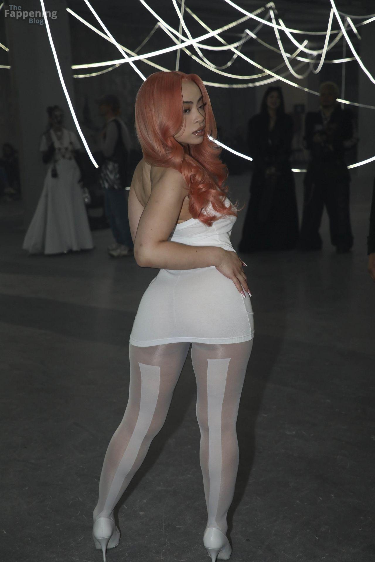 Ice Spice presume de sus atributos con un mini ajustado y medias transparentes en la Semana de la Moda de París de VETEMENTS.