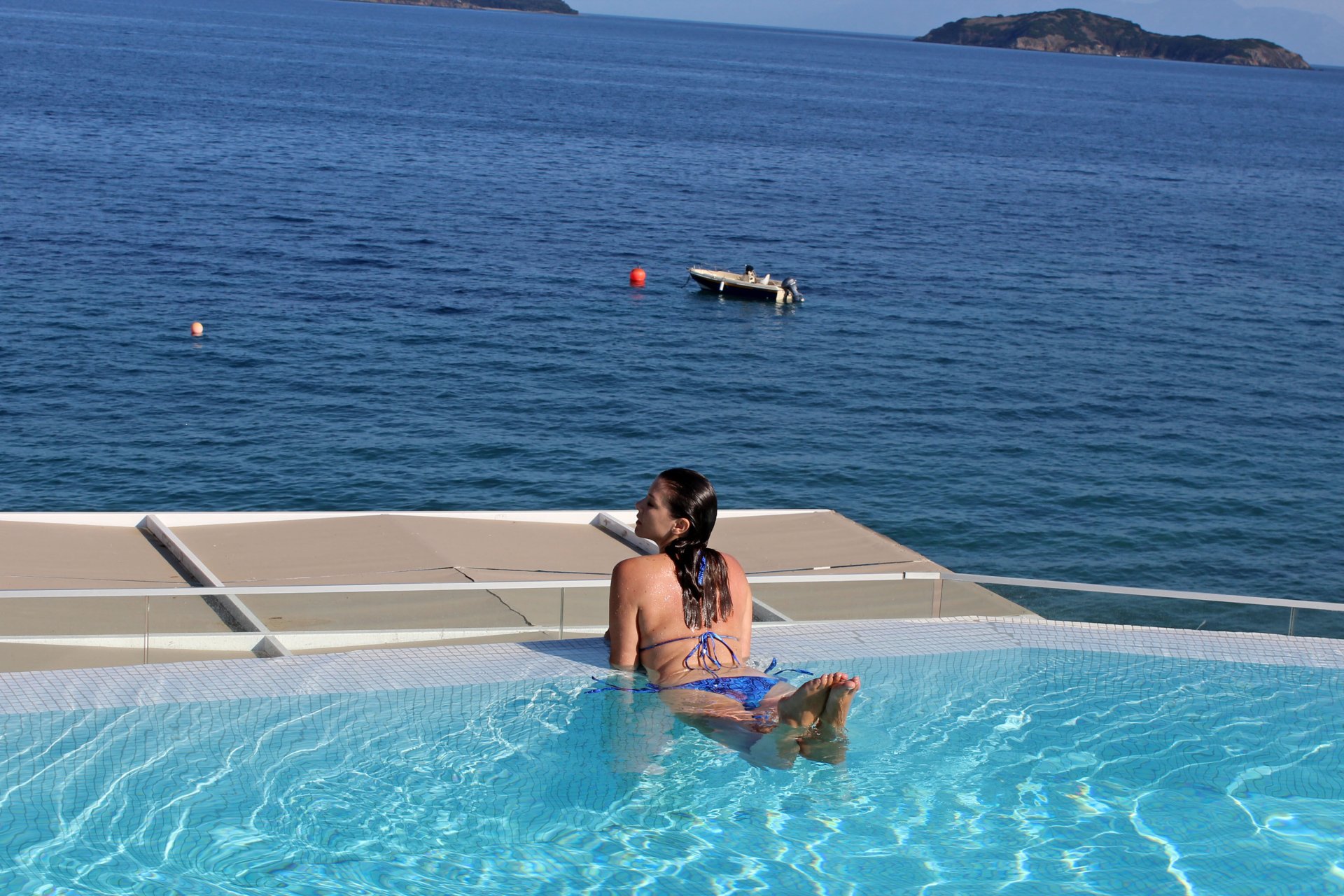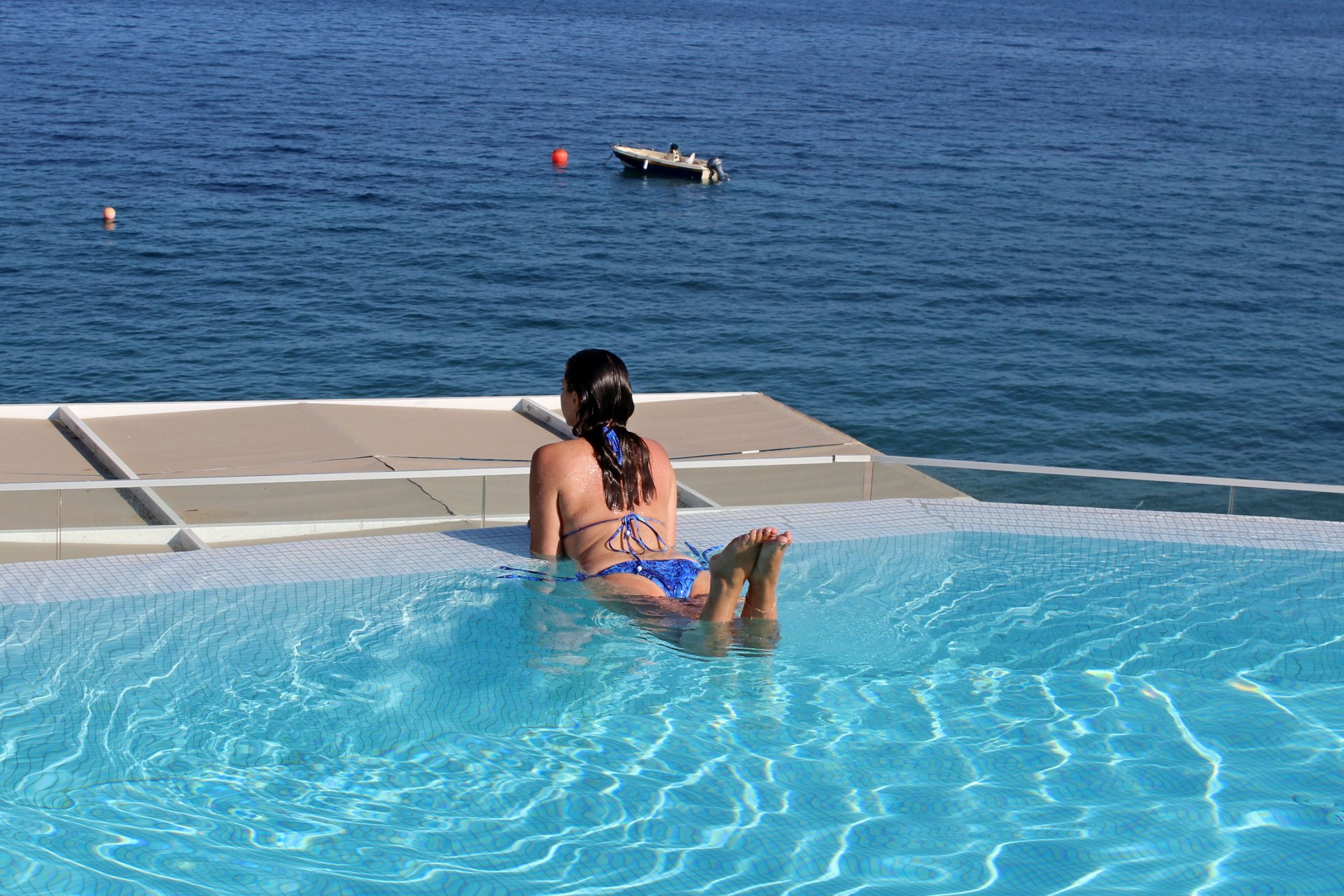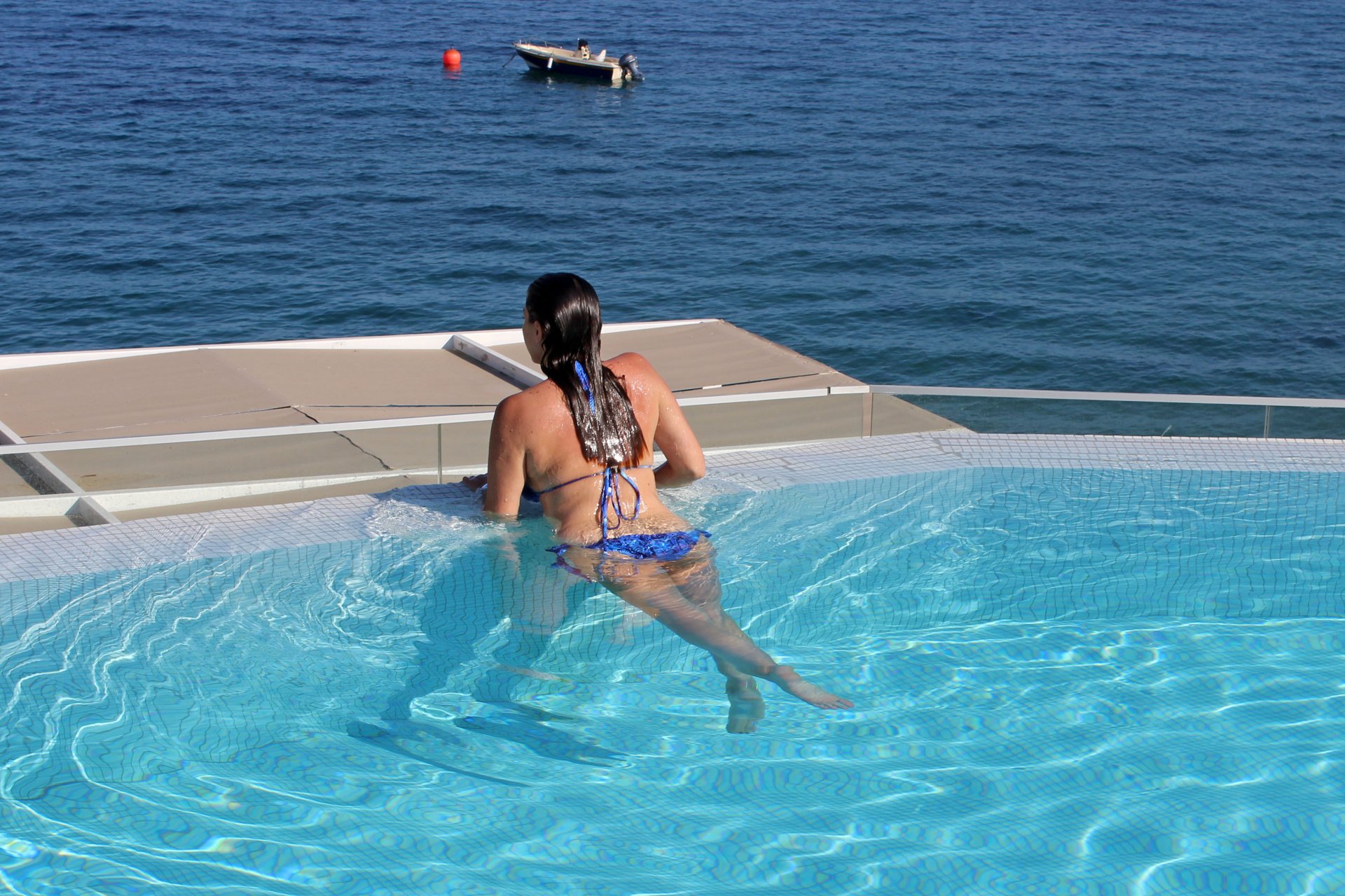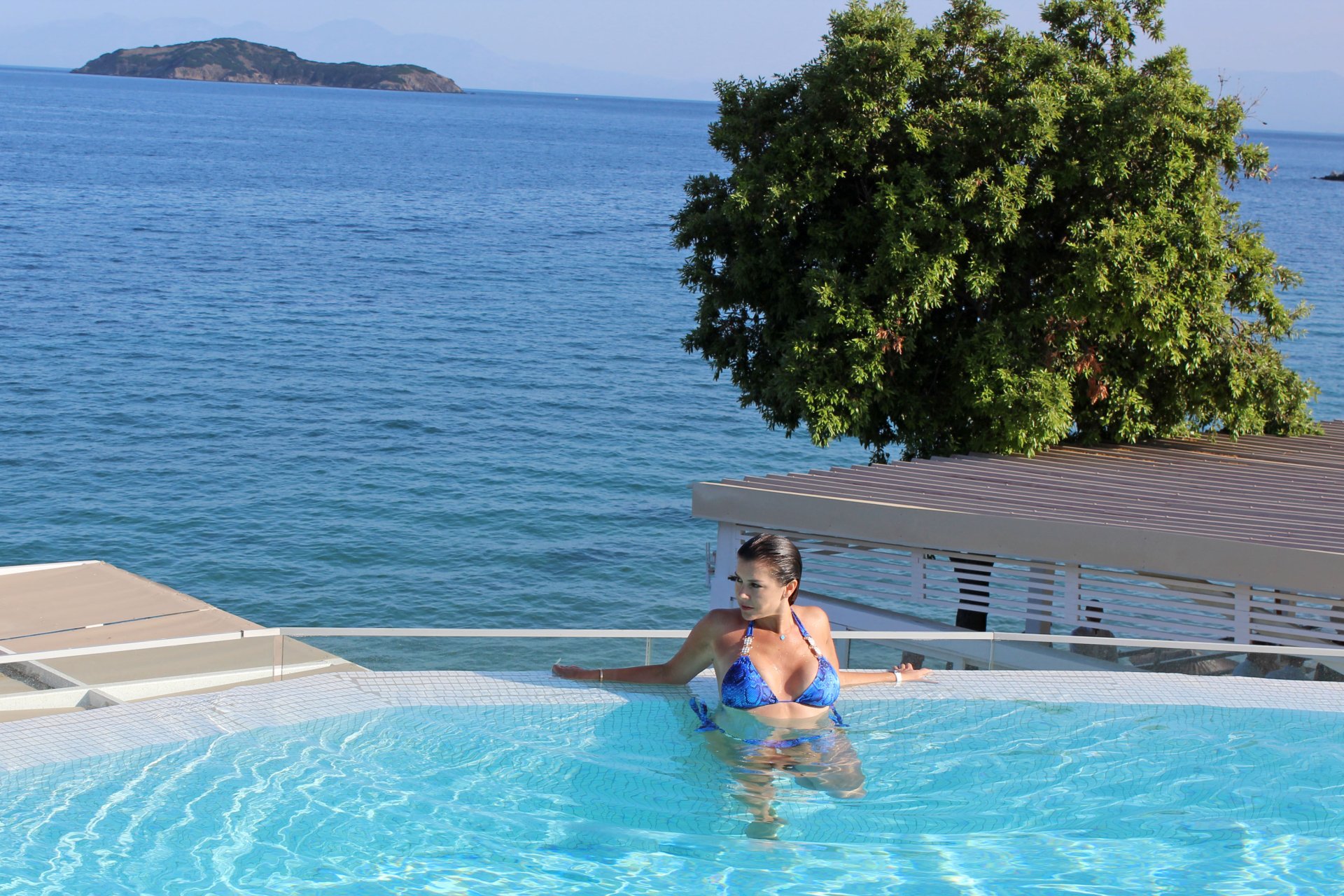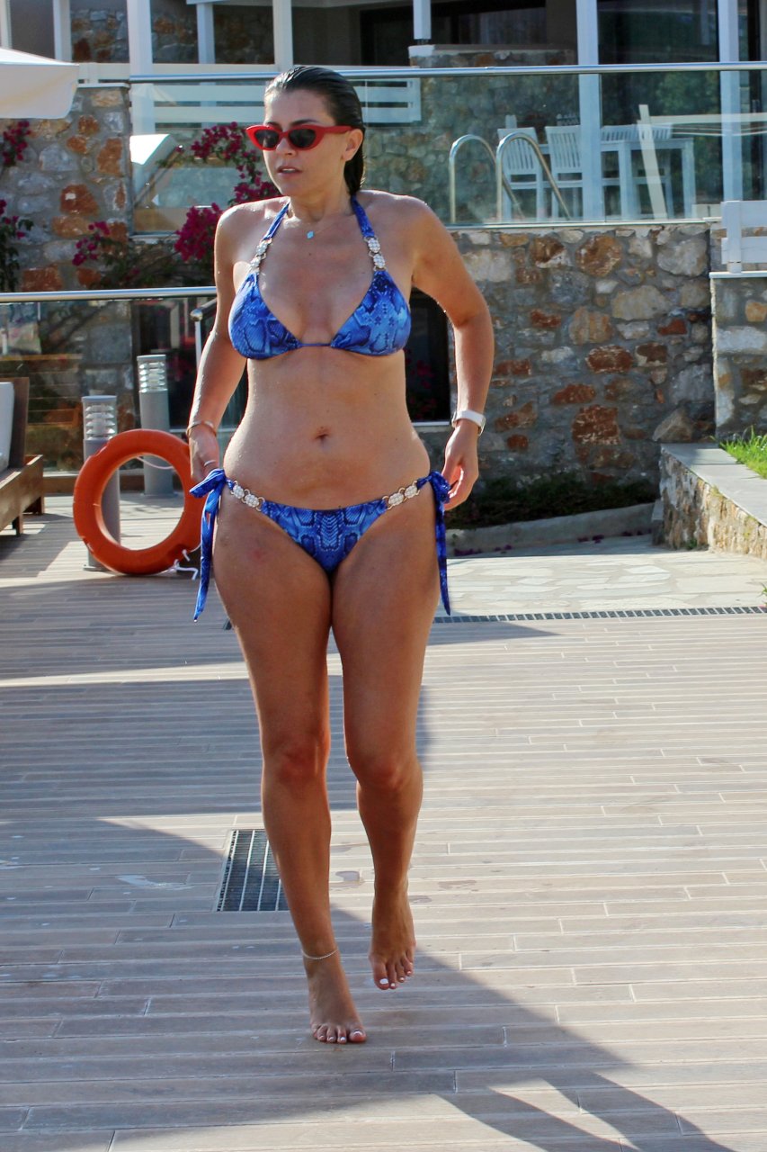 Imogen Thomas luce sensacional mientras refresca su cuerpo tonificado con un bikini azul de verano en una inmersión en la piscina en Magnisia, 29/05/2018. La madre soltera de 35 años estaba en Grecia asistiendo a la boda de su mejor amiga.
