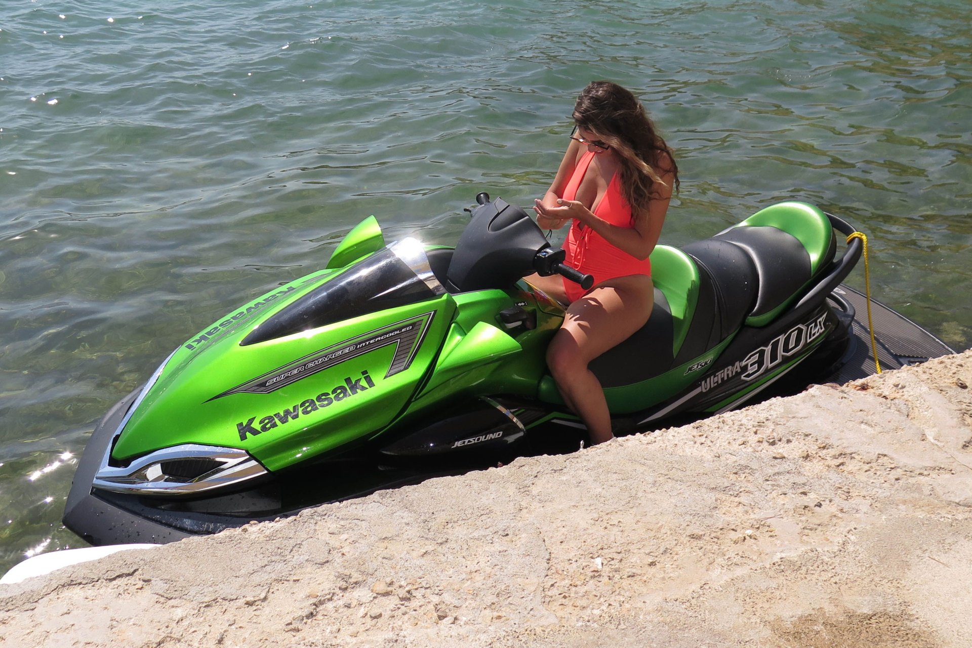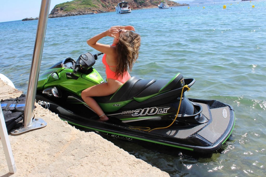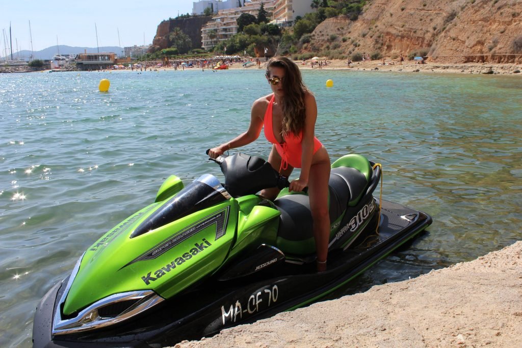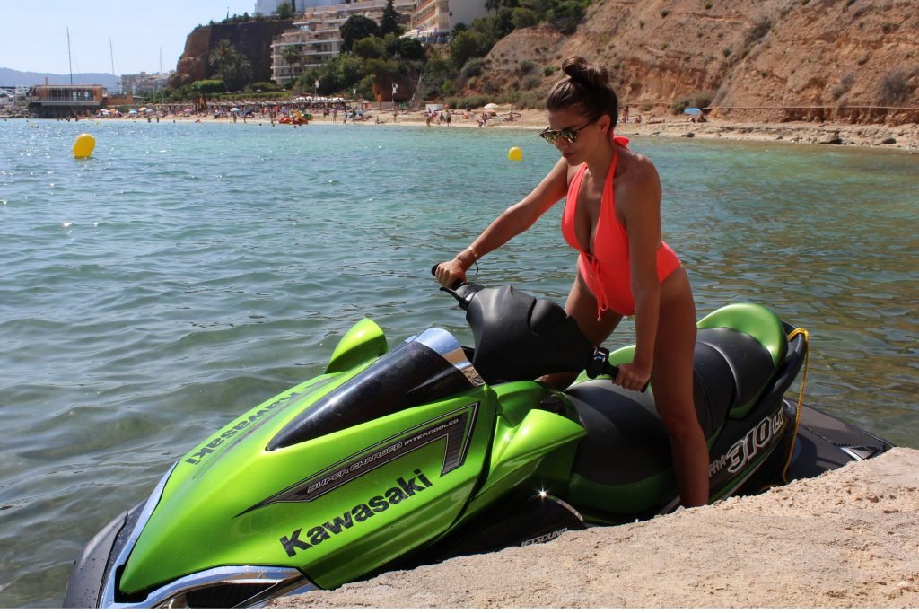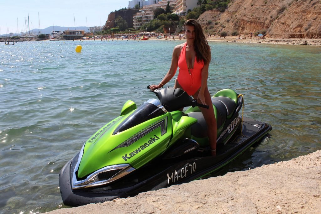 Imogen Thomas muestra sus curvas perfectas con un traje de baño mientras está en una moto acuática en España, 28/07/2017. Imogen Thomas es una modelo galesa. Edad – 34.