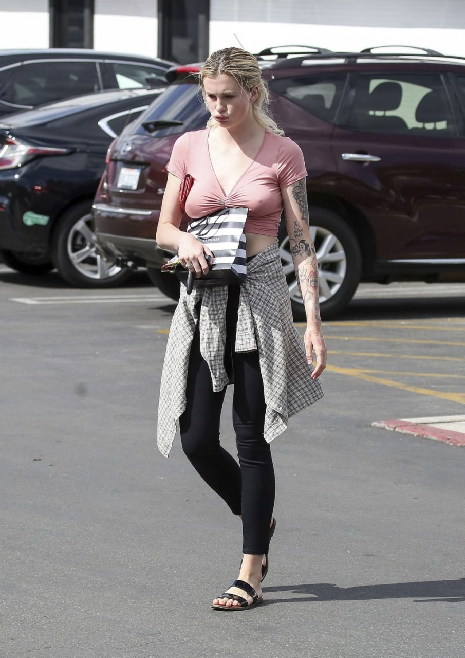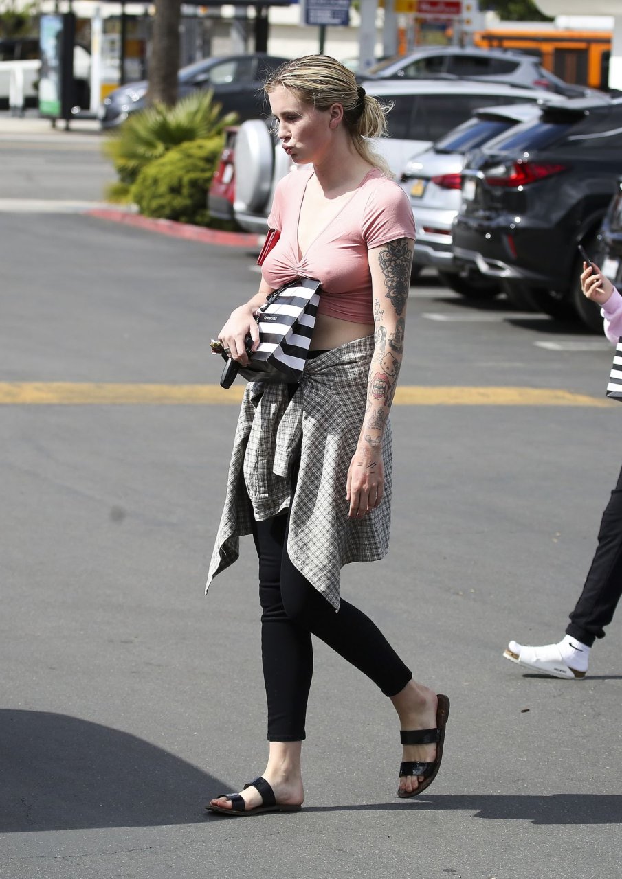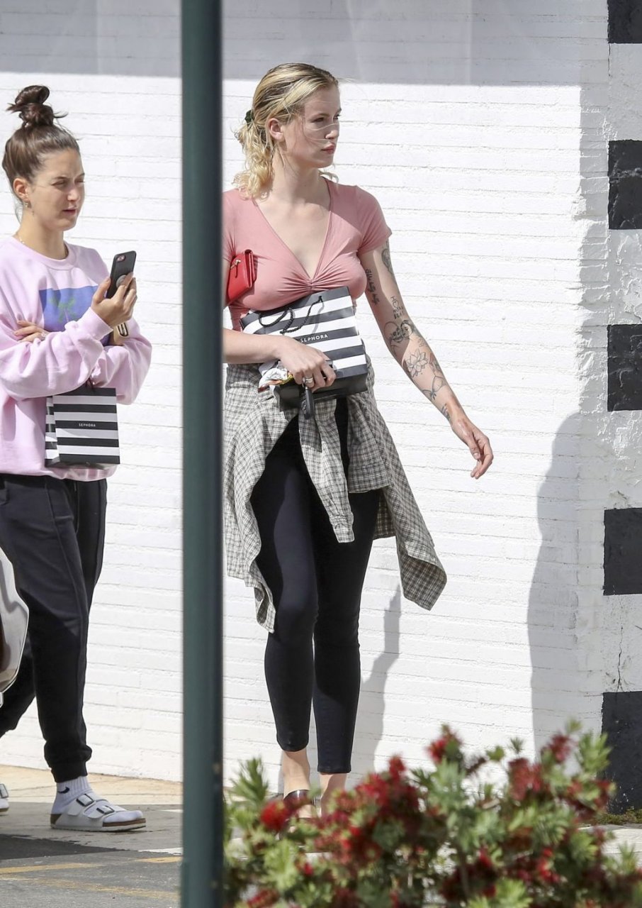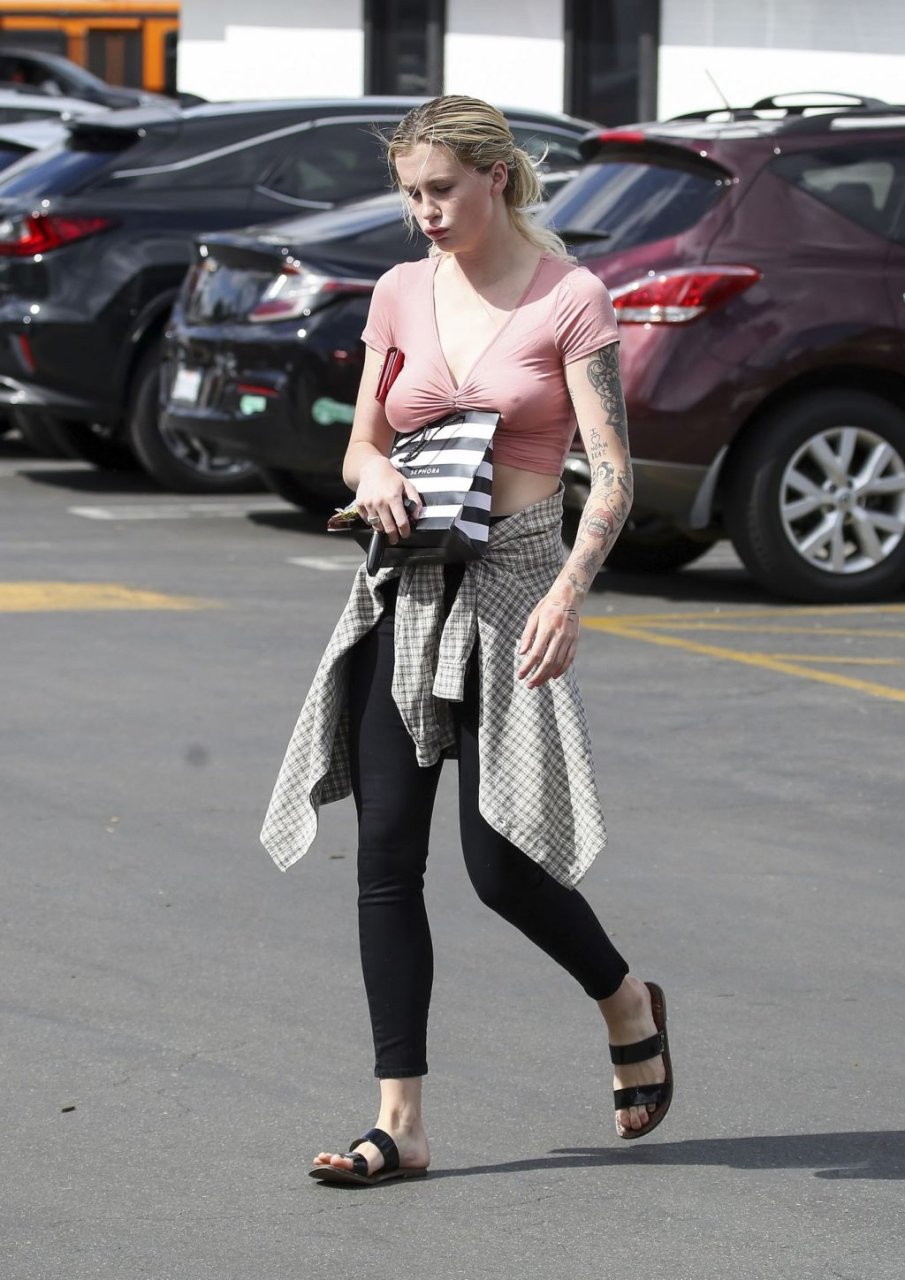 Modelo sin sujetador Ireland Baldwin es vista con una camiseta rosa mientras compra en Sephora en Los Ángeles, 17/05/2019.