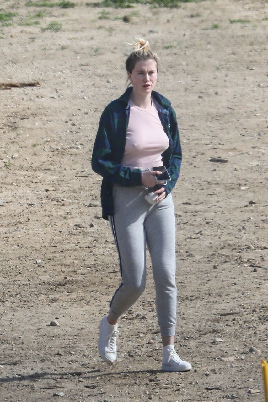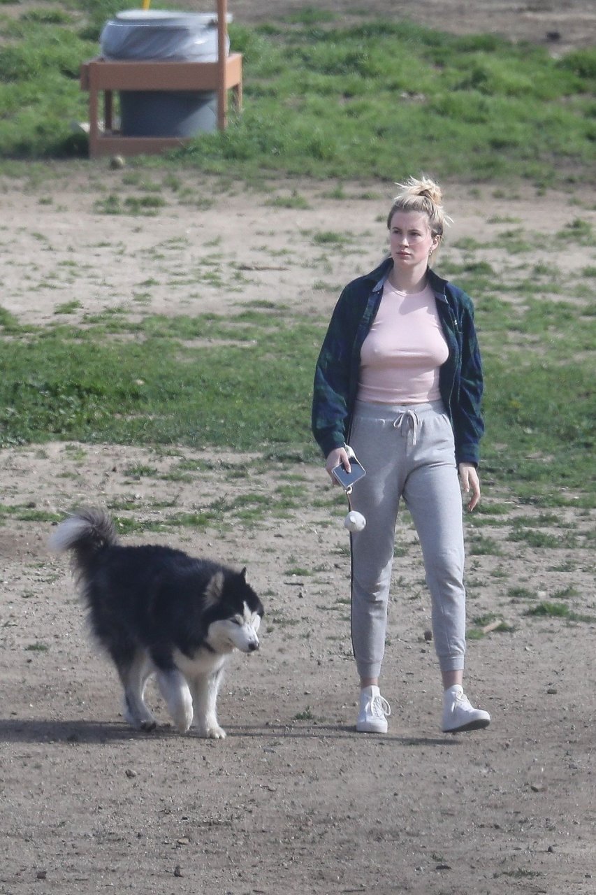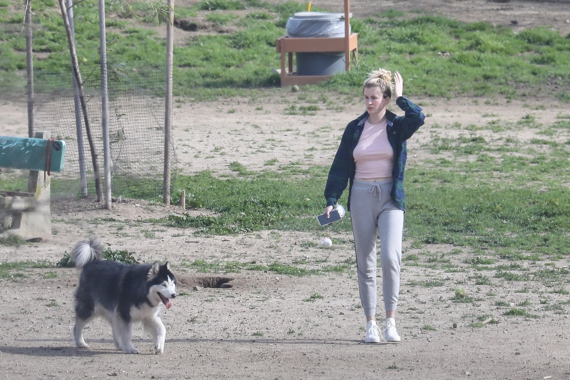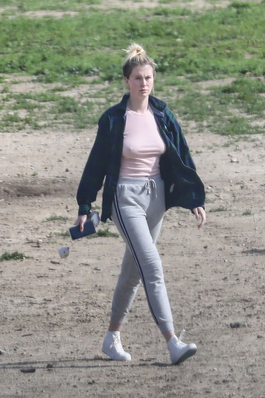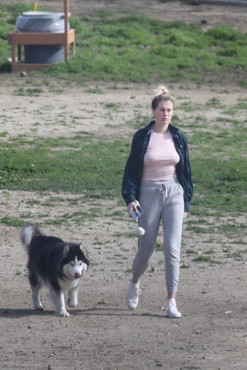 La modelo Ireland Baldwin está en Santa Mónica pasando tiempo con su perro, 10/03/2019. La modelo mantuvo un estilo muy casual mientras salía con pantalones de chándal, una camisa de franela y sin sostén!