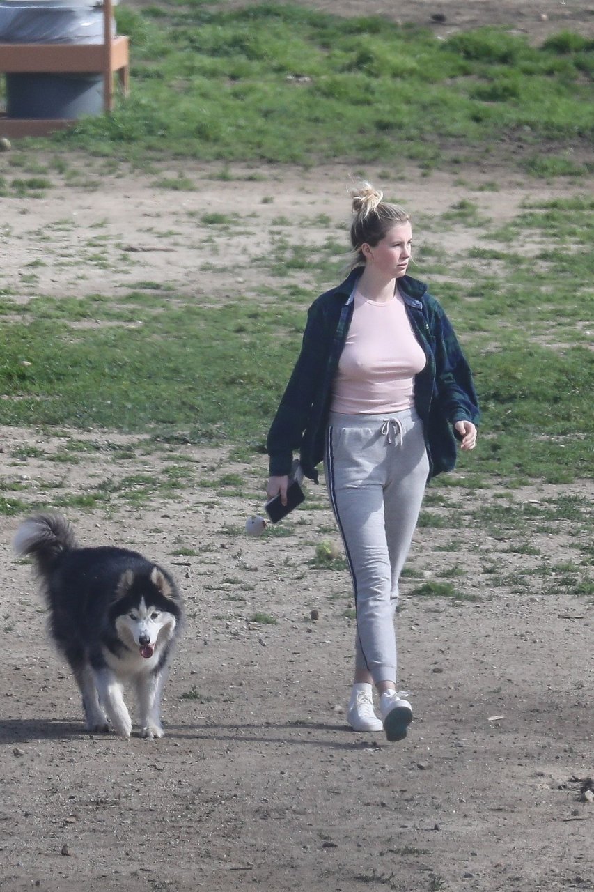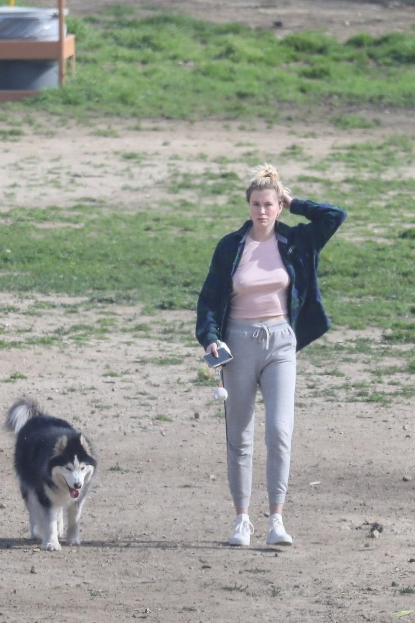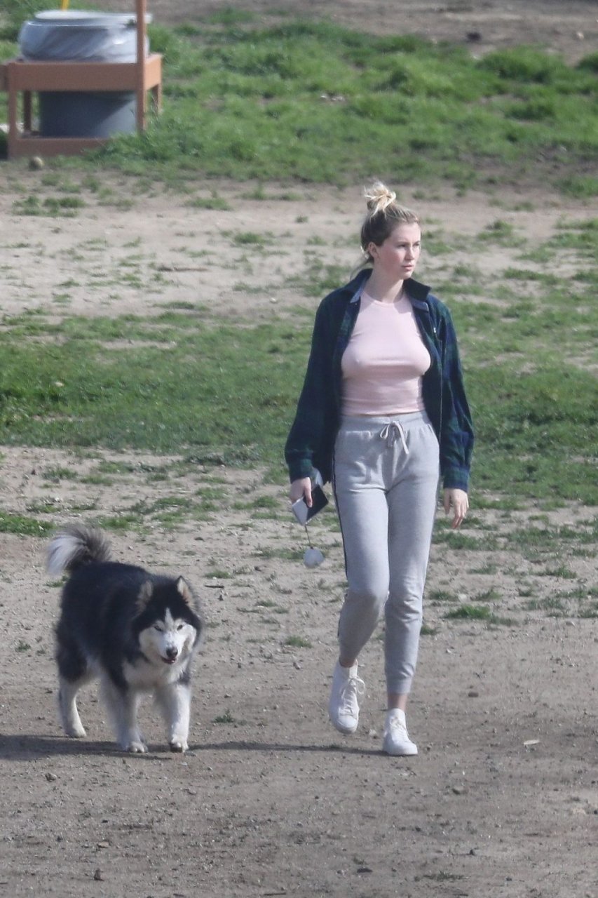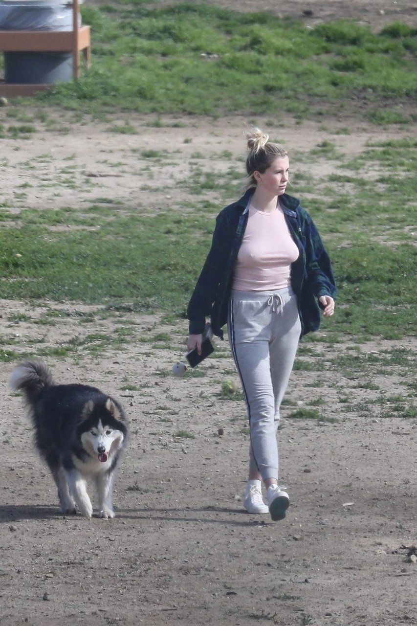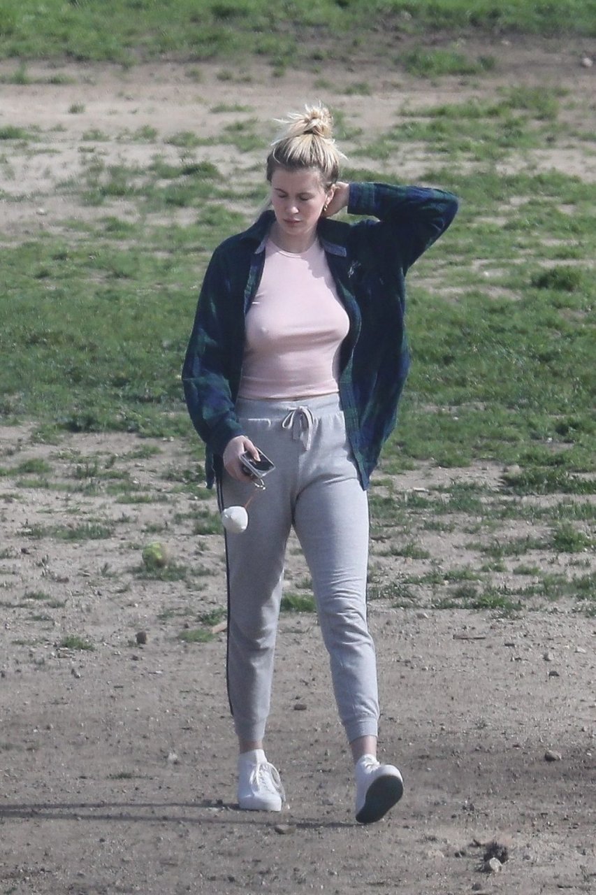 La modelo Ireland Baldwin está en Santa Mónica pasando tiempo con su perro, 10/03/2019. La modelo mantuvo un estilo muy casual mientras salía con pantalones de chándal, una camisa de franela y sin sostén!