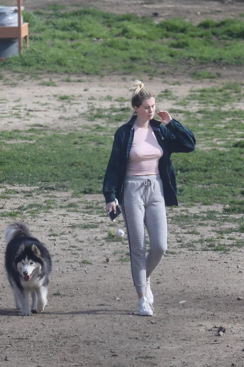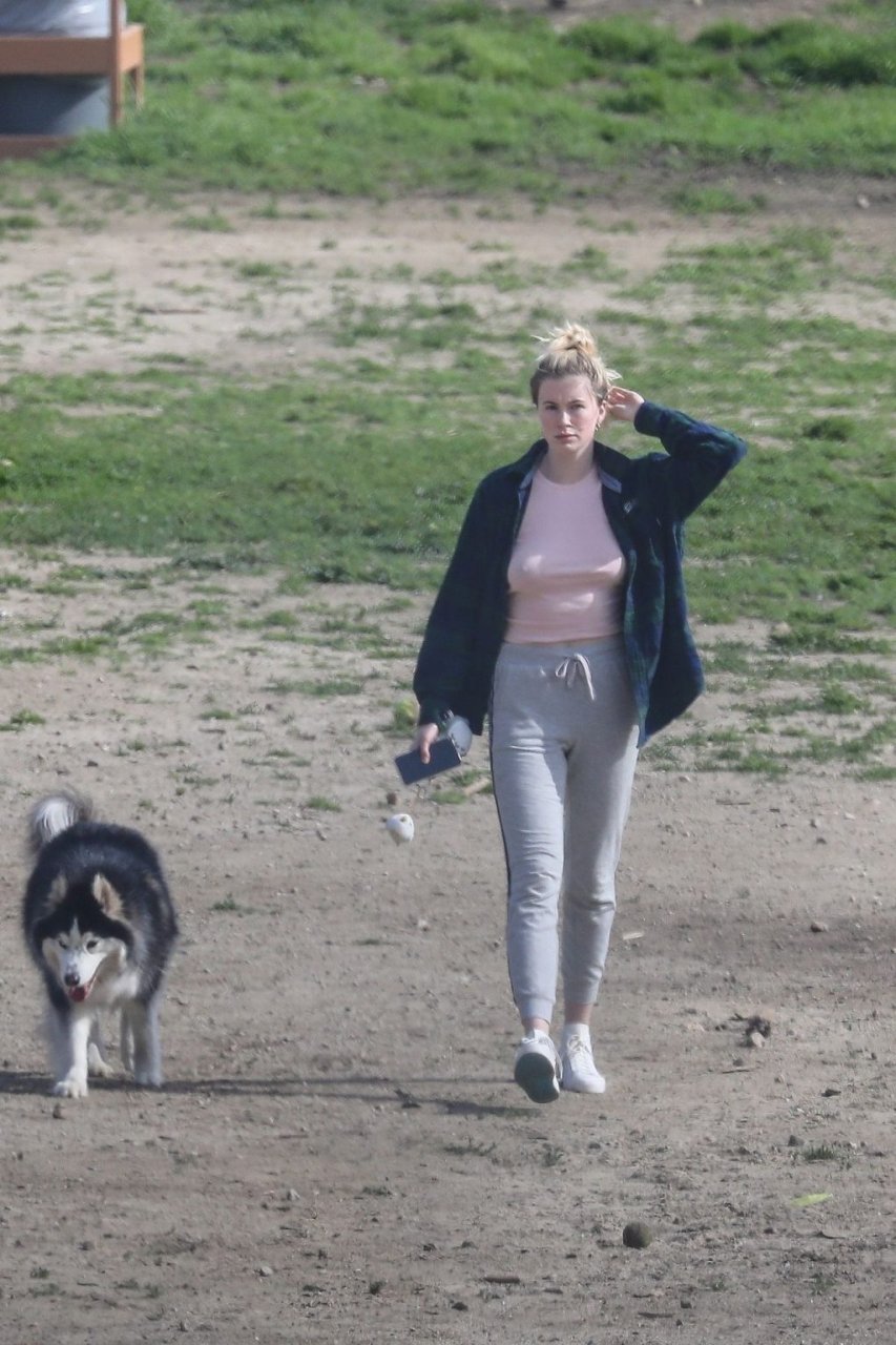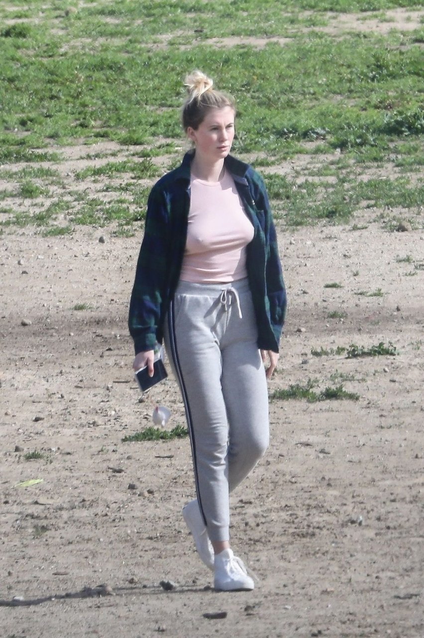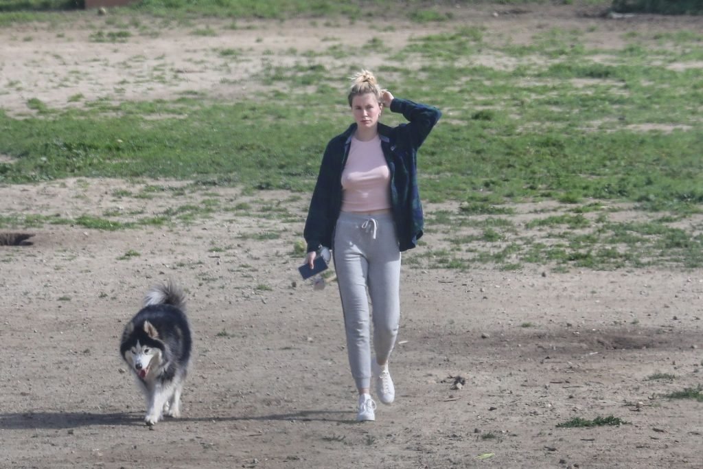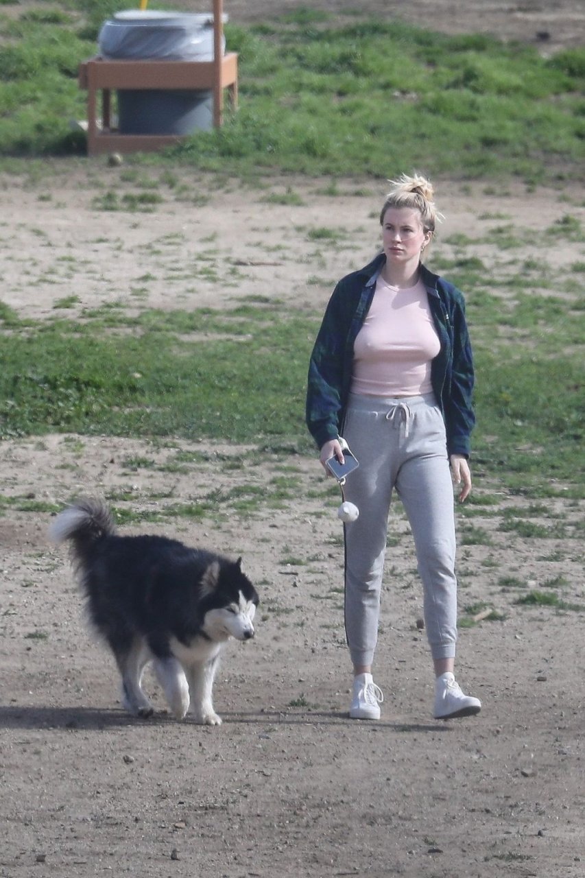 La modelo Ireland Baldwin está en Santa Mónica pasando tiempo con su perro, 10/03/2019. La modelo mantuvo un estilo muy casual mientras salía con pantalones de chándal, una camisa de franela y sin sostén!