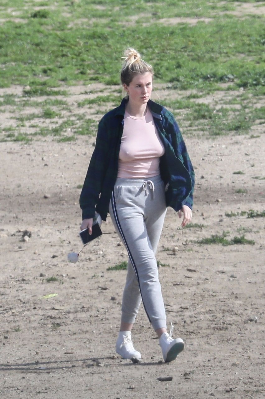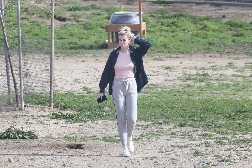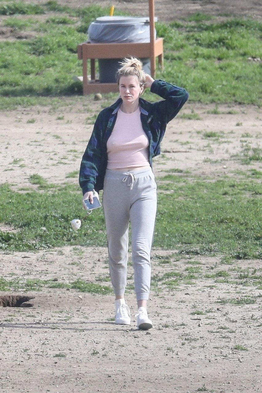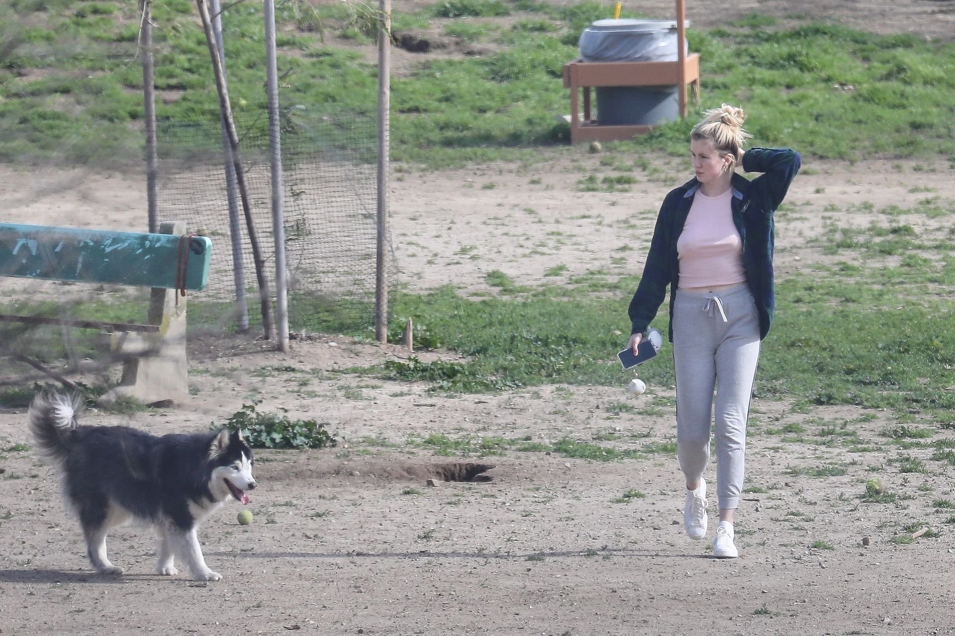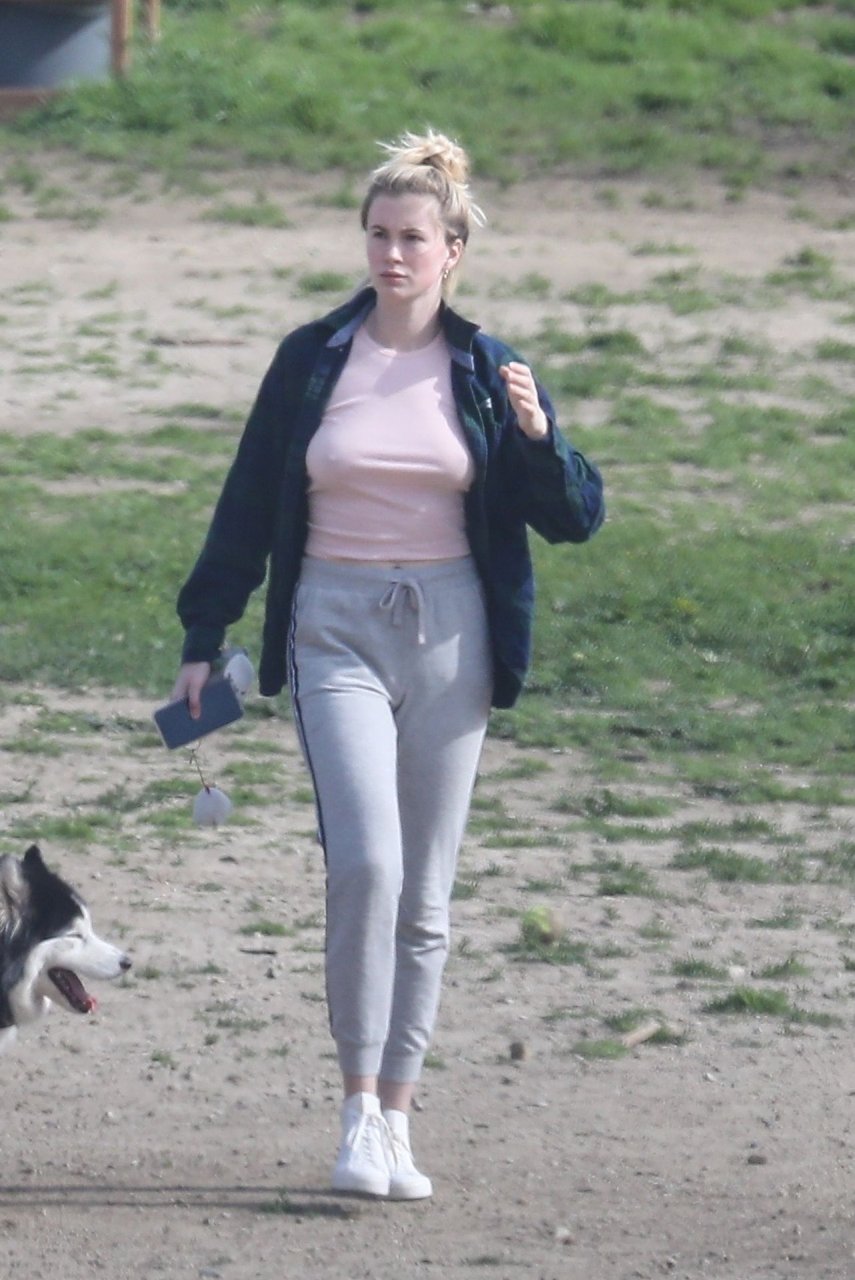 La modelo Ireland Baldwin está en Santa Mónica pasando tiempo con su perro, 10/03/2019. La modelo mantuvo un estilo muy casual mientras salía con pantalones de chándal, una camisa de franela y sin sostén!