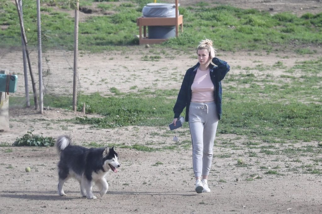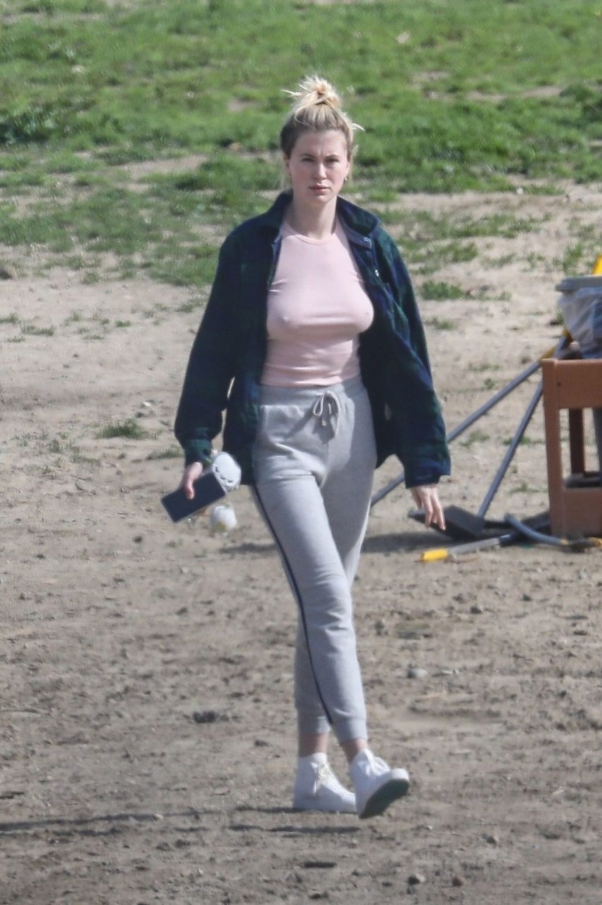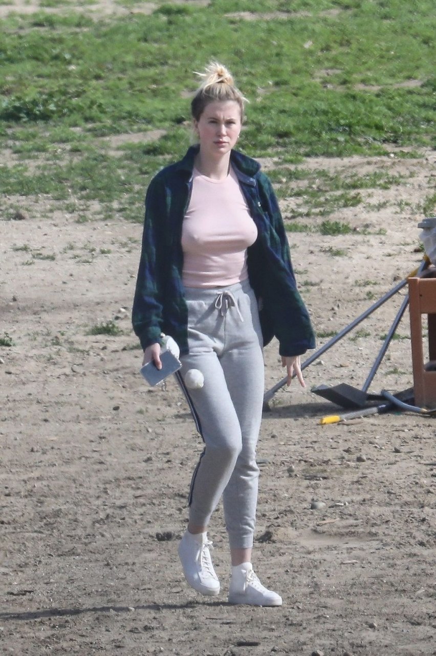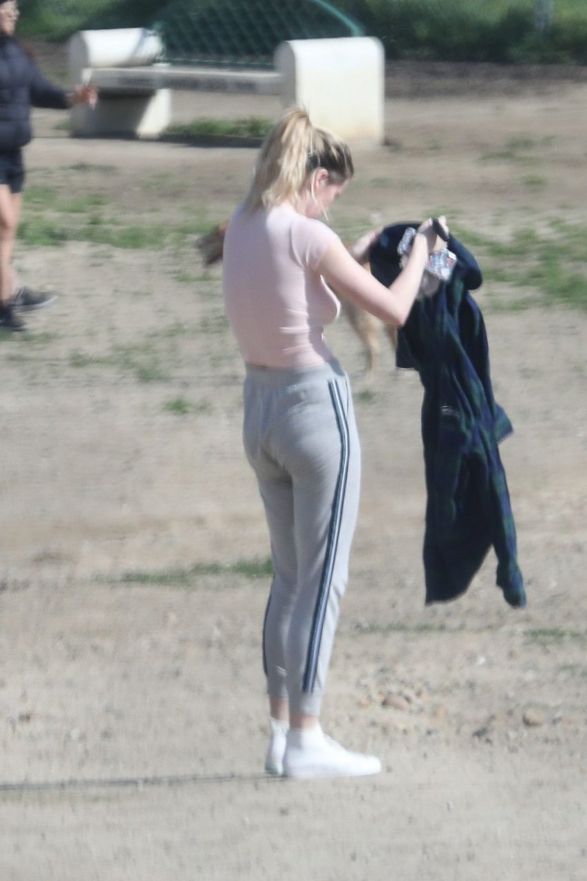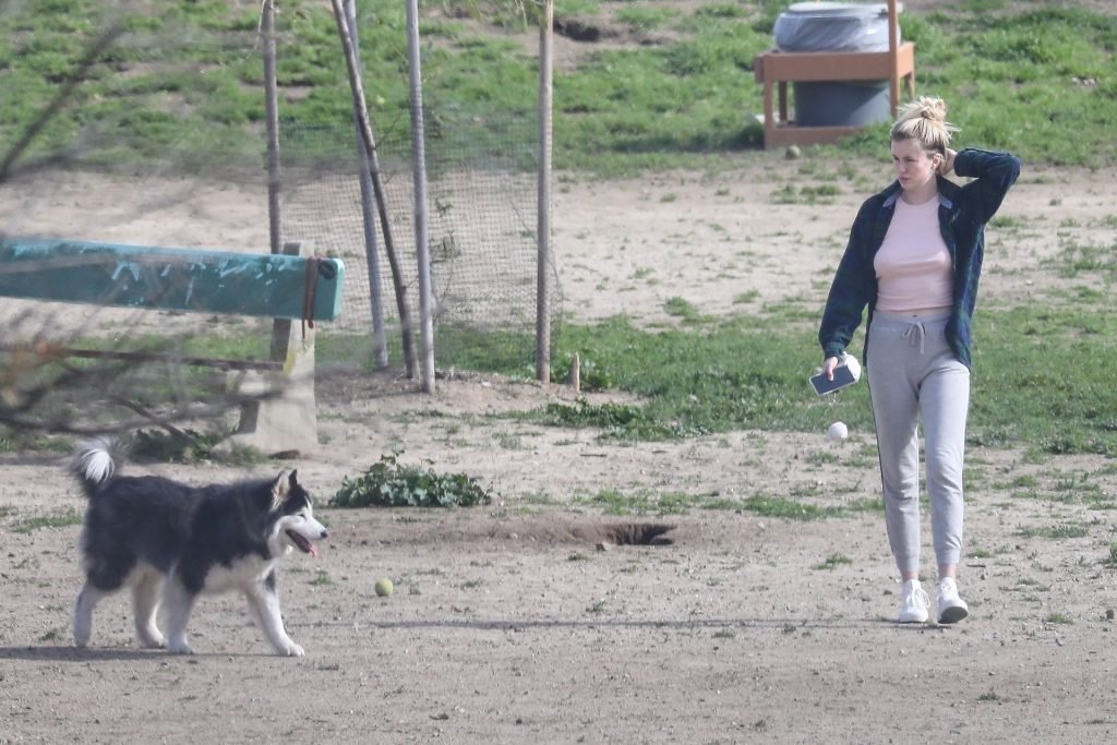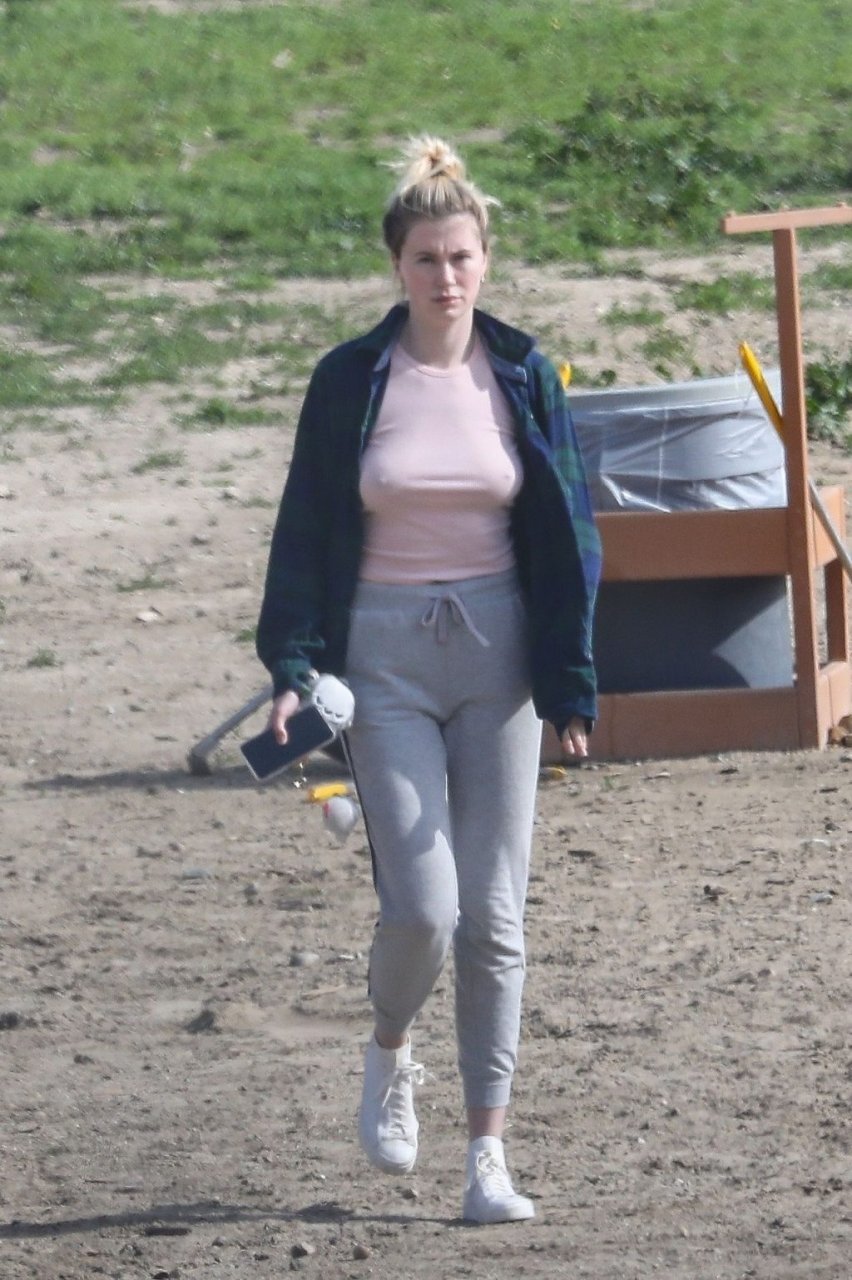 La modelo Ireland Baldwin está en Santa Mónica pasando tiempo con su perro, 10/03/2019. La modelo mantuvo un estilo muy casual mientras salía con pantalones de chándal, una camisa de franela y sin sostén!