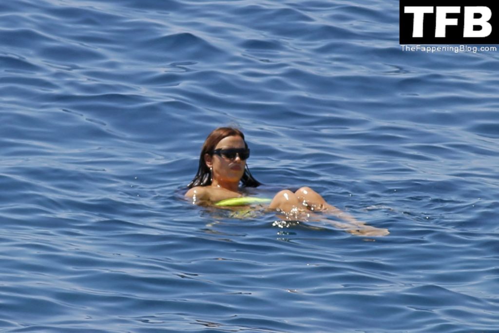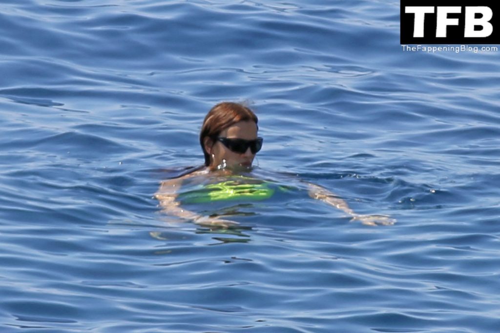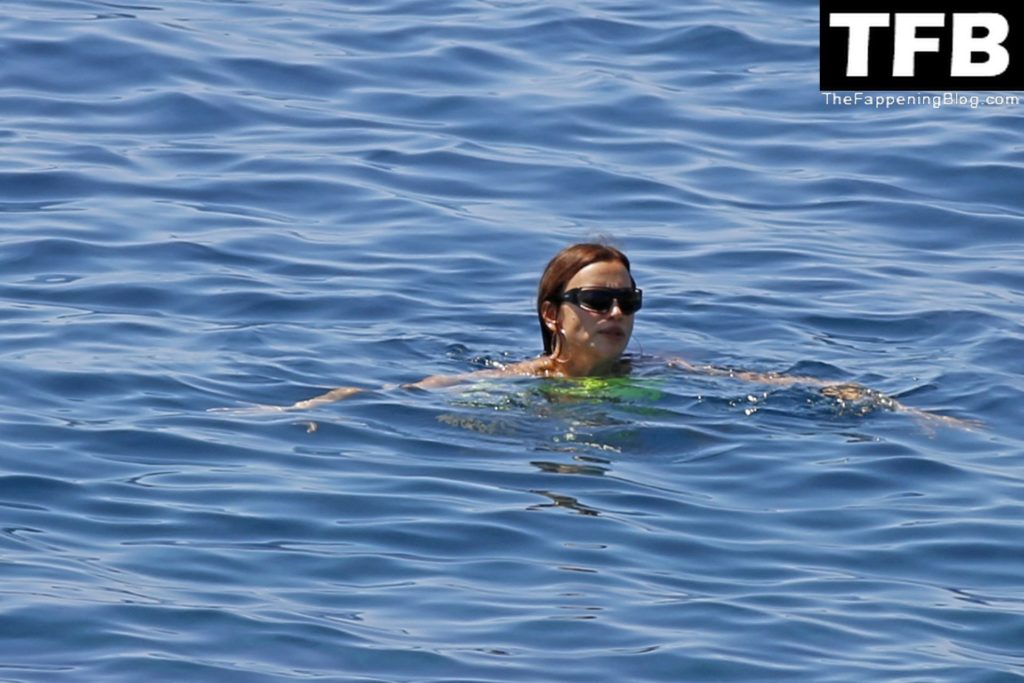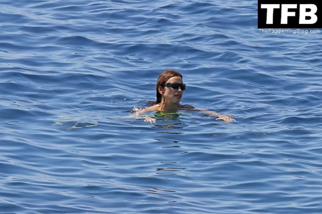 Irina Shayk se ve con un bikini verde en Ibiza mientras nada con un gran grupo de amigos que celebraban el cumpleaños del amigo Riccardo Tisci en el resort hotel Six Senses, 08/04/2022.