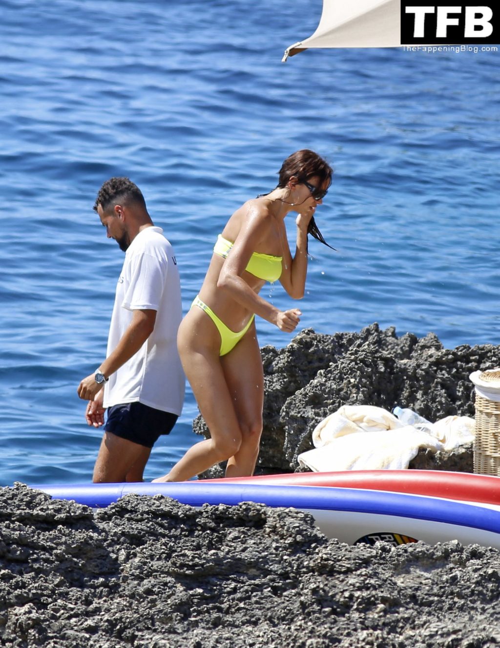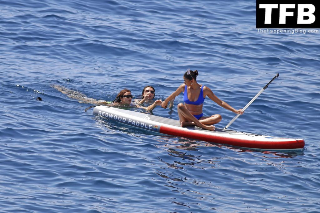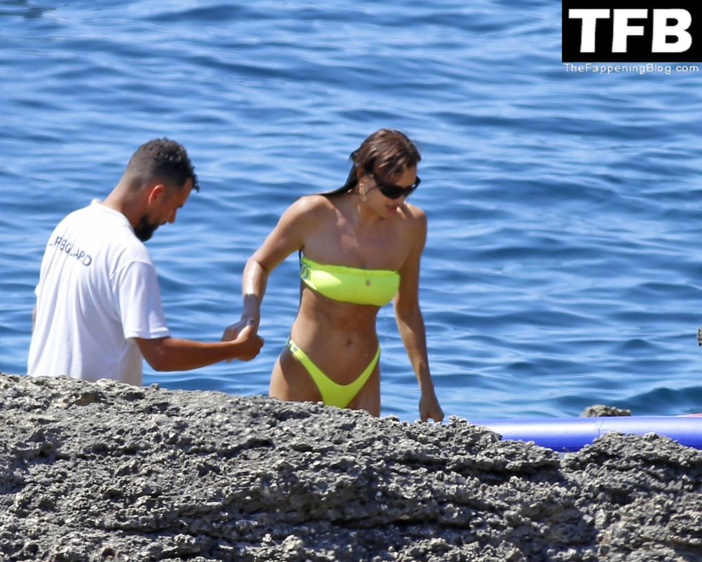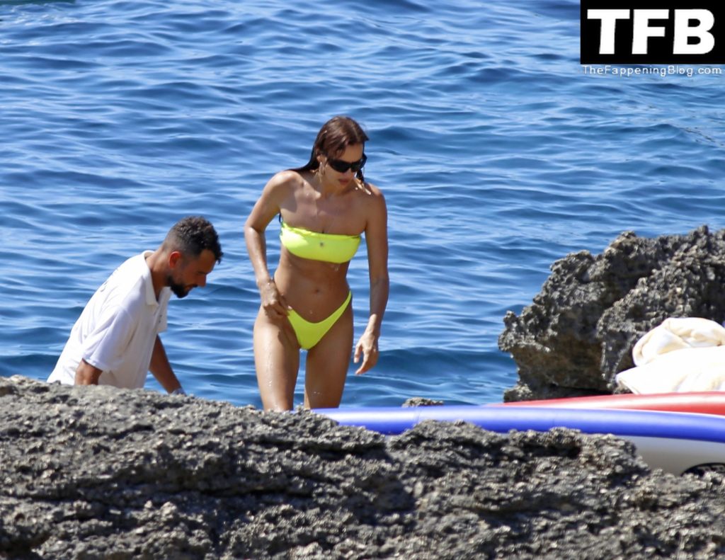 Irina Shayk se ve con un bikini verde en Ibiza mientras nada con un gran grupo de amigos que celebraban el cumpleaños del amigo Riccardo Tisci en el resort hotel Six Senses, 08/04/2022.