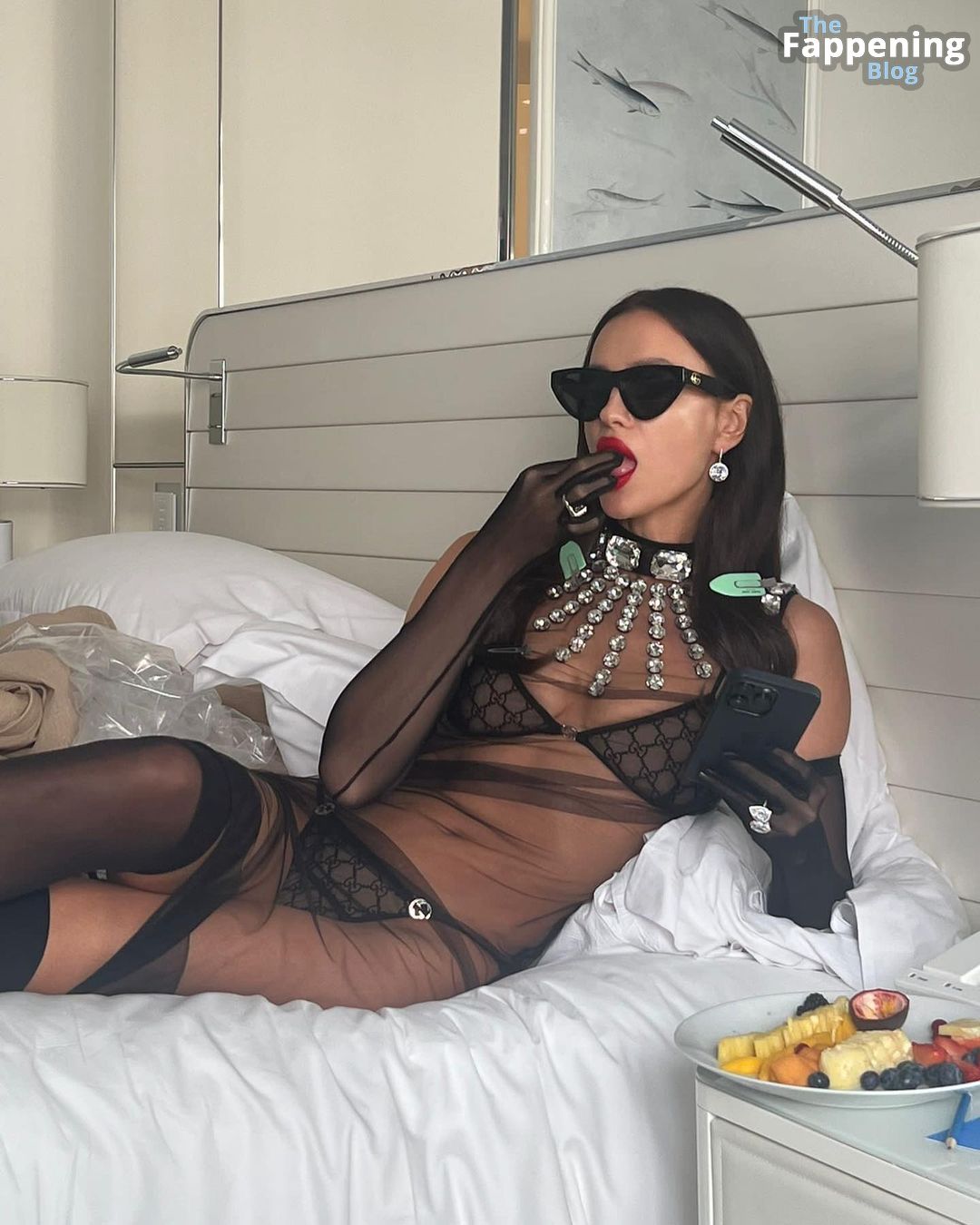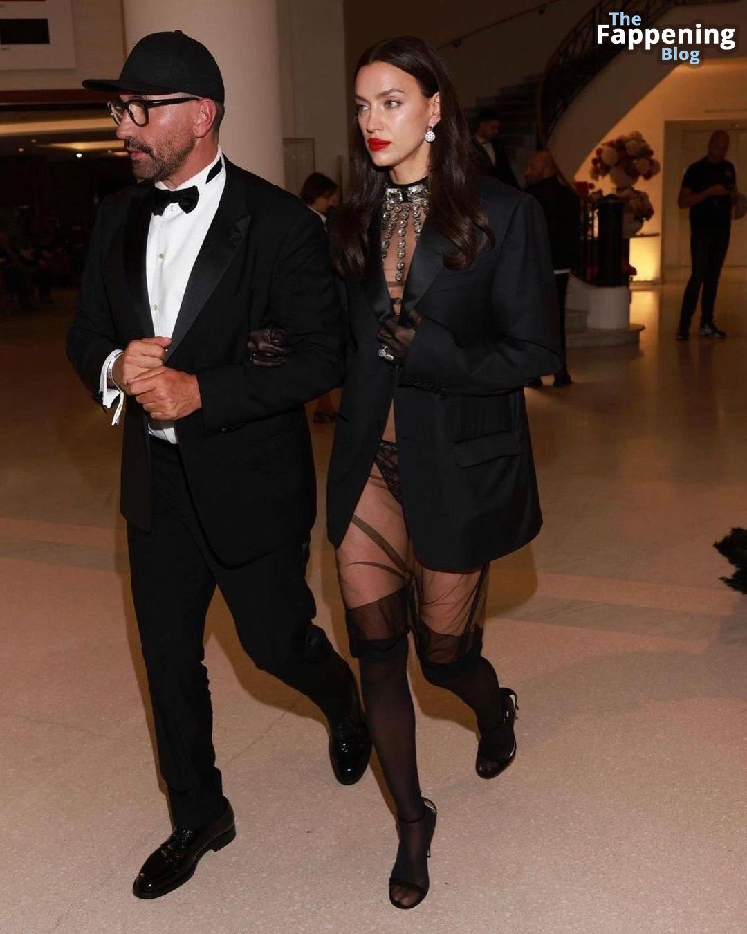 Shayk fue vista llegando al Hotel Martinez después de la proyección, luciendo ropa interior de Gucci que incluía un top de encaje y tanga, todo decorado con el famoso motivo GG de la casa de moda italiana. Pero eso no es todo: la superestrella combinó estos elementos con un abrigo completamente transparente, guantes de ópera de malla y medias sin dedos hasta la rodilla.